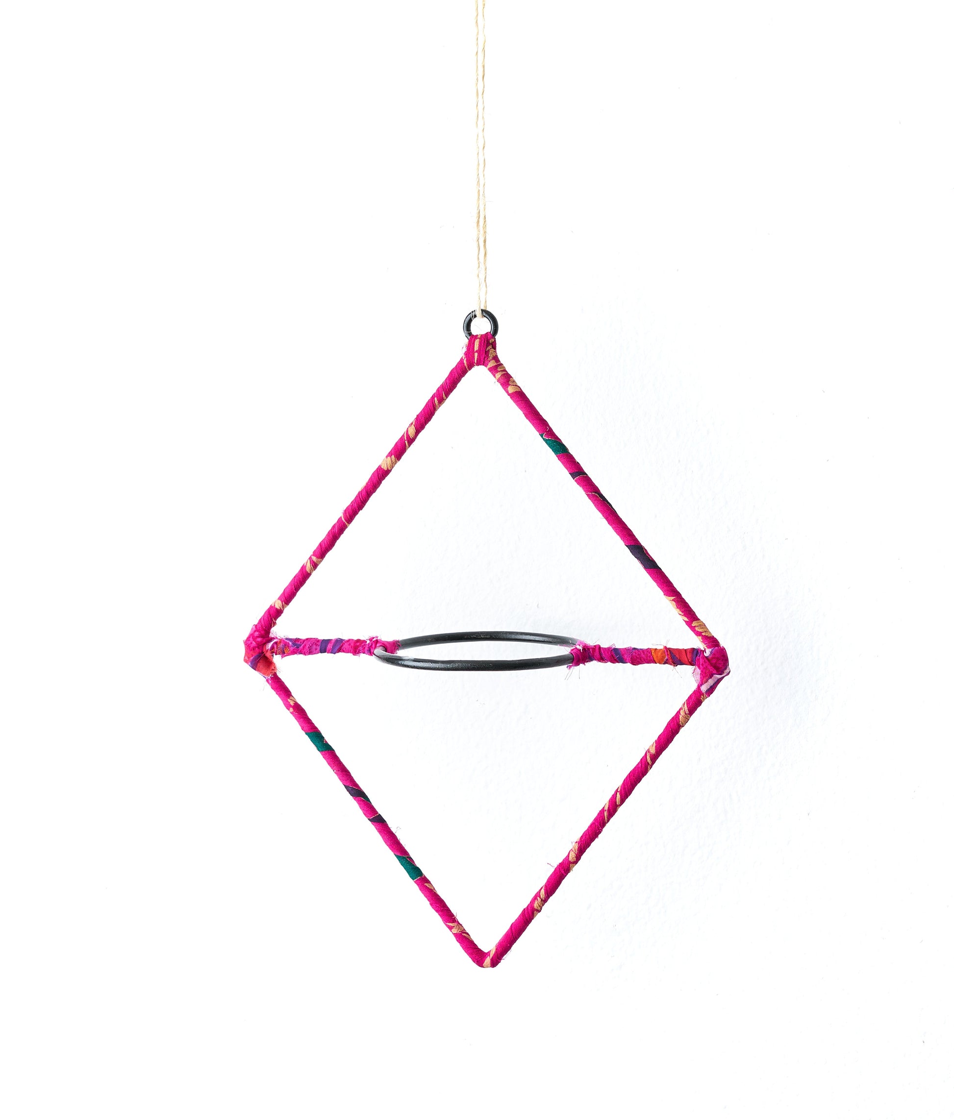 Our Sari Air Element Planter Collection incorporates age-old techniques of pottery and metalworking in modern, eco chic designs with a splash of vibrant color. Pottery is an age-old art from which has been passed down for generations in Rajasthan. Vibrant, upcycled sari accents provide for a one of a kind quality. Handcrafted hanging planter features small terracotta pot suspended in an airy diamond setting with assorted, upcycled sari wrapping. With drainage hole.