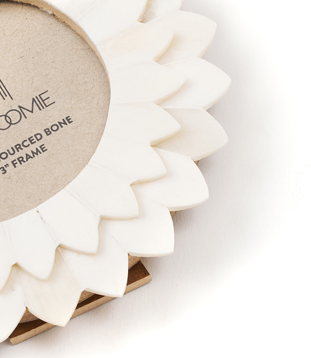 Handcrafted round photo frame features ethically sourced bone in a hand carved, 3D bloom design with a two-way table top easel and two d-rings for hanging.