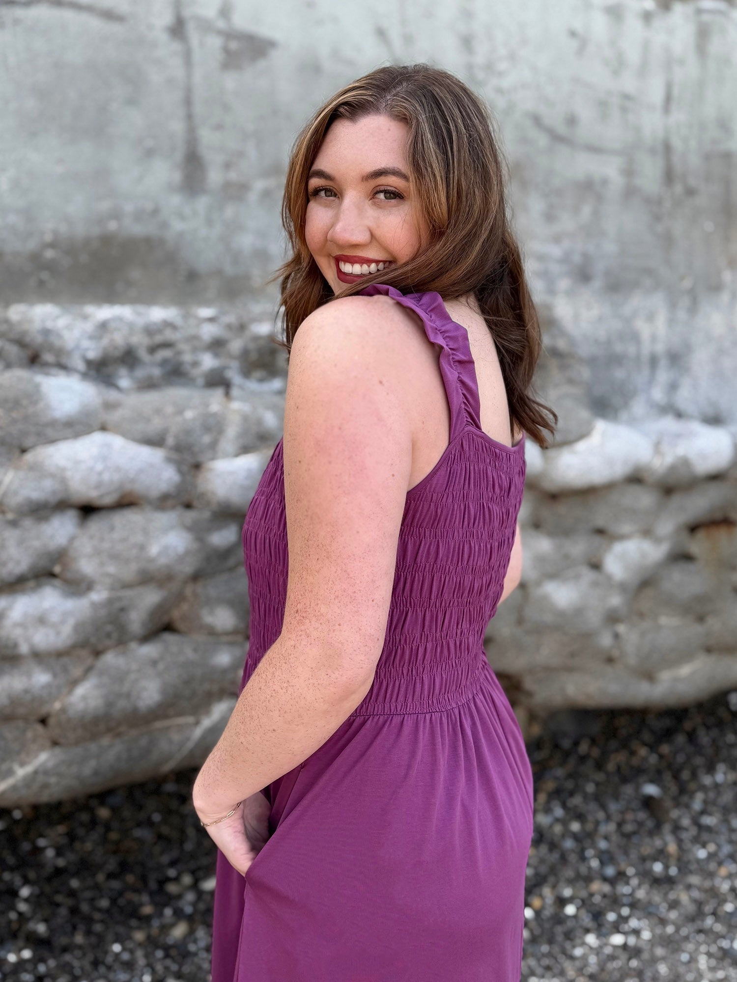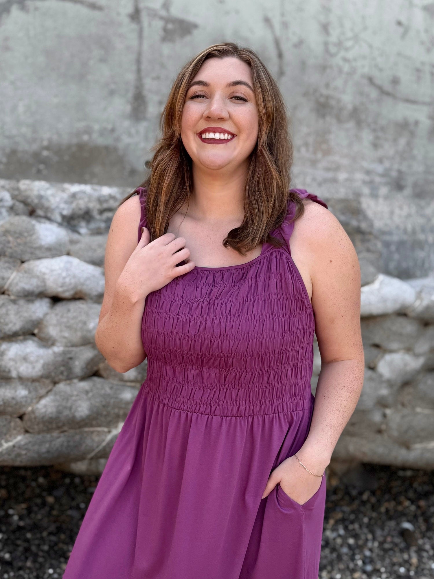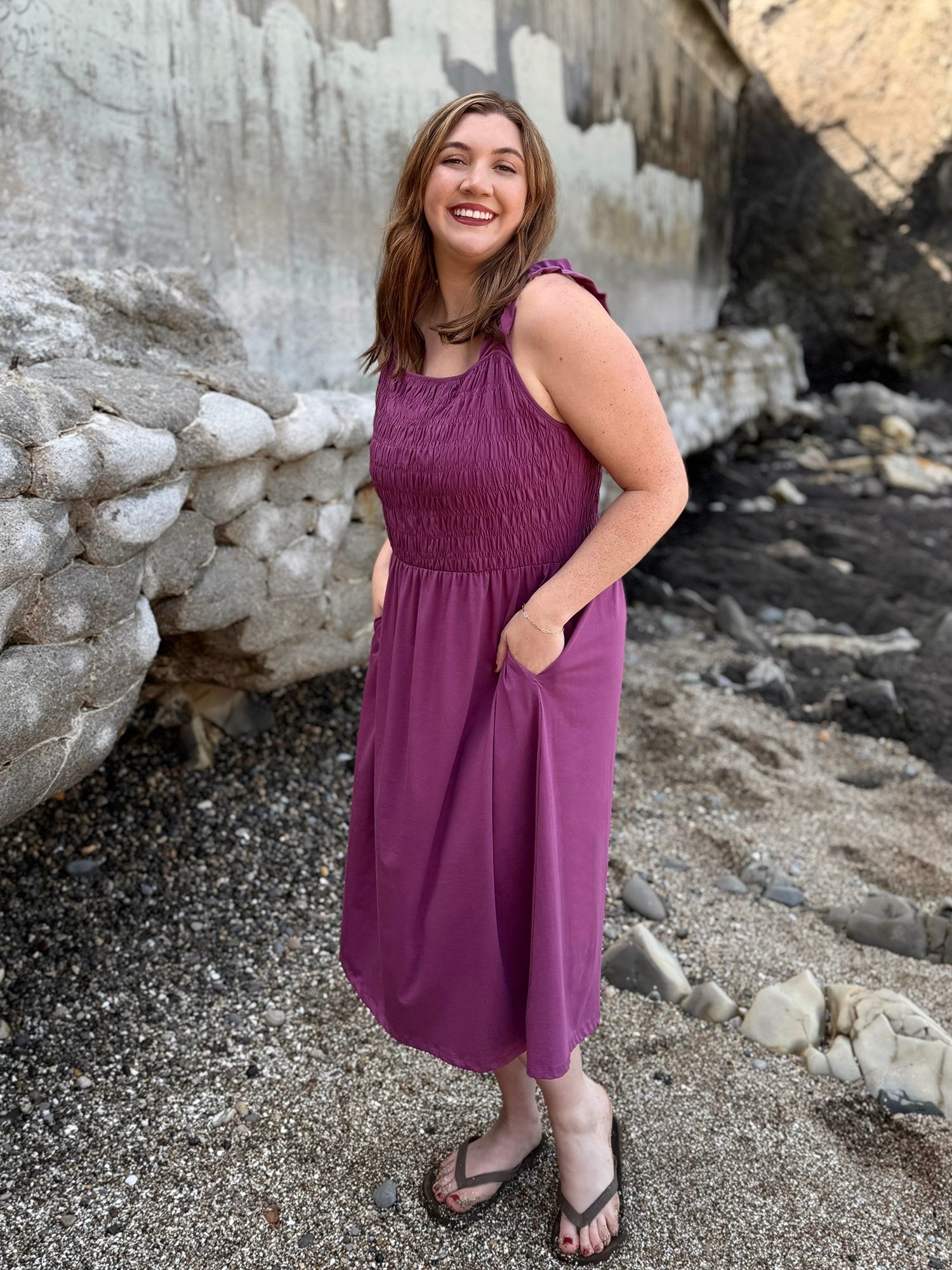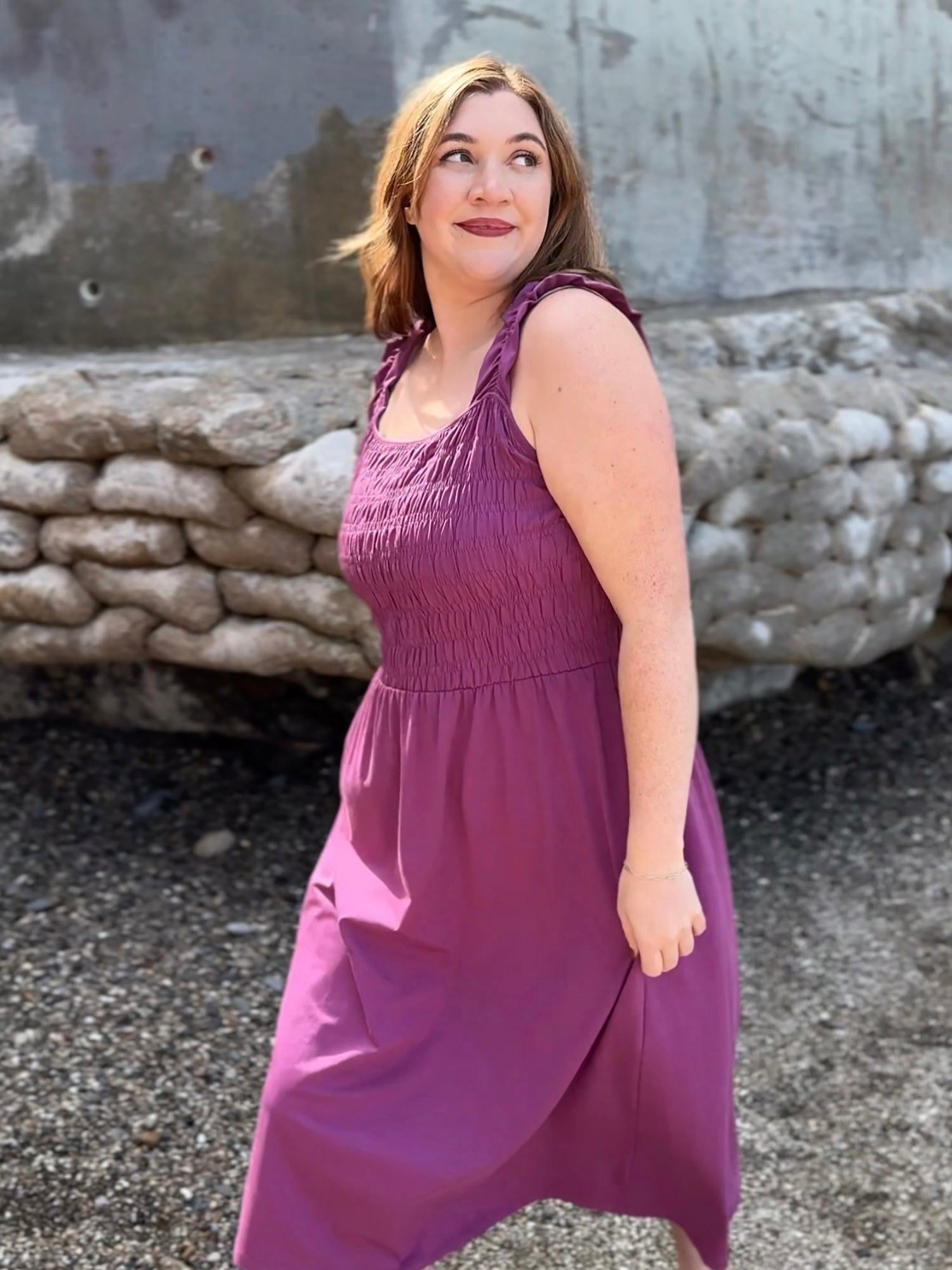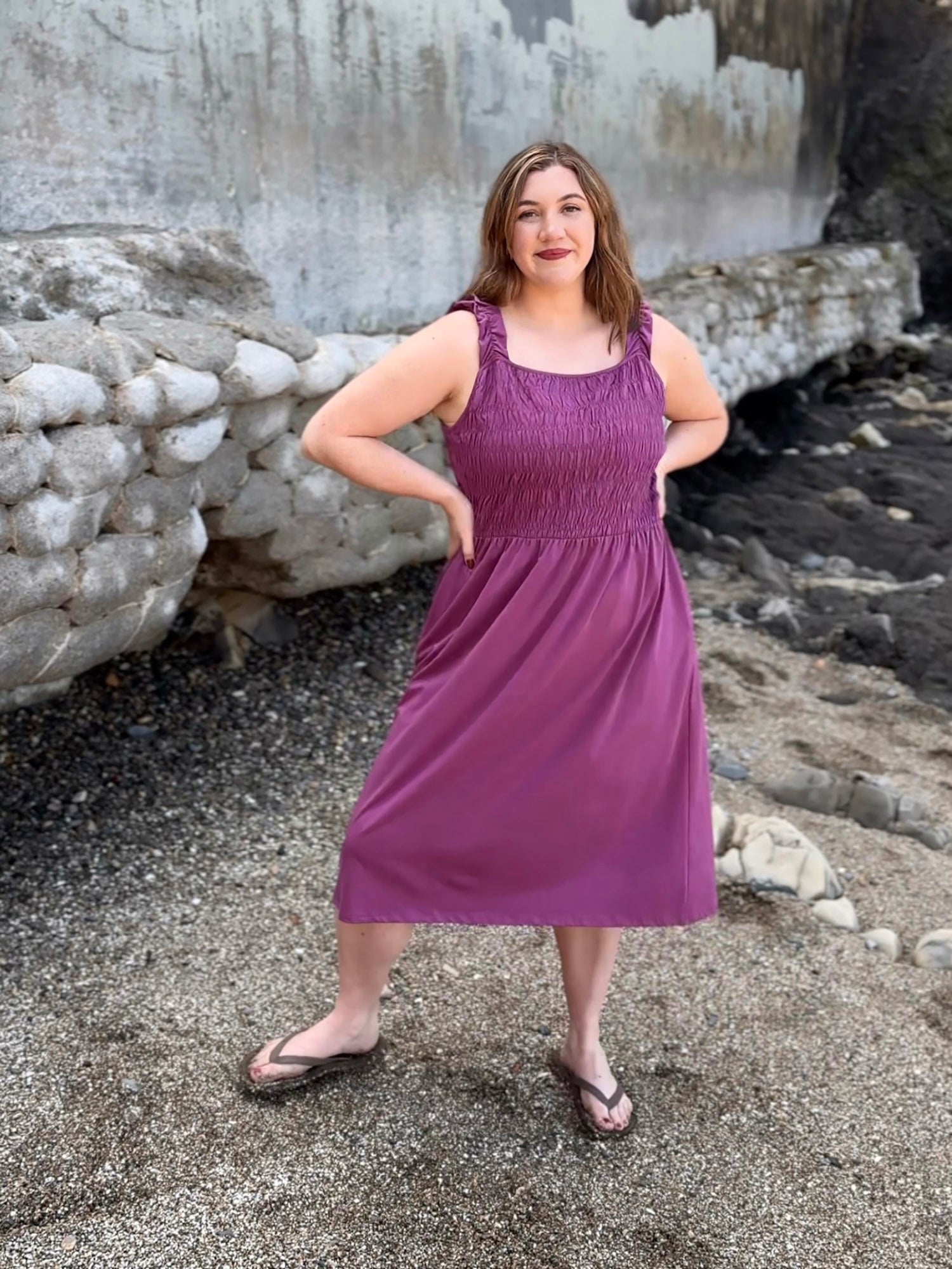 The smocking is completed by hand, and provides a texture that is forgiving to wear. Nursing friendly with stretchy shoulders. Completed to perfection with pockets. Length is about 44" from top of shoulder to hem.
