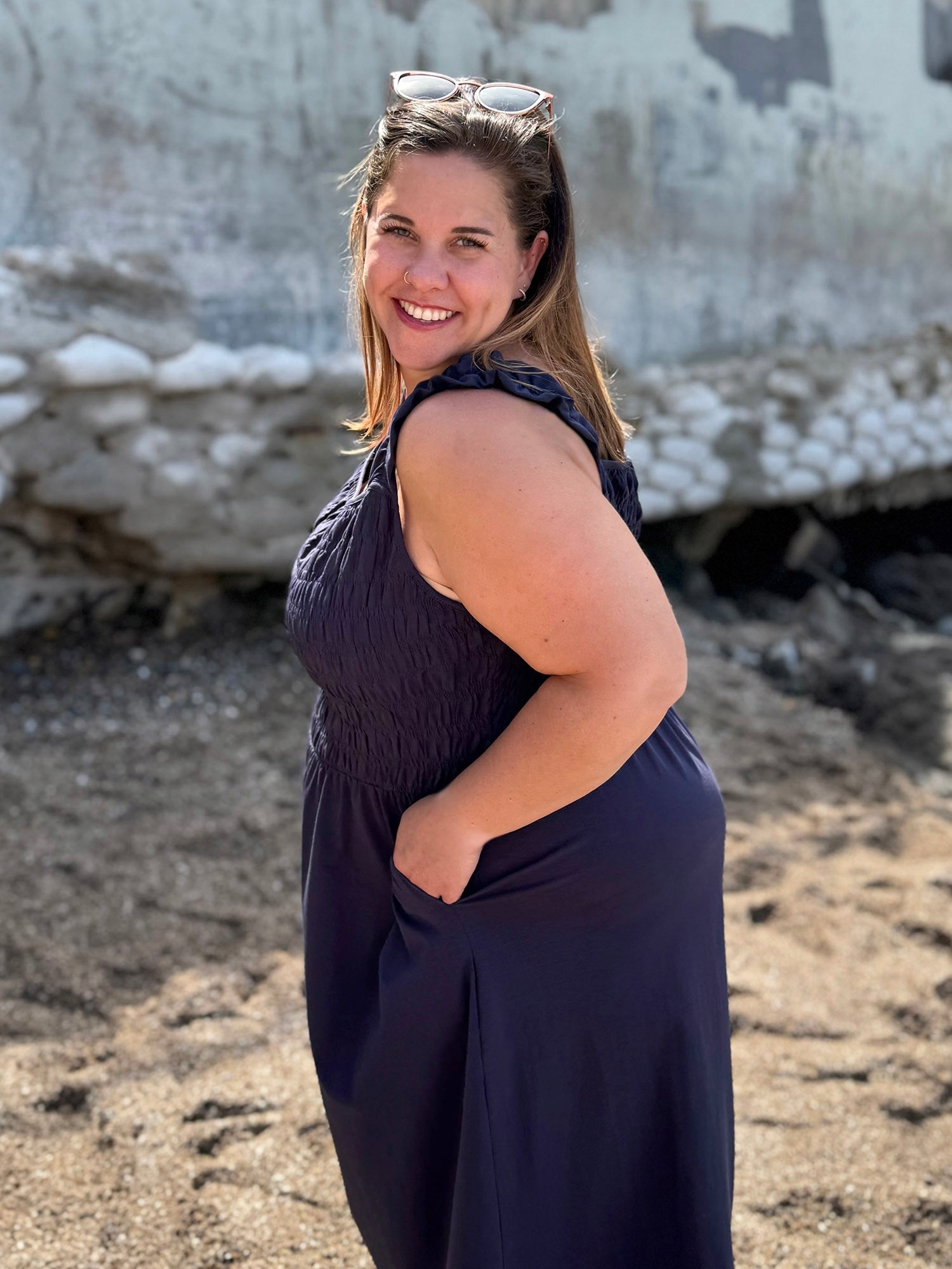 The smocking is completed by hand, and provides a texture that is forgiving to wear. Nursing friendly with stretchy shoulders. Completed to perfection with pockets. Length is about 44" from top of shoulder to hem.