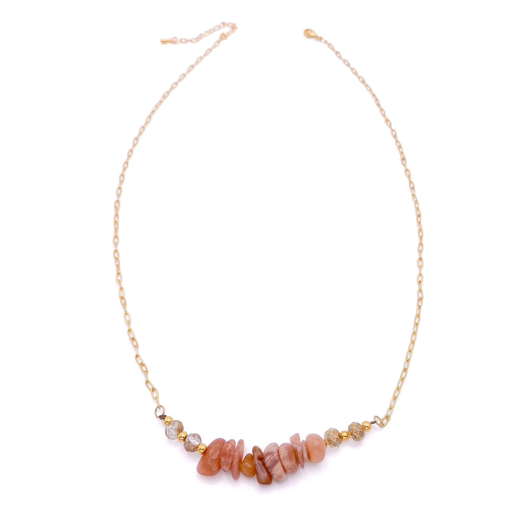 Sunstone chips, coppery translucent crystals and gold beads and paperclip chain bridges our warm summer into the warm colors of autumn.