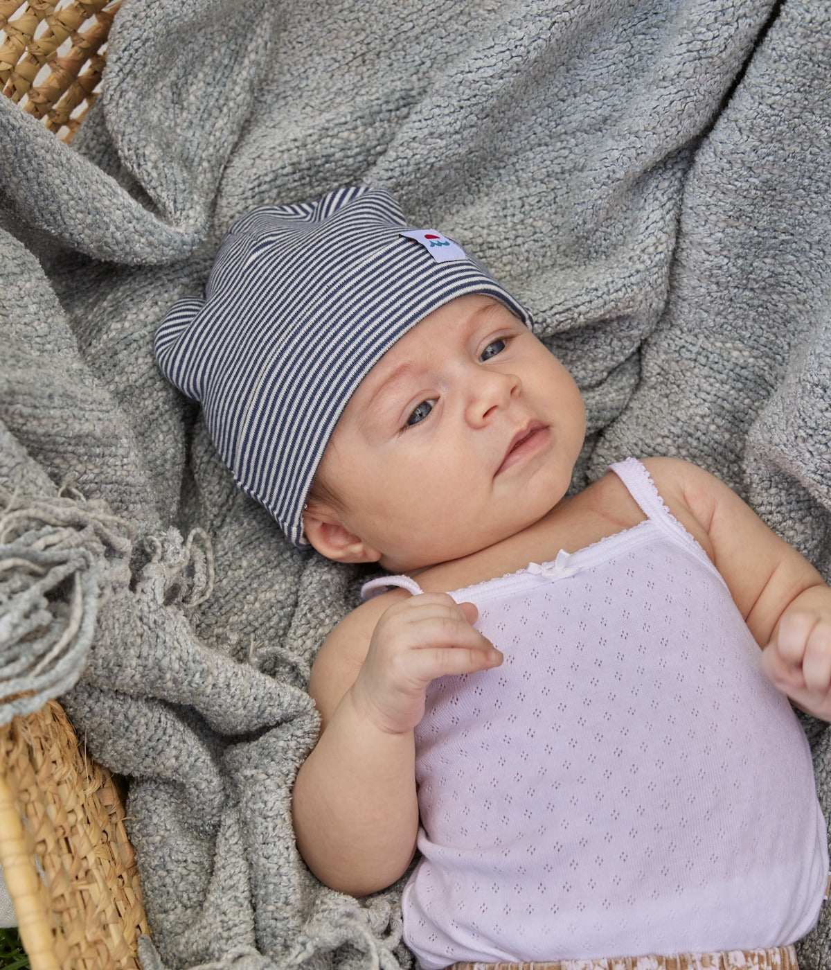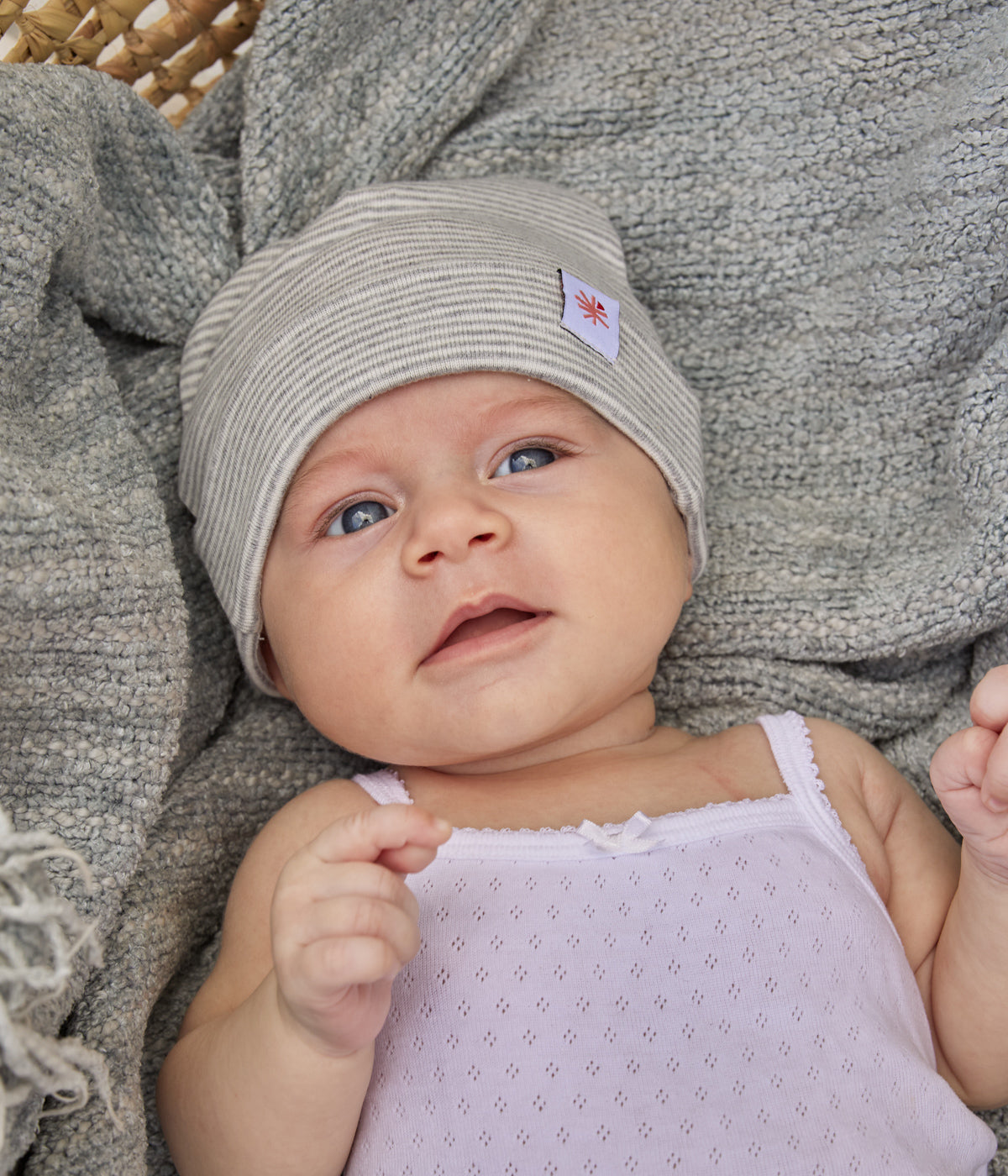 Our baby beanie is a lightweight, year-round hat made from organic cotton knit fabric. You can shop it as a matching set with our Baby Blanket as well!