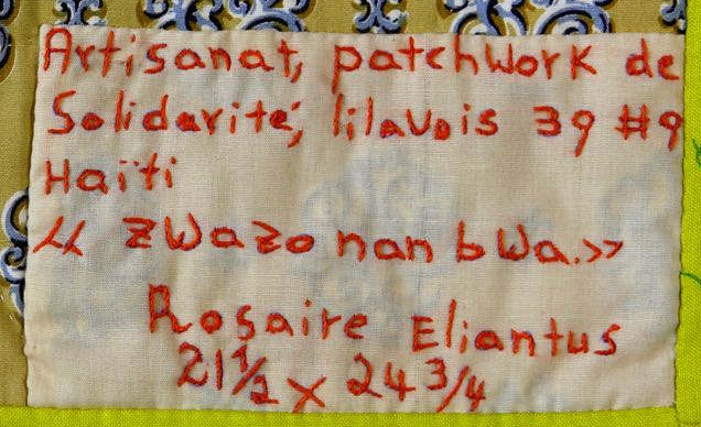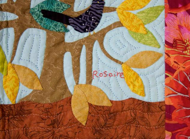 Delightful little birds flit through the trees as the artist dreams of a more carefree life. Roseaire Eliantus, premier artist and designer, has created this charming quilt of 100% cotton pieces, entirely hand-quilted and appliquéd embellished with beautiful embroidered details. Sleeve on the reverse for hanging. Signed by the artist. 22x25 inches. Purchase includes a complementary copy of exhibition catalogue Patience To Raise the Sun.
