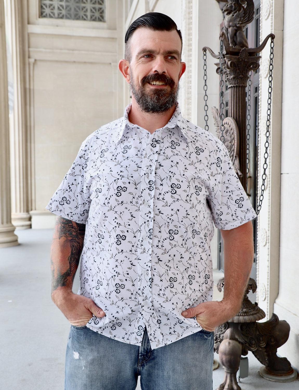 A short sleeve men's white floral button down shirt in a white and blue print on organic woven cotton. Gentle tapering at the waist with a straight and narrow profile and a broader fit in the shoulders gives this shirt the perfect fit.