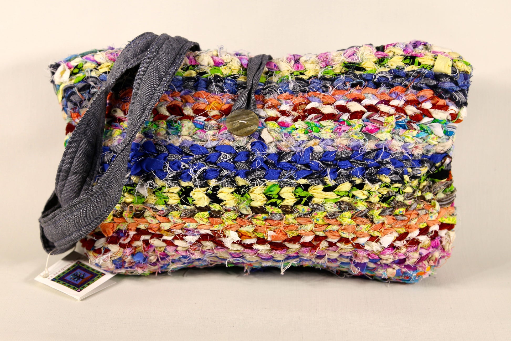 Fun and funky stylish bag made of upcycled fabric scraps! Each bag a unique mix of colors, lined in gray chambray cotton with 3 interior pockets. 14-inch drop straps. Handmade button. Approx 9"x12"