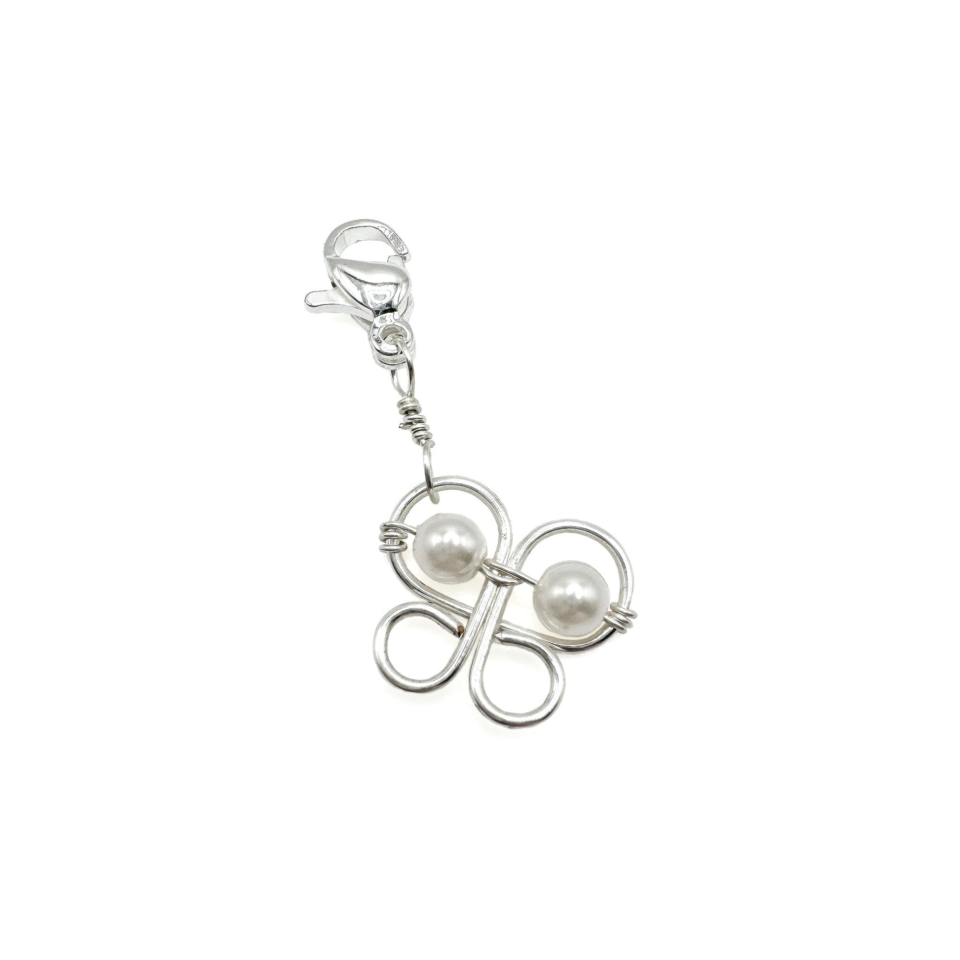 Add a reminder of new life and transformation with our hand crafted silver plated wire butterfly with 2 tiny majorca pearl accents in her wings. Fasten the securely wire wrapped clasp to your favorite charm bracelet or charm necklace.