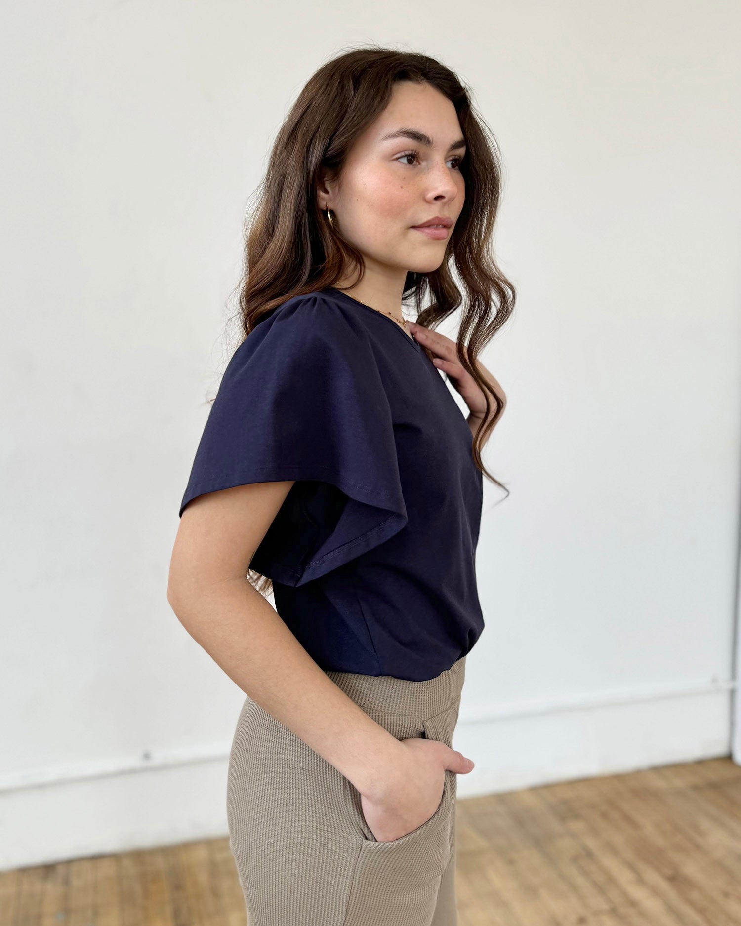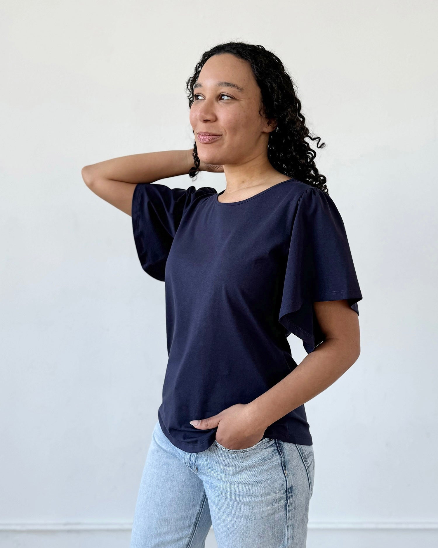 A basic tee with details that make it special. A surprise keyhole in the back and sweet flutter sleeves. Curved hem.
