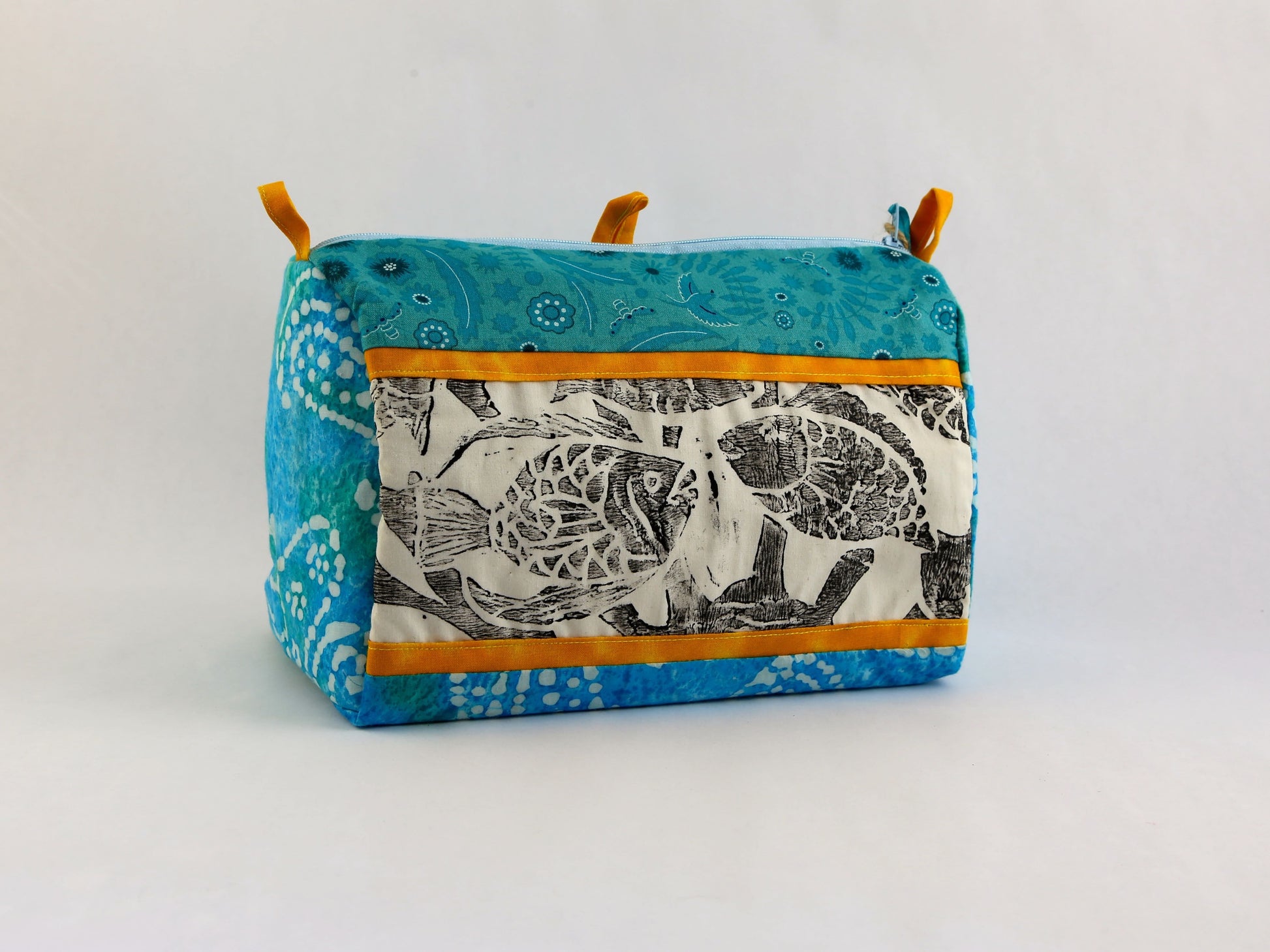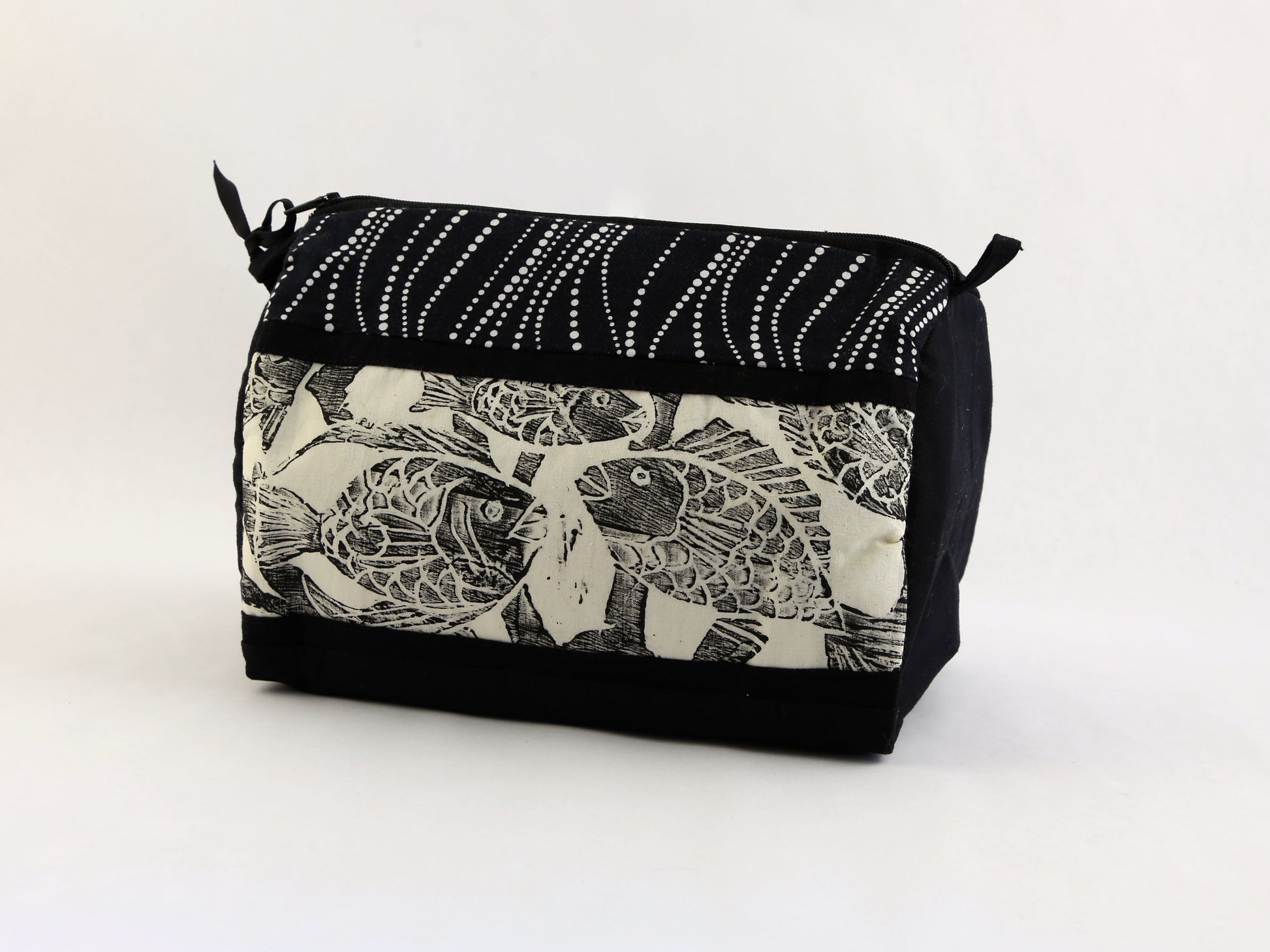 Carry all your essentials in this roomy and beautiful cosmetic/toiletries bag, embellished with a hand-pulled fish block print. 9L x 5.5W x 6.5H inches. Lined. Loops for hanging. Each bag is uniquely handmade by an artisan so specific fabrics may vary within a color group. 100% cotton.