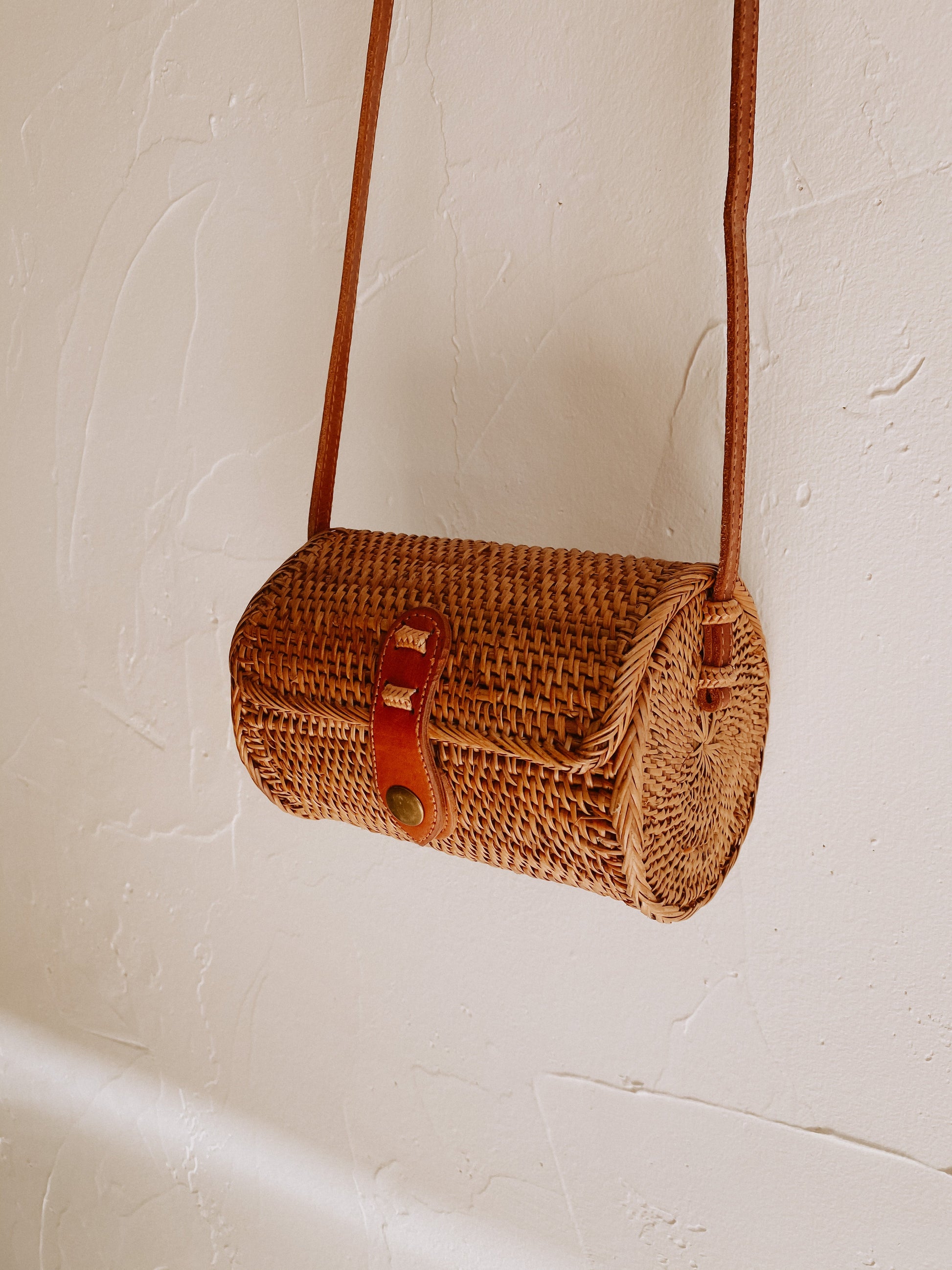 Dress it up or dress it down. This natural rattan purse may just be your new favorite accessory. Handmade in Bali, features include: circle body shape, leather strap with metal snap closure, and lined with traditional batik fabric.