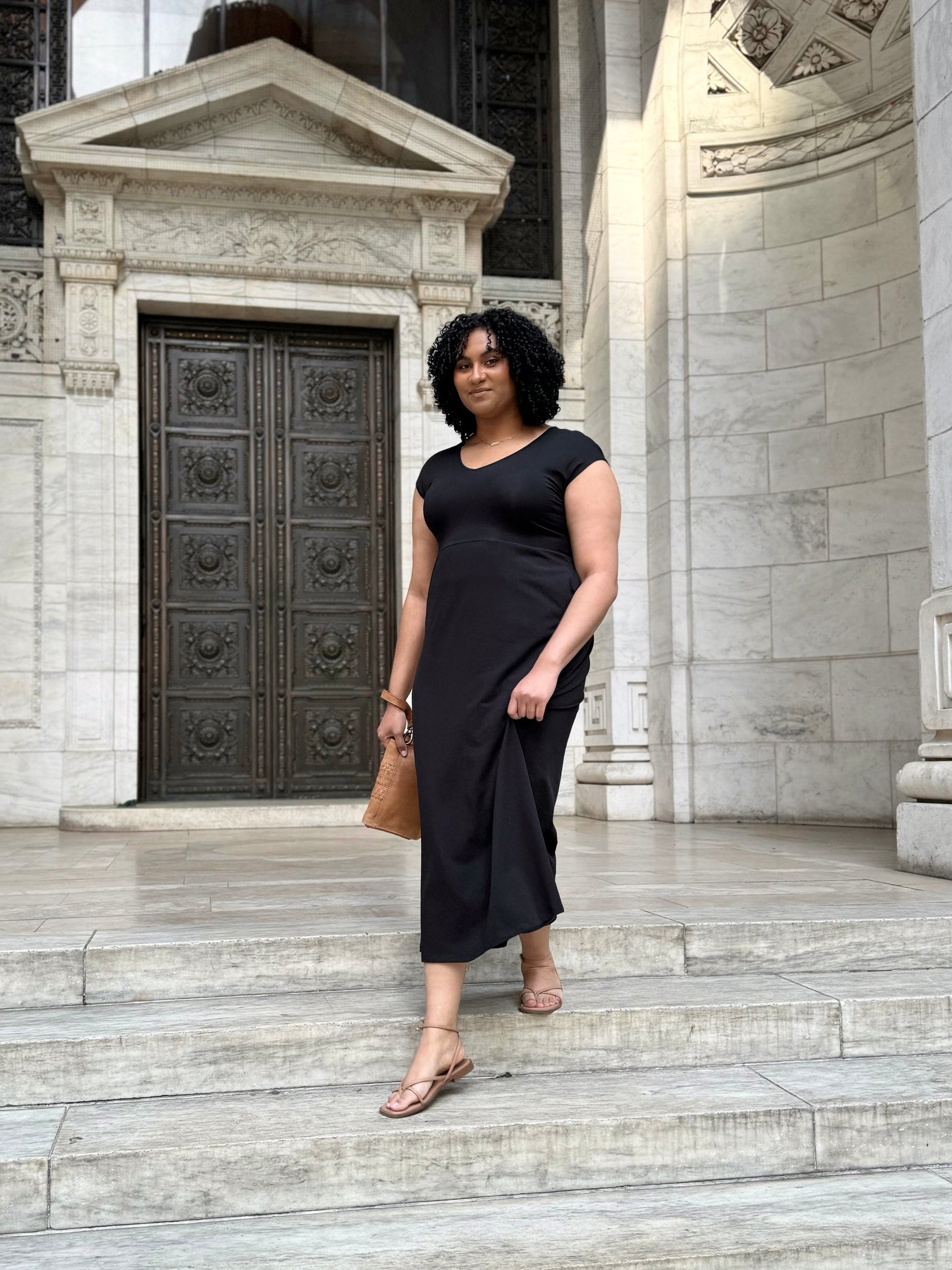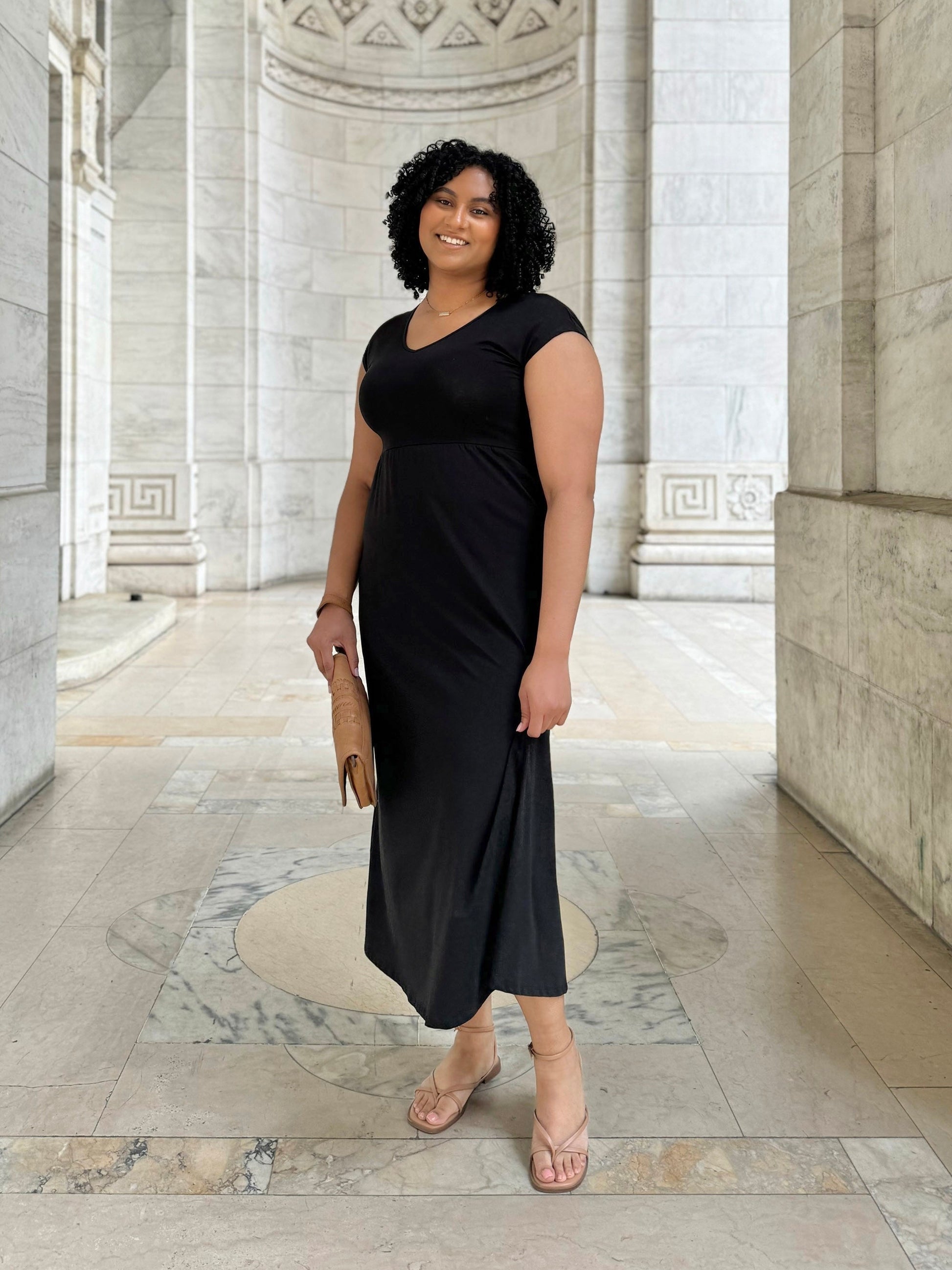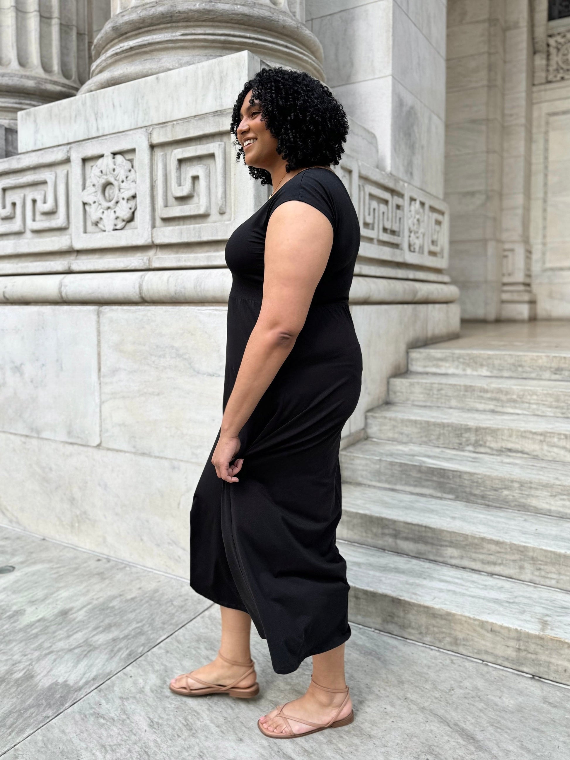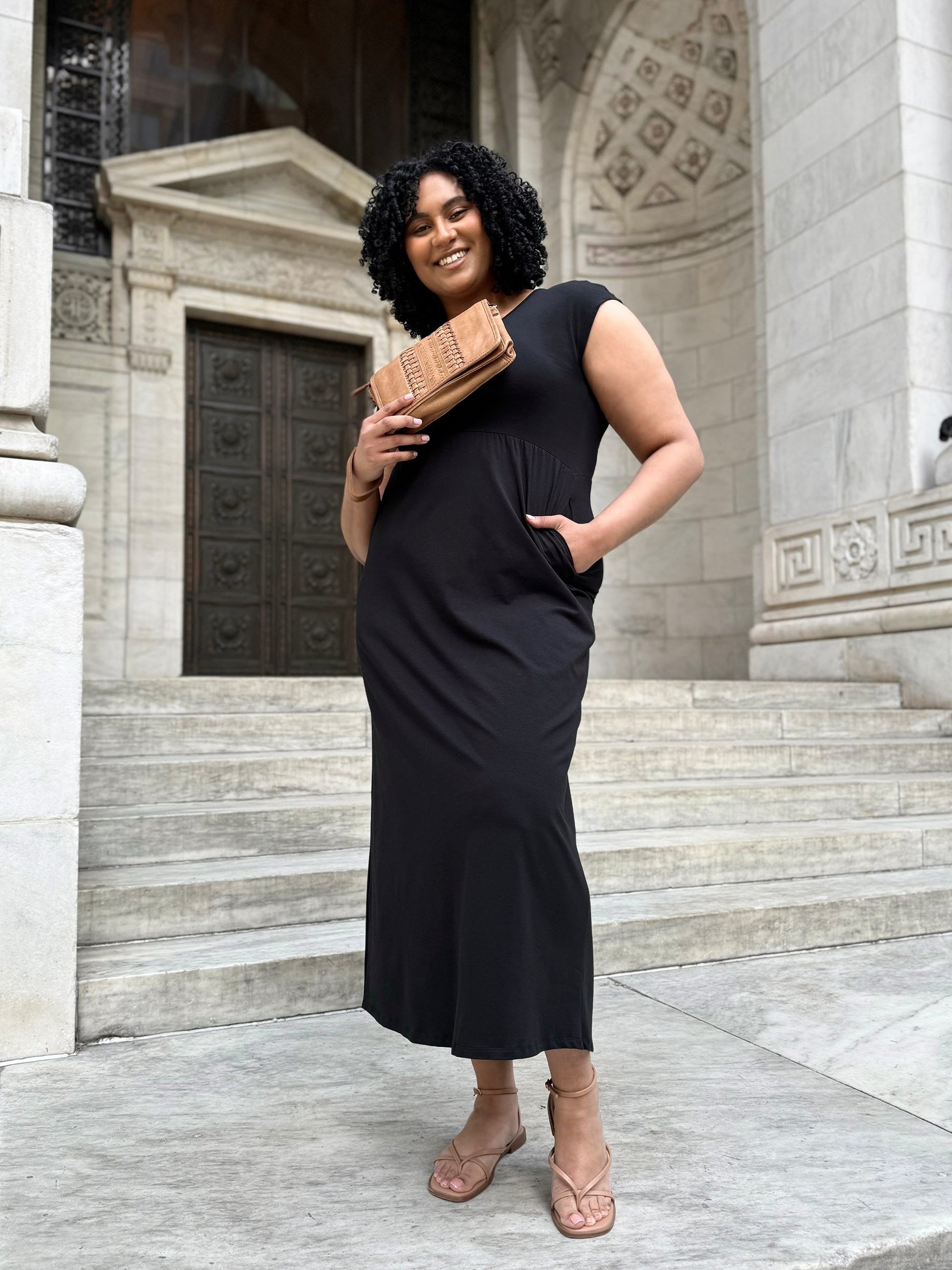 This maxi dress is an elegant and tasteful choice for any occasion. The length is about 53" - a length that works for most heights! You'll love the hidden pockets in the side seams, and the easy and flattering covered sleeveless armhole.