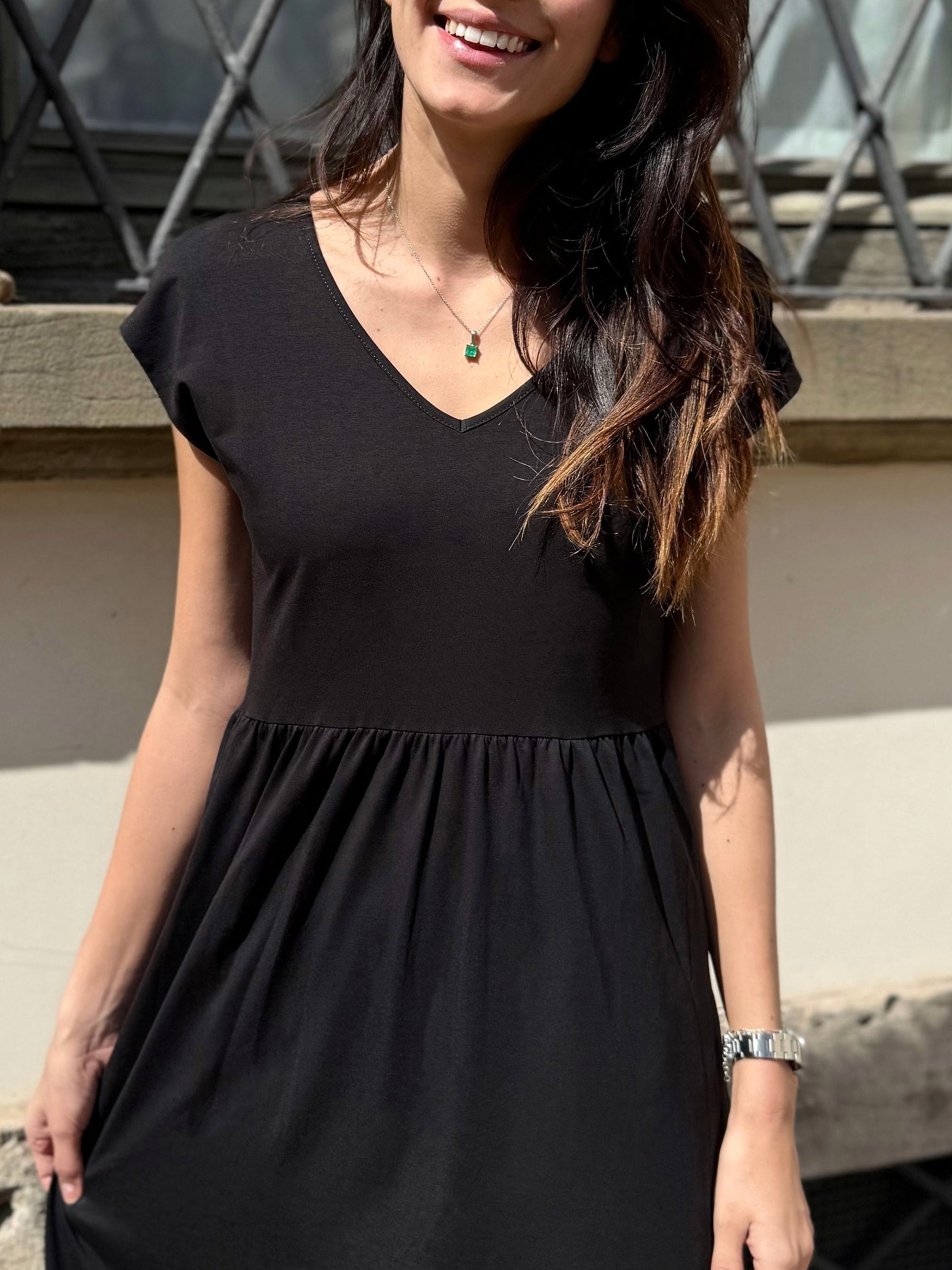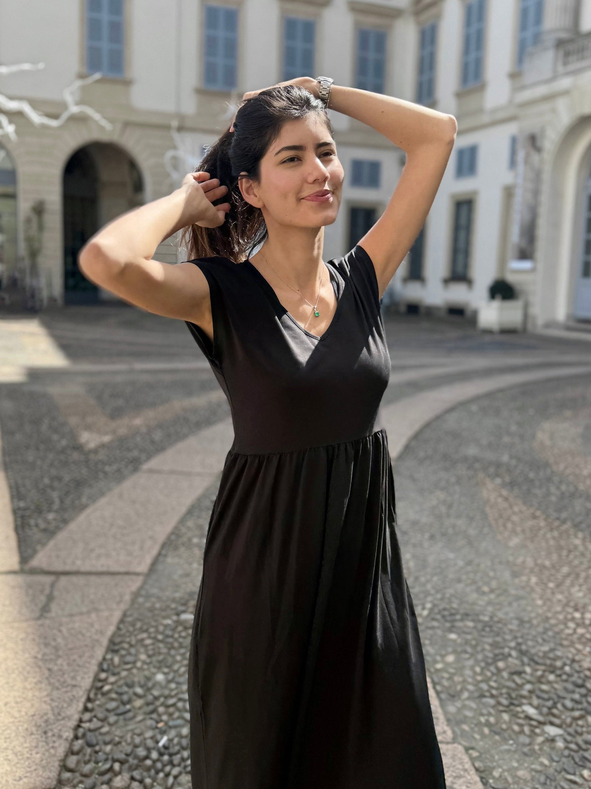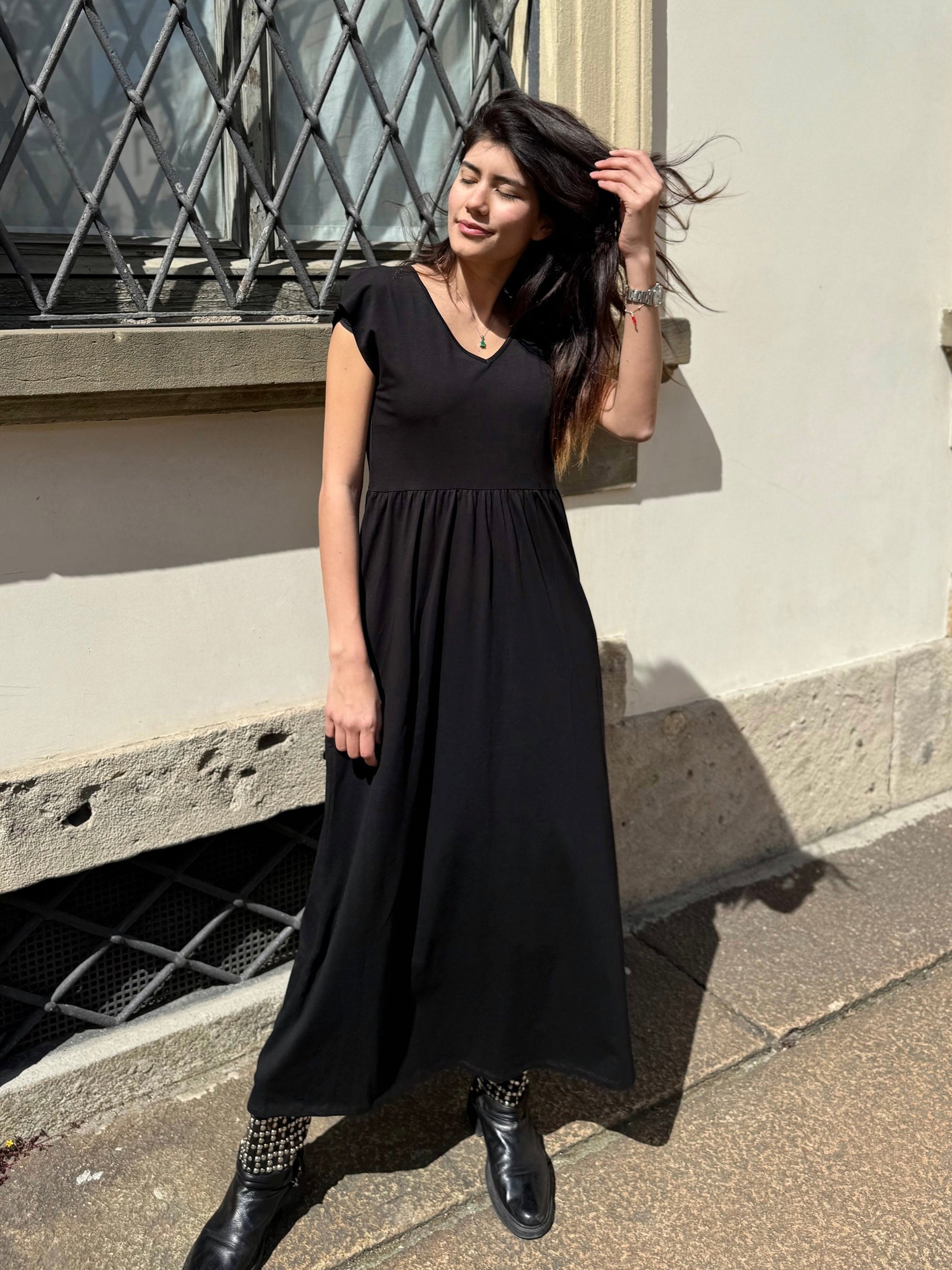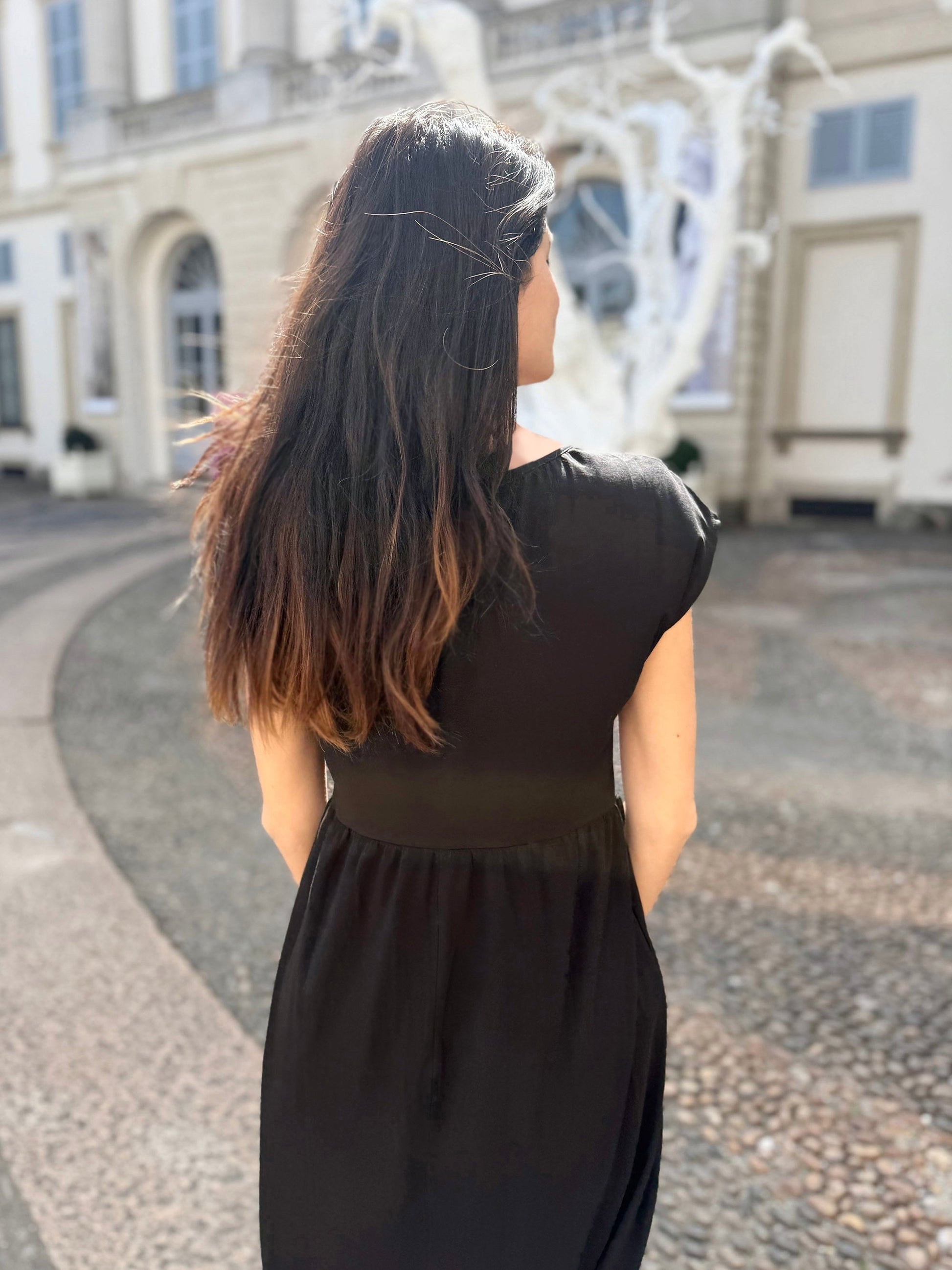 This maxi dress is an elegant and tasteful choice for any occasion. The length is about 53" - a length that works for most heights! You'll love the hidden pockets in the side seams, and the easy and flattering covered sleeveless armhole.