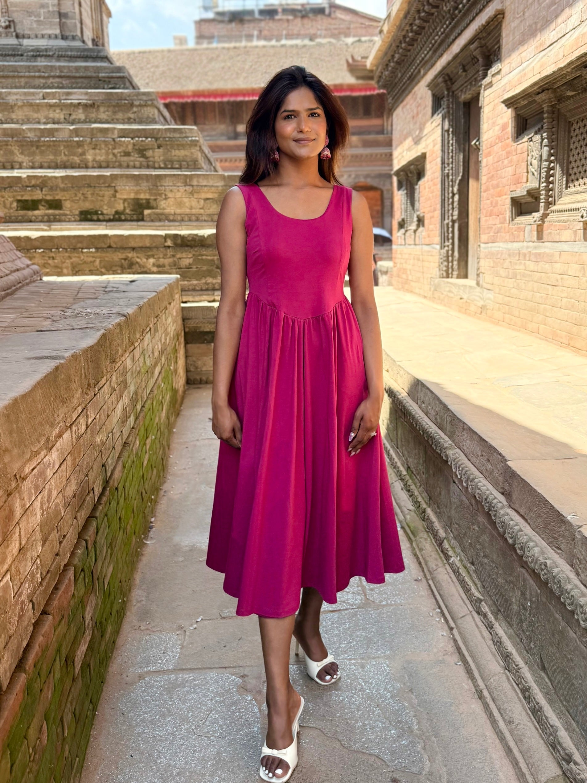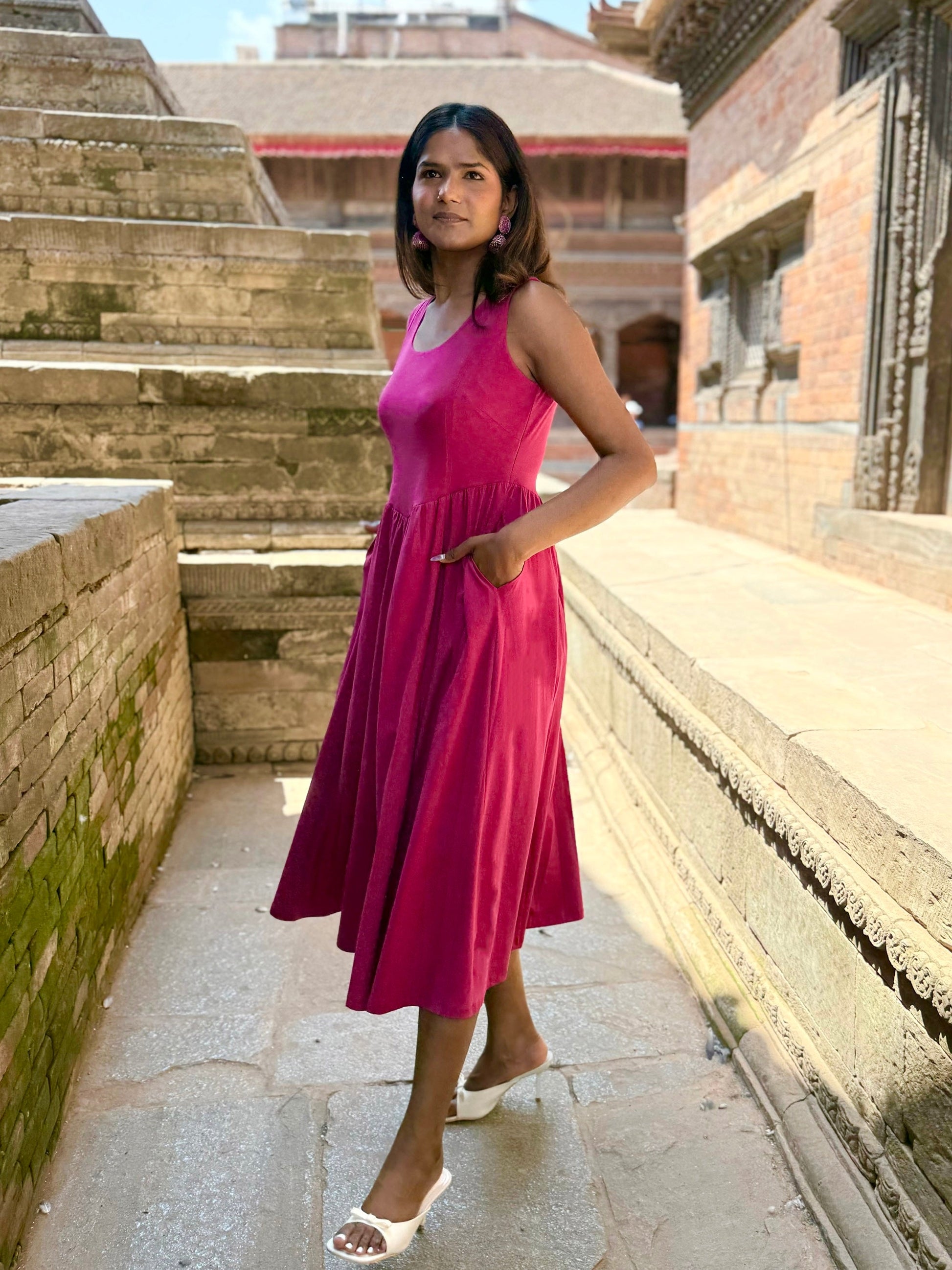The Esther dress features a fitted lined bodice with elegant princess seams that flatter your silhouette. A gathered V-shaped waistband flows into a full skirt, creating a flattering and feminine silhouette. Side pockets are carefully positioned for convenience without added bulk, perfect for dressing up or down.