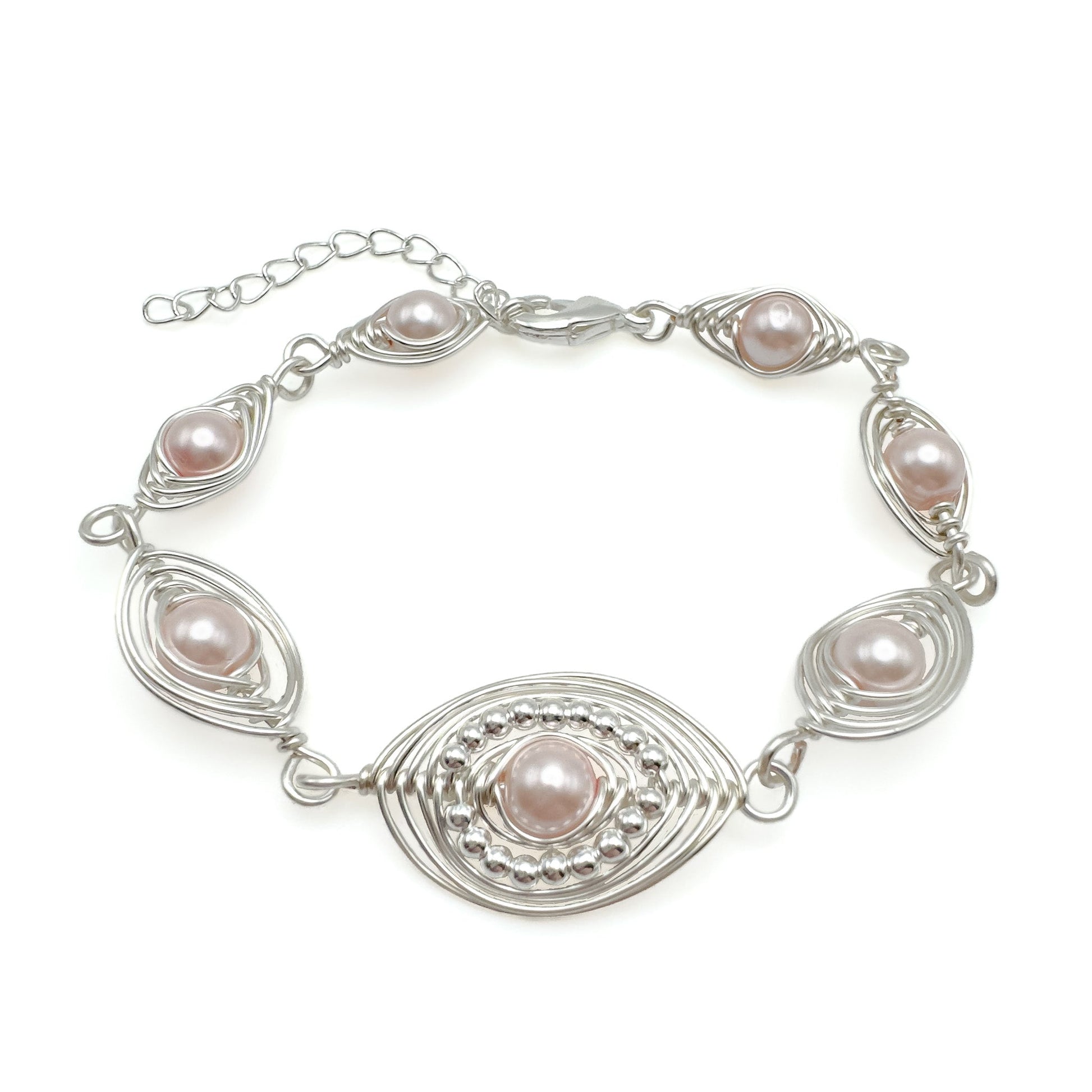Blush pearls are surrounded with herringbone wire wrap in graduated sizes with the centerpiece framed with round silver beads. 6 3/4 inch link bracelet with 1 1/2 inch extender and lobster clasp.
