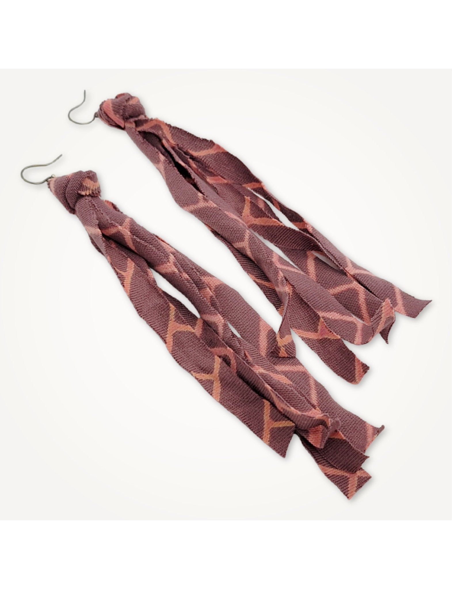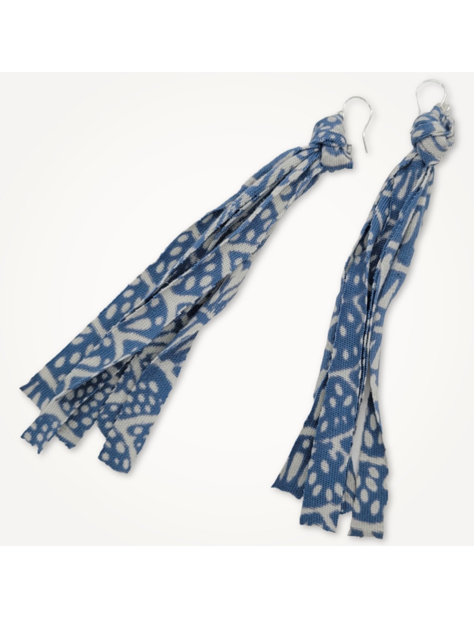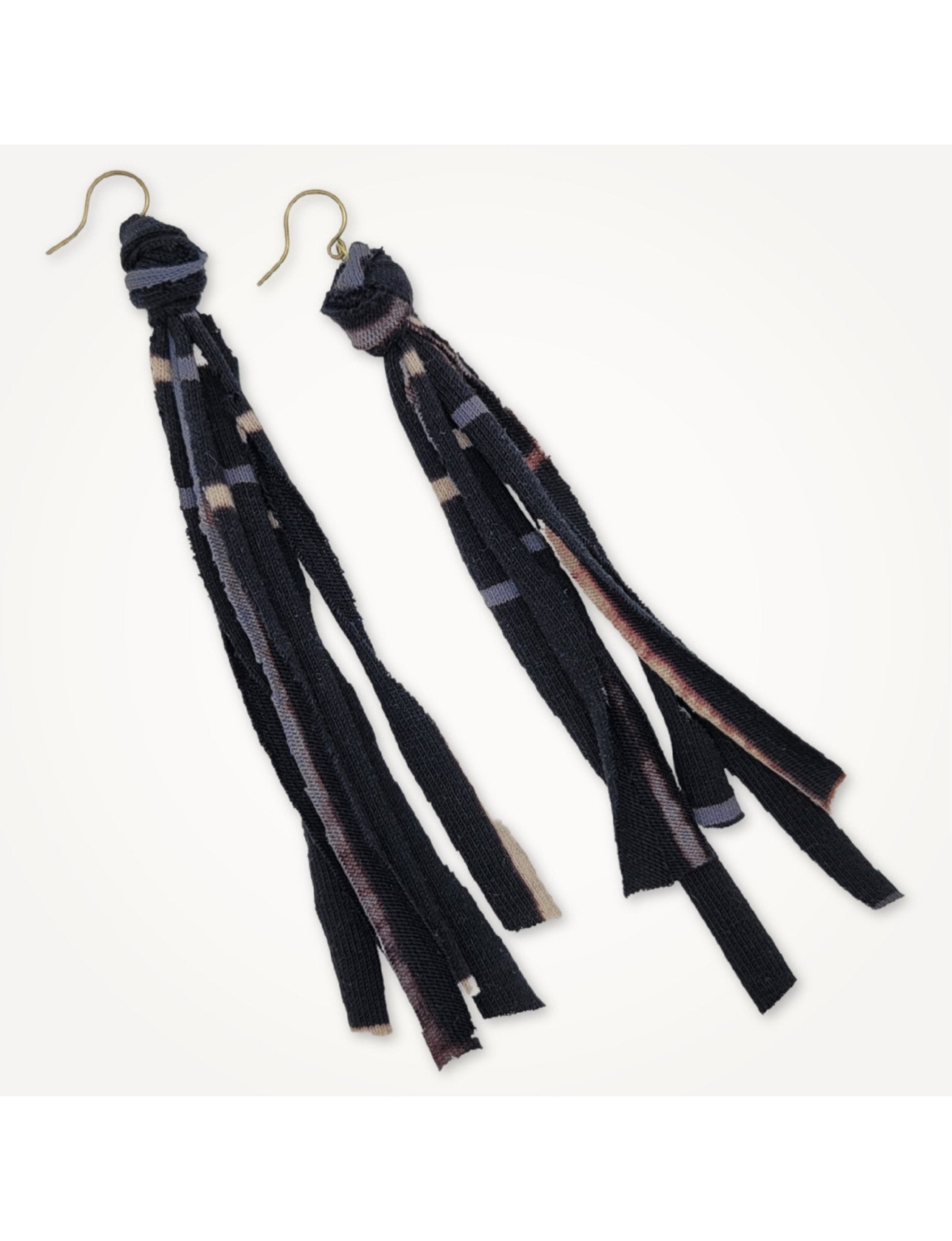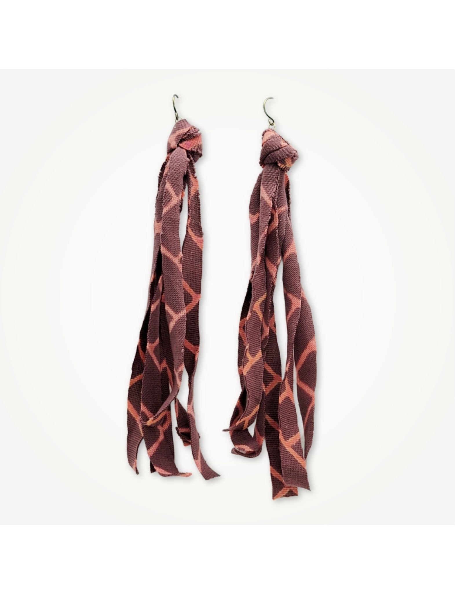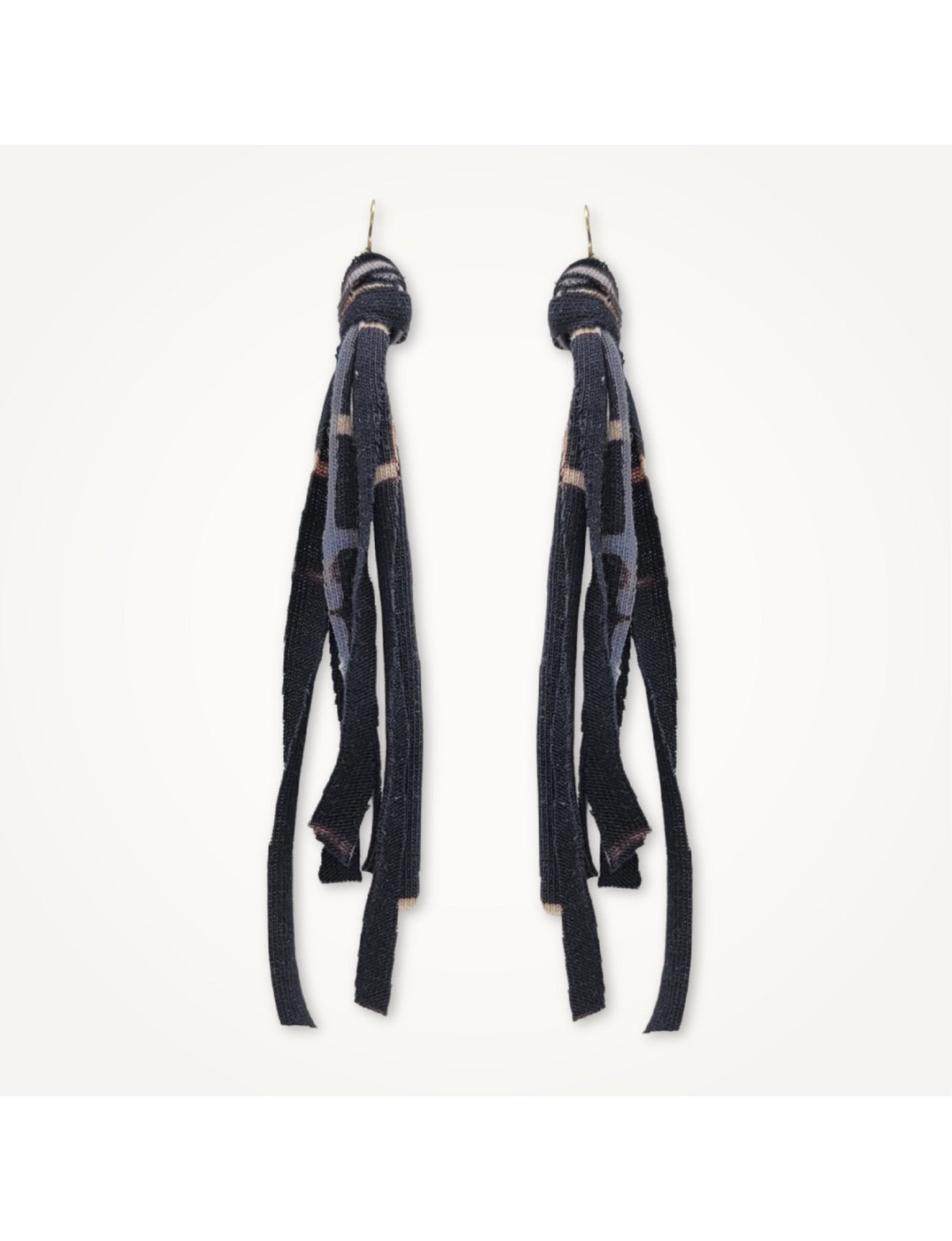 A zero-waste collaboration with local New Orleans jewelry designer Beatrix Bell. These light-weight fringe earrings are sustainably made with repurposed production fabrics. Each piece is handmade, so patterns may vary slightly.