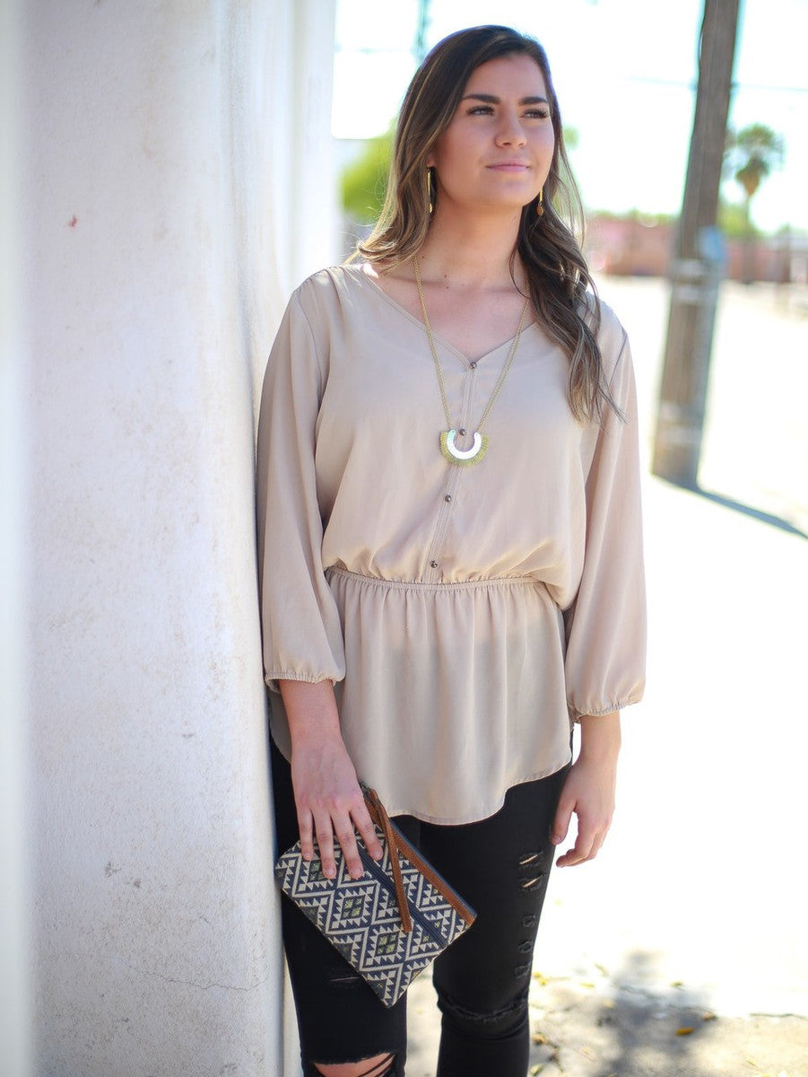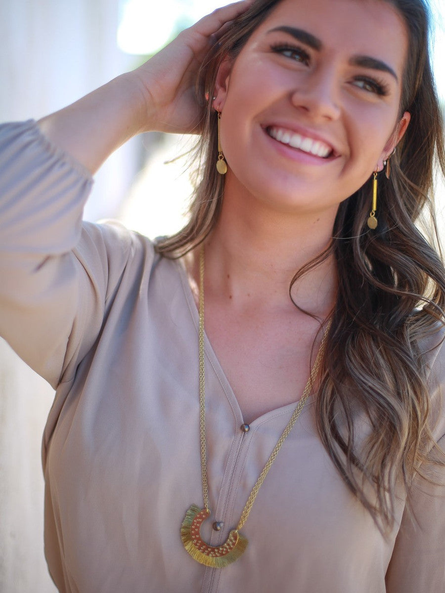 A statement necklace made for everyday life. This long gold necklace has a fringe that is sure to brighten up your day.