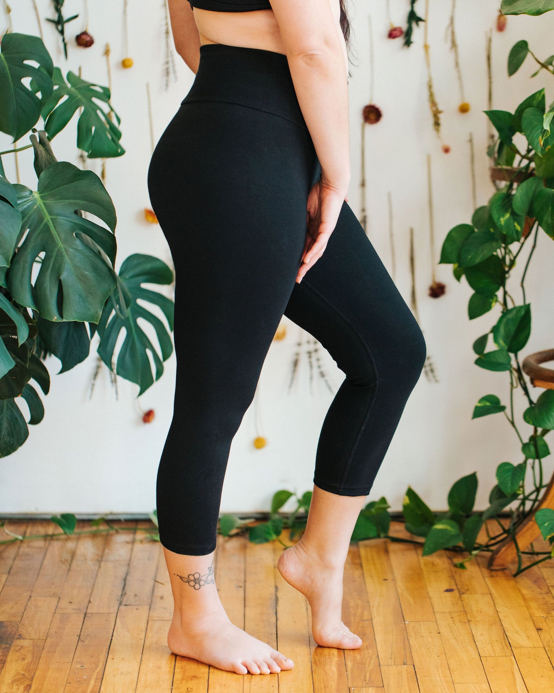 High Rise 3/4 Length Leggings Plain Black