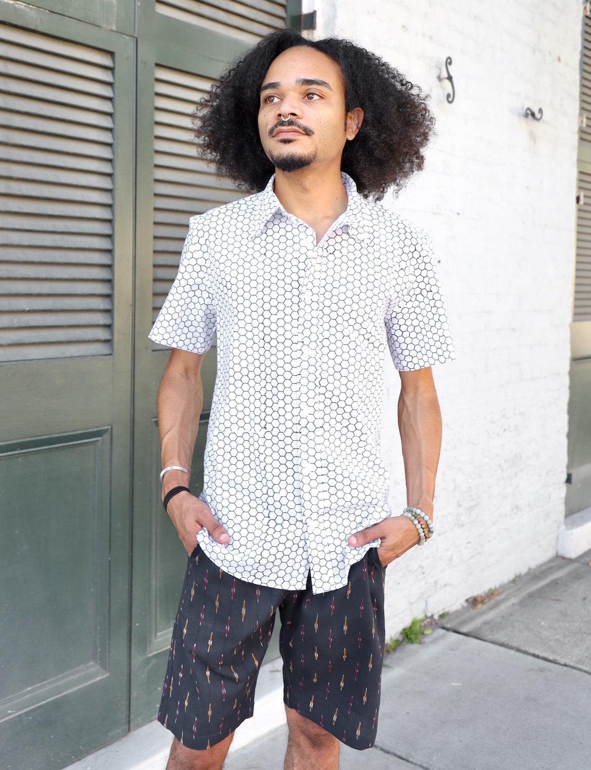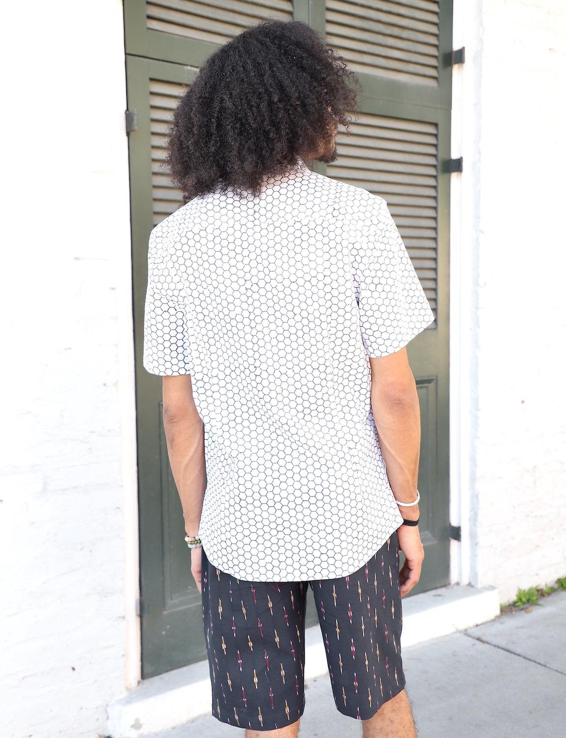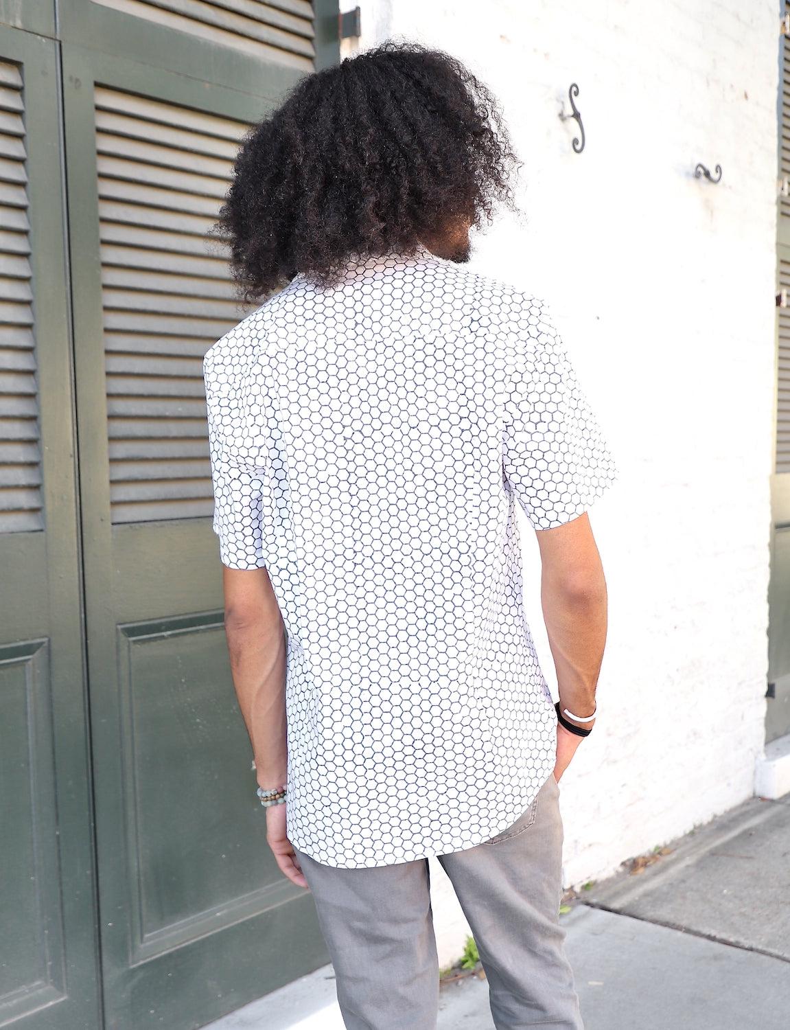 Our honeycomb button down is a fun take on a classic style. This short sleeve shirt is navy and white. It features gentle tapering at the waist with a straight and narrow profile and a broader fit in the shoulders gives this shirt the perfect fit. Wear it to work, at dinner dates or to the park with friends.
