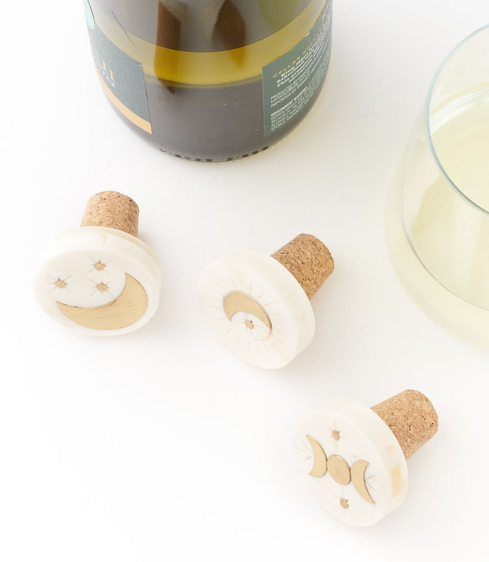 Indukala Moon Phase Wine Stopper Cork - Carved Bone, Brass Inlay