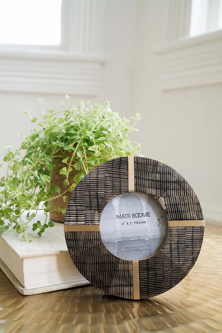 Reminiscent of the architecture of traditional houseboats of Kerala, this picture frame features a carved horn design in beautiful dark colorways. Variation is expected in each piece, making it truly one-of-a-kind. Handcrafted by master artisans in India, this frame accommodates a 2.5x2.5" photo or print, easily accessed with metal swivel tabs and a removable back.
