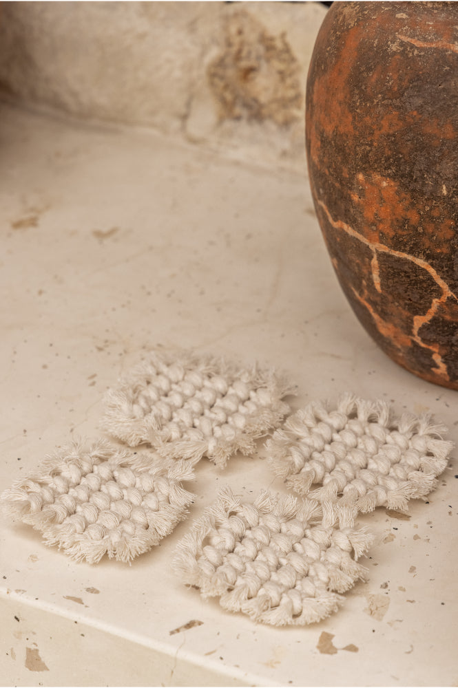 Made from organic cotton, our knotted macrame coasters are the perfect resting place for your drinks or candles. The texture brings warmth and design to any space while also being a practical solution.