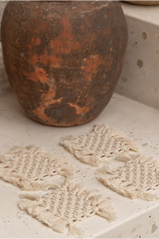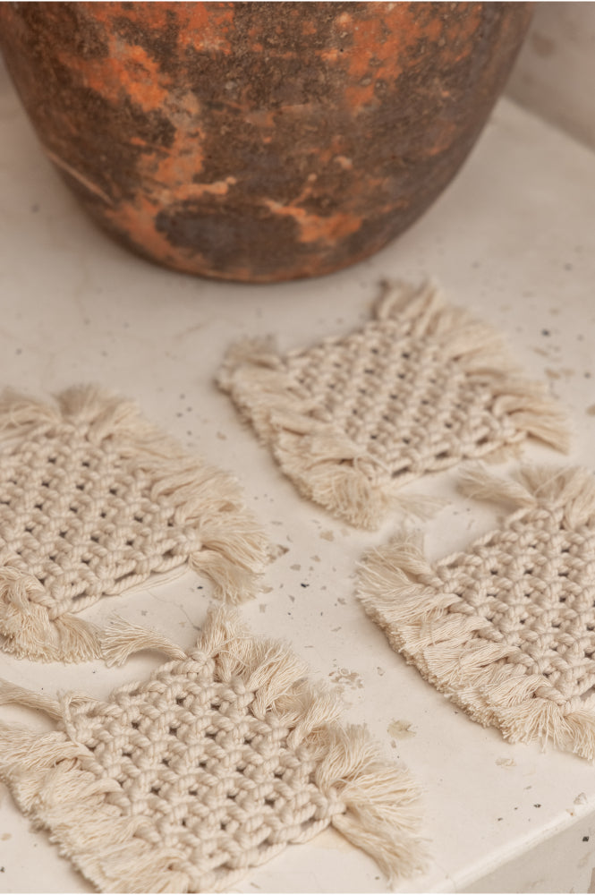 Made from organic cotton, our kotak macrame coasters are the perfect resting place for your drinks or candles. The texture brings warmth and design to any space while also being a practical solution.