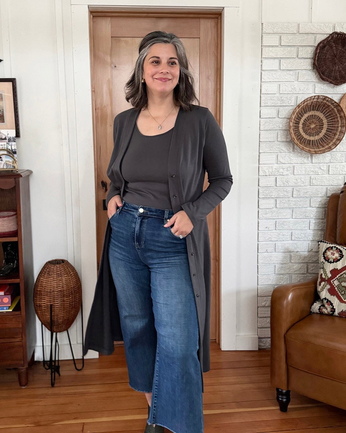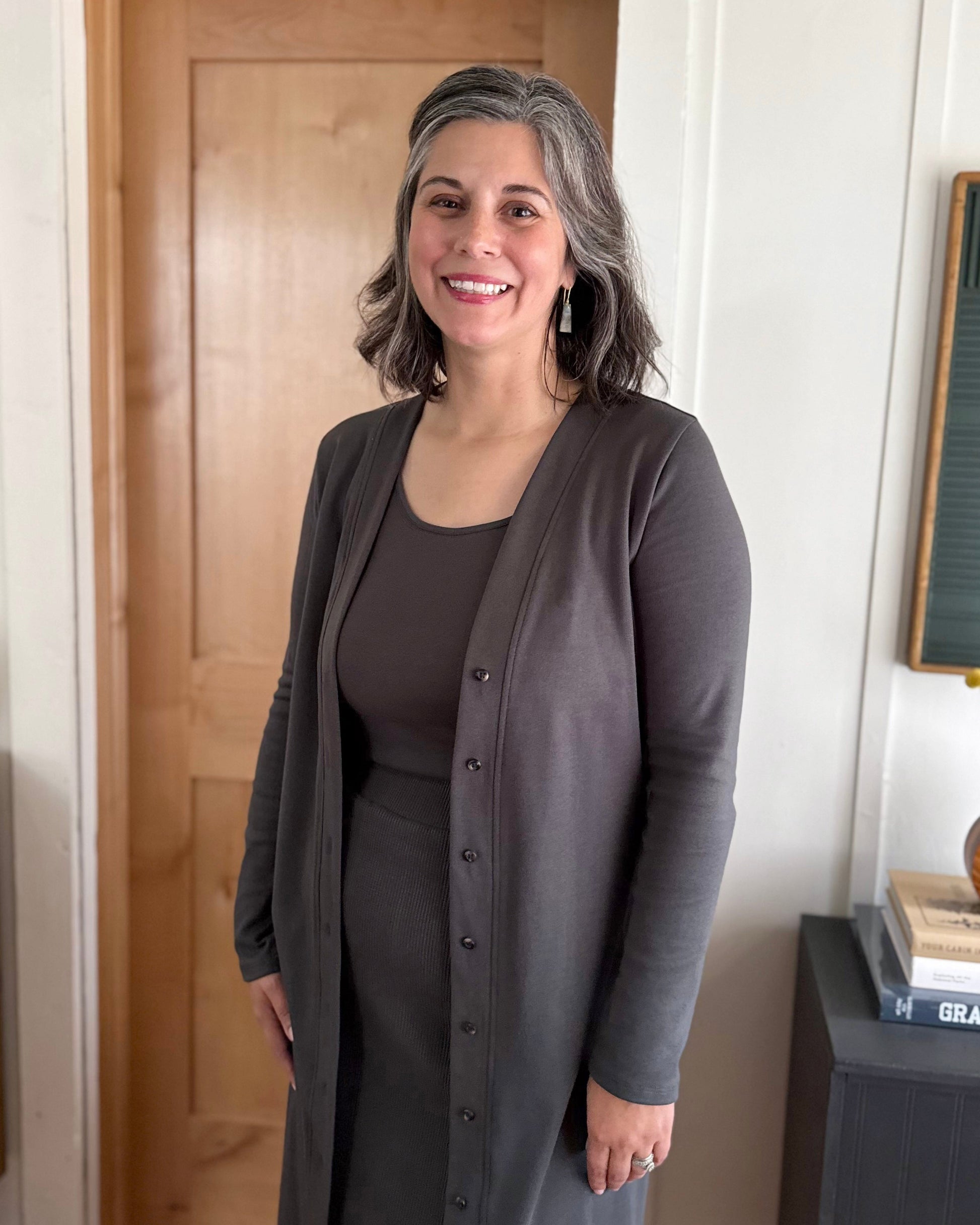 The Lena is a versatile design that can be a duster or a dress. To wear as a dress, close the buttons fully. This offers a more structured fit because of the thicker doubleknit jersey.