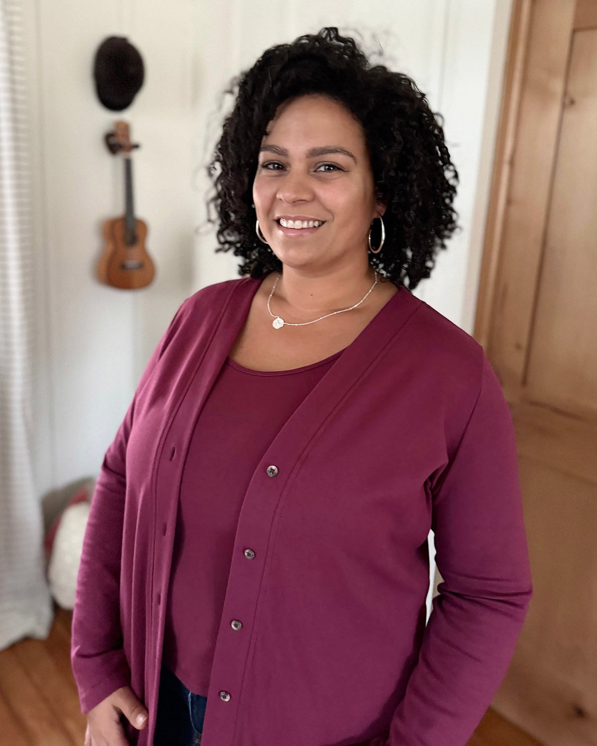 The Lena is a versatile design that can be a duster or a dress. To wear as a dress, close the buttons fully. This offers a more structured fit because of the thicker doubleknit jersey.