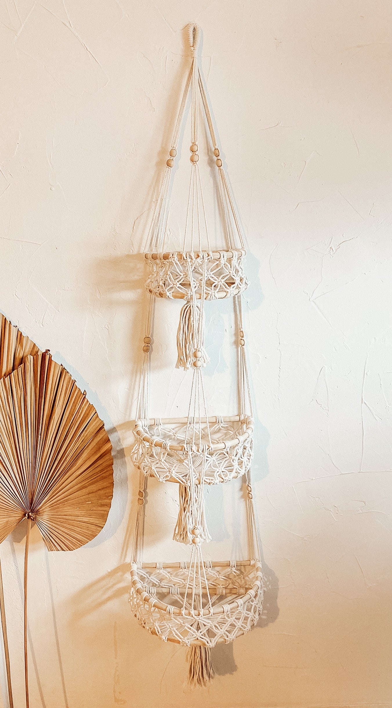 This hanging set of wall baskets features two or three tiers of cotton macrame and rattan rings. Fill it with fruit, your favorite house plants, cook books, you name it! Brighten up your walls with this creative and elevated storage solution.