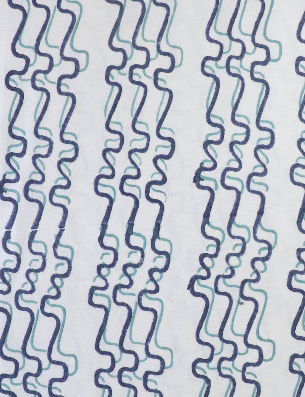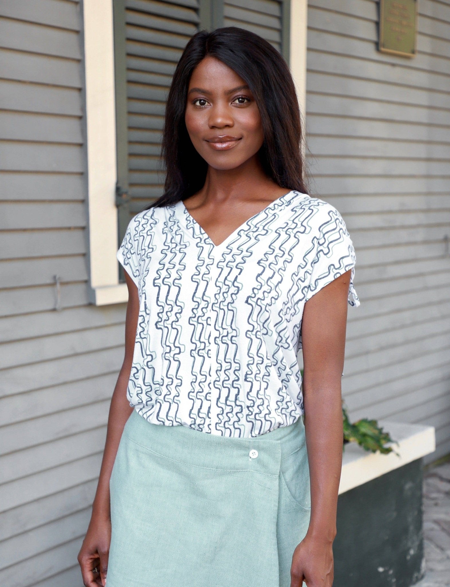 Flirty and fun, dance the day away in this sleeveless blue striped top with a block print that is inspired by the bends and curves of the Mississippi River. Featuring a relaxed fit with ties on the shoulder to adjust the sleeve width.