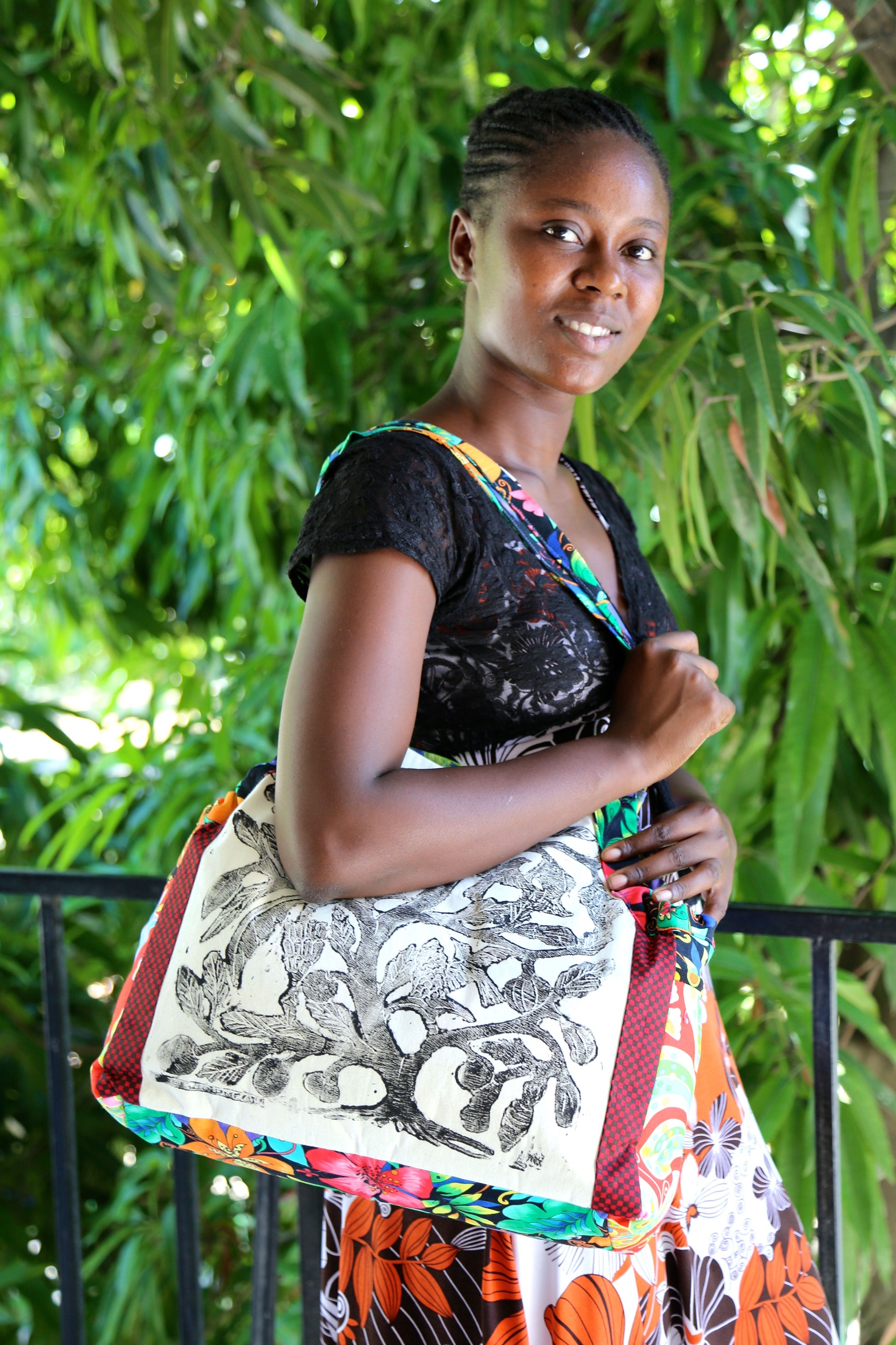 Hold everything! (Well, almost :-) A great bag for toting all your stuff in style. Hand-pulled blockprint designed by renowned metal artist Serge Jolimeau. Interior pockets keep things organized. 100% cotton. Machine washable.
