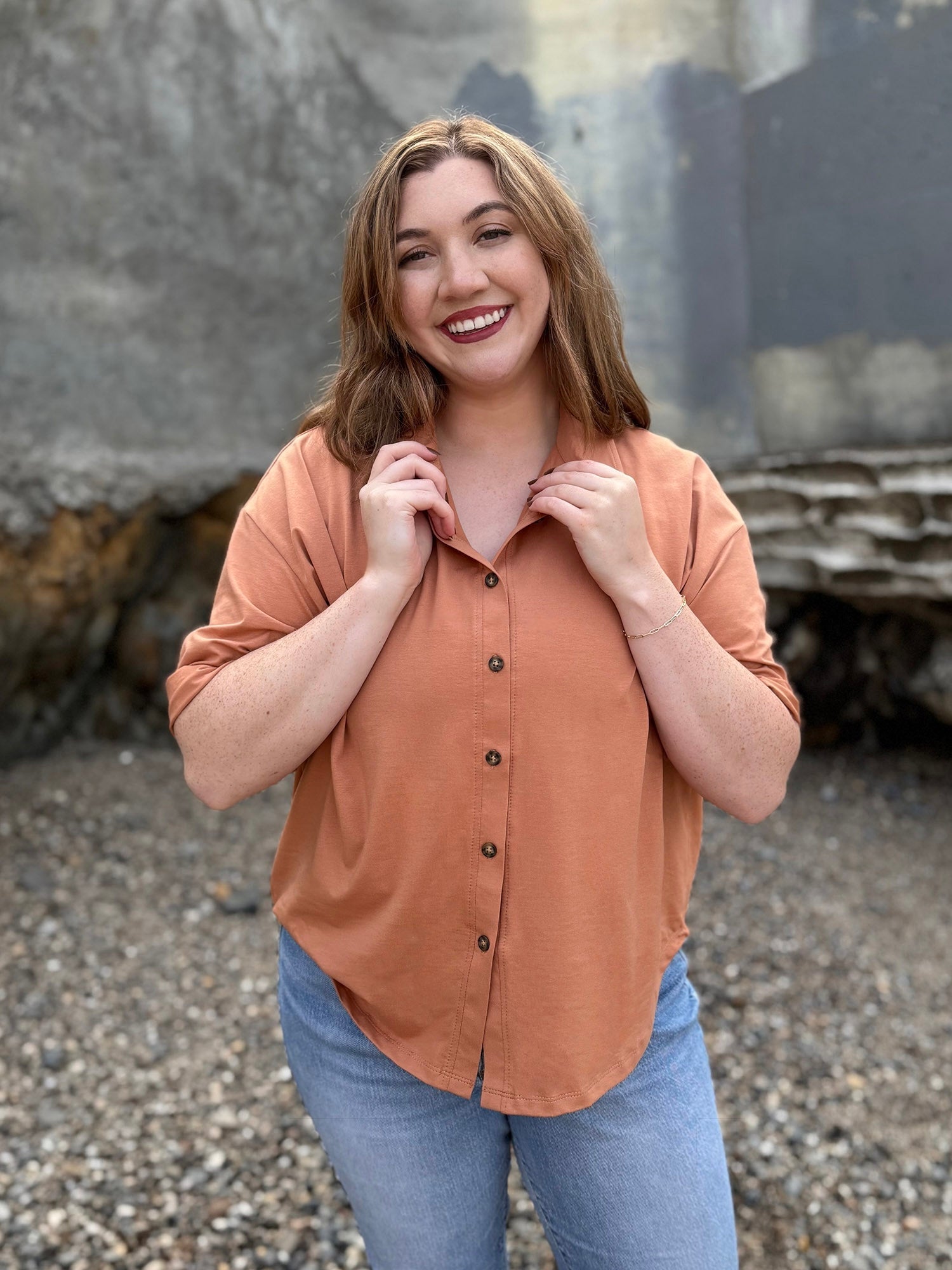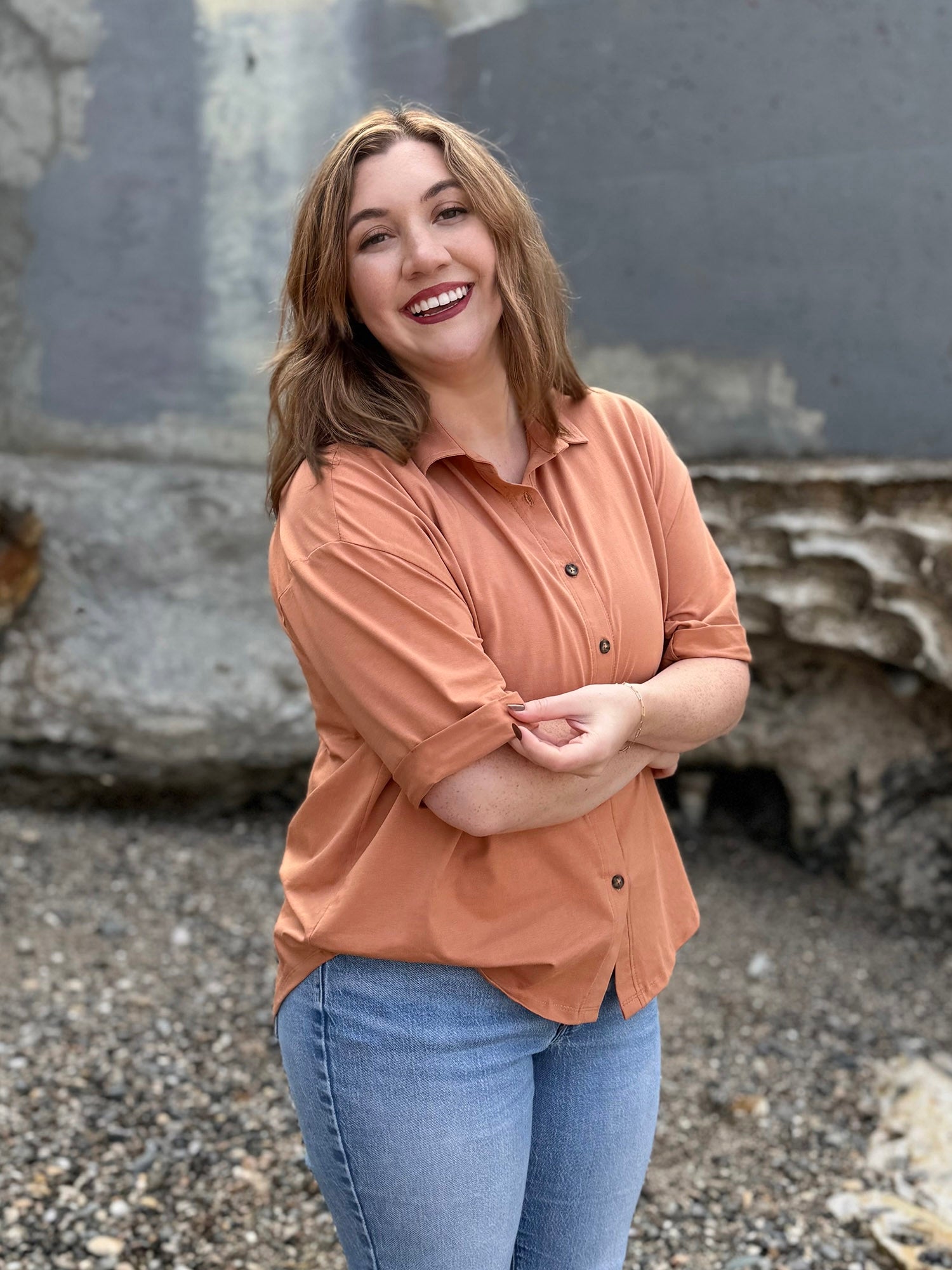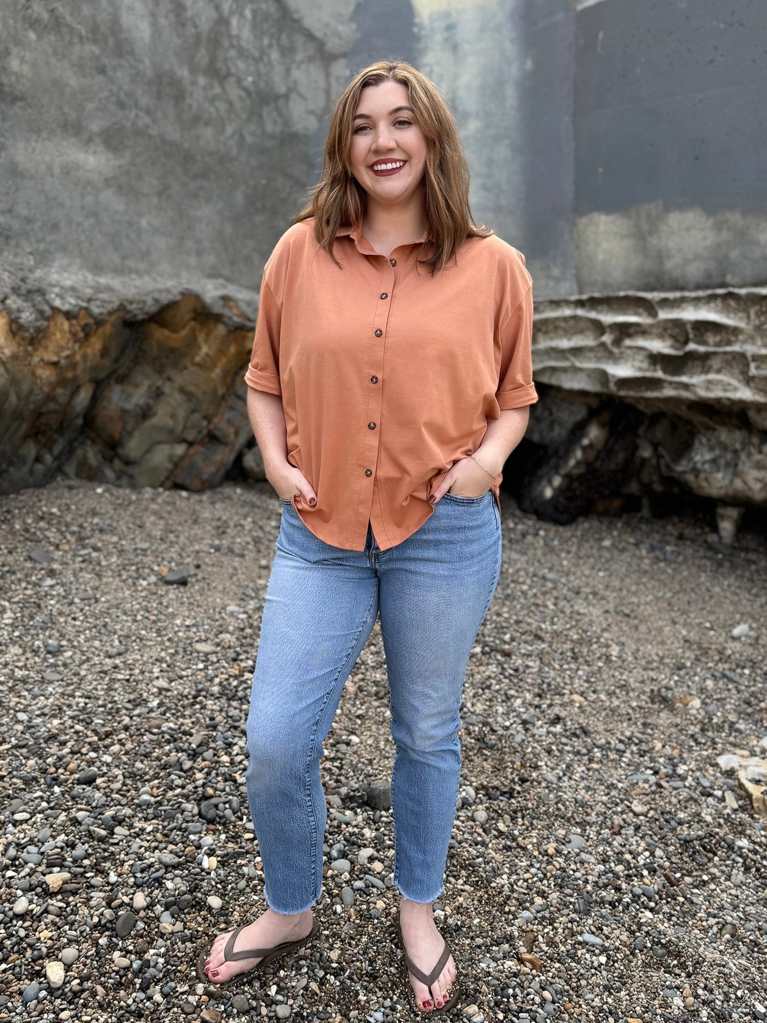 A versatile classic. Wear it untucked, tucked in, or tied at the front. Sleeve length is at the elbow and permanently rolled. It can be easily rolled another time to make it shorter (and the cuff will stay in place too!). The functional buttons provide ease for nursing moms.