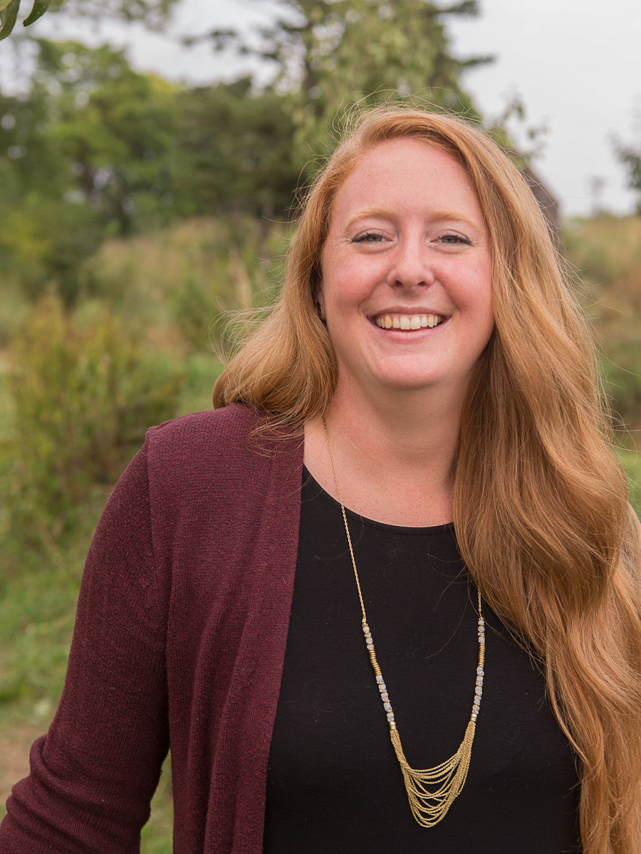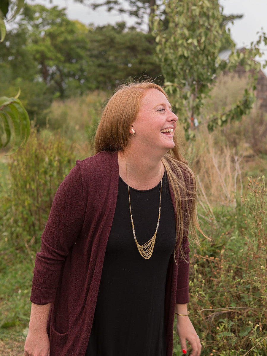 Made from brass-plated recycled metal. Nickel-free. Necklace measures 34" with 3" extender. Semiprecious moonstone beads.