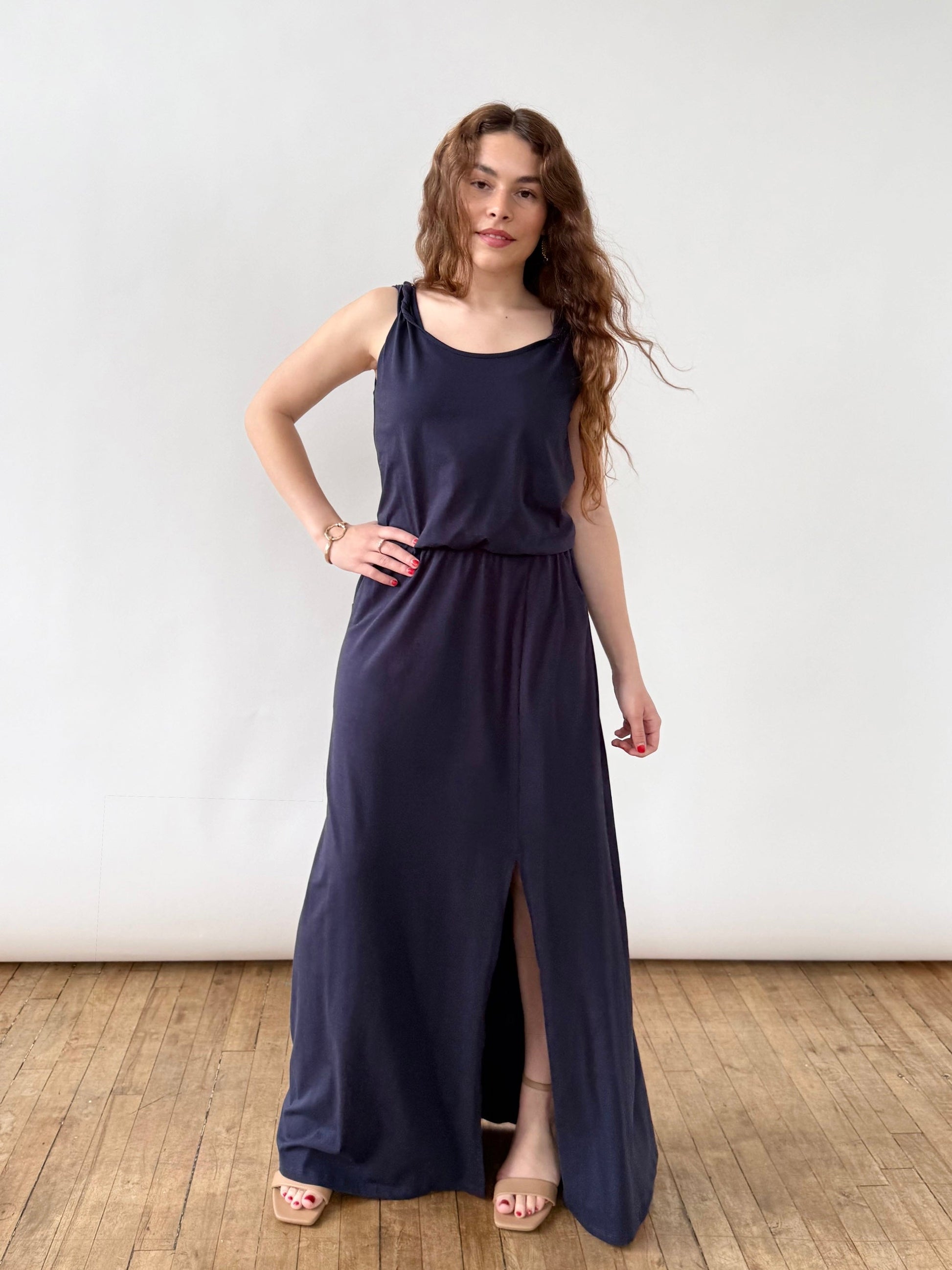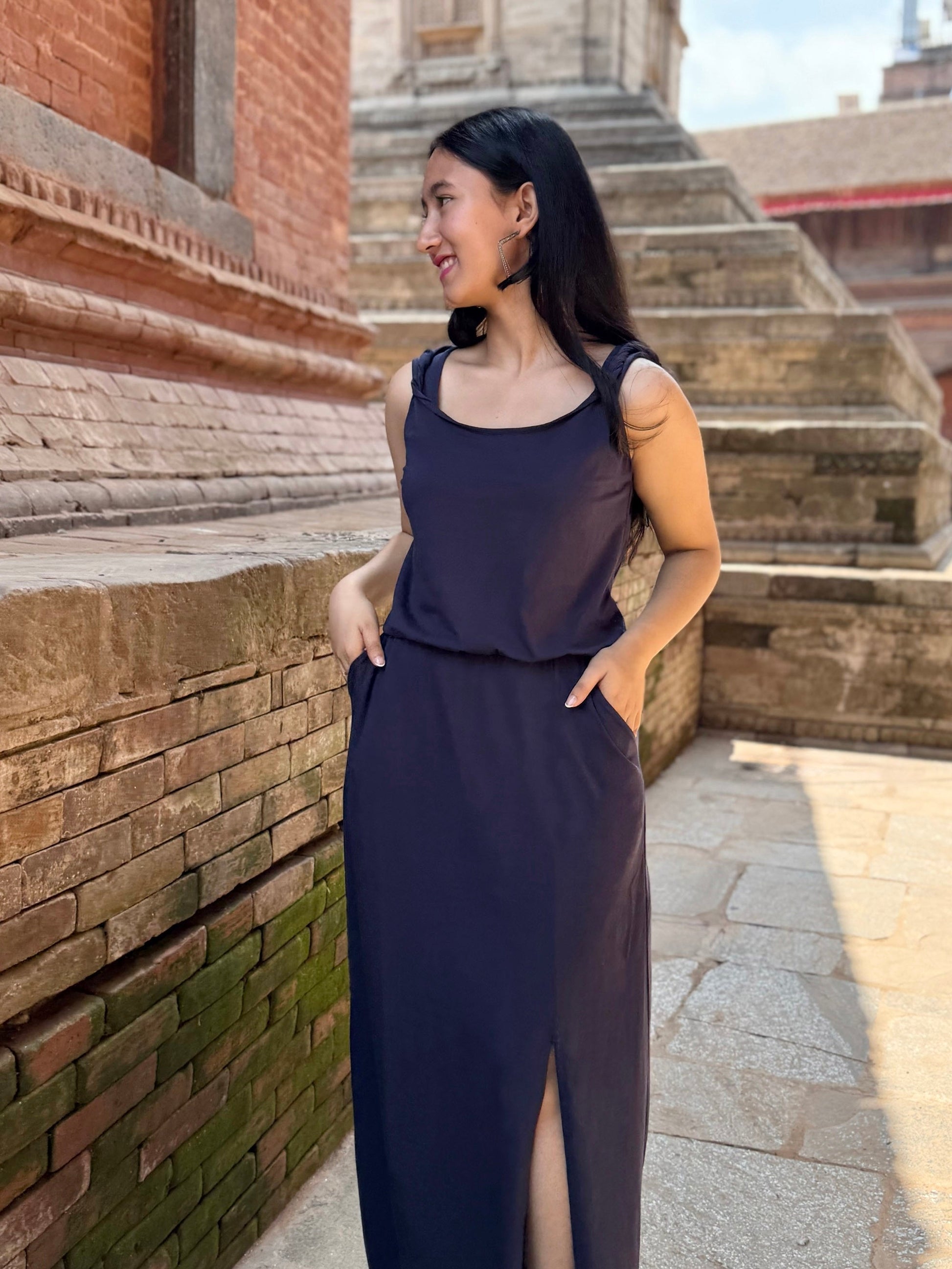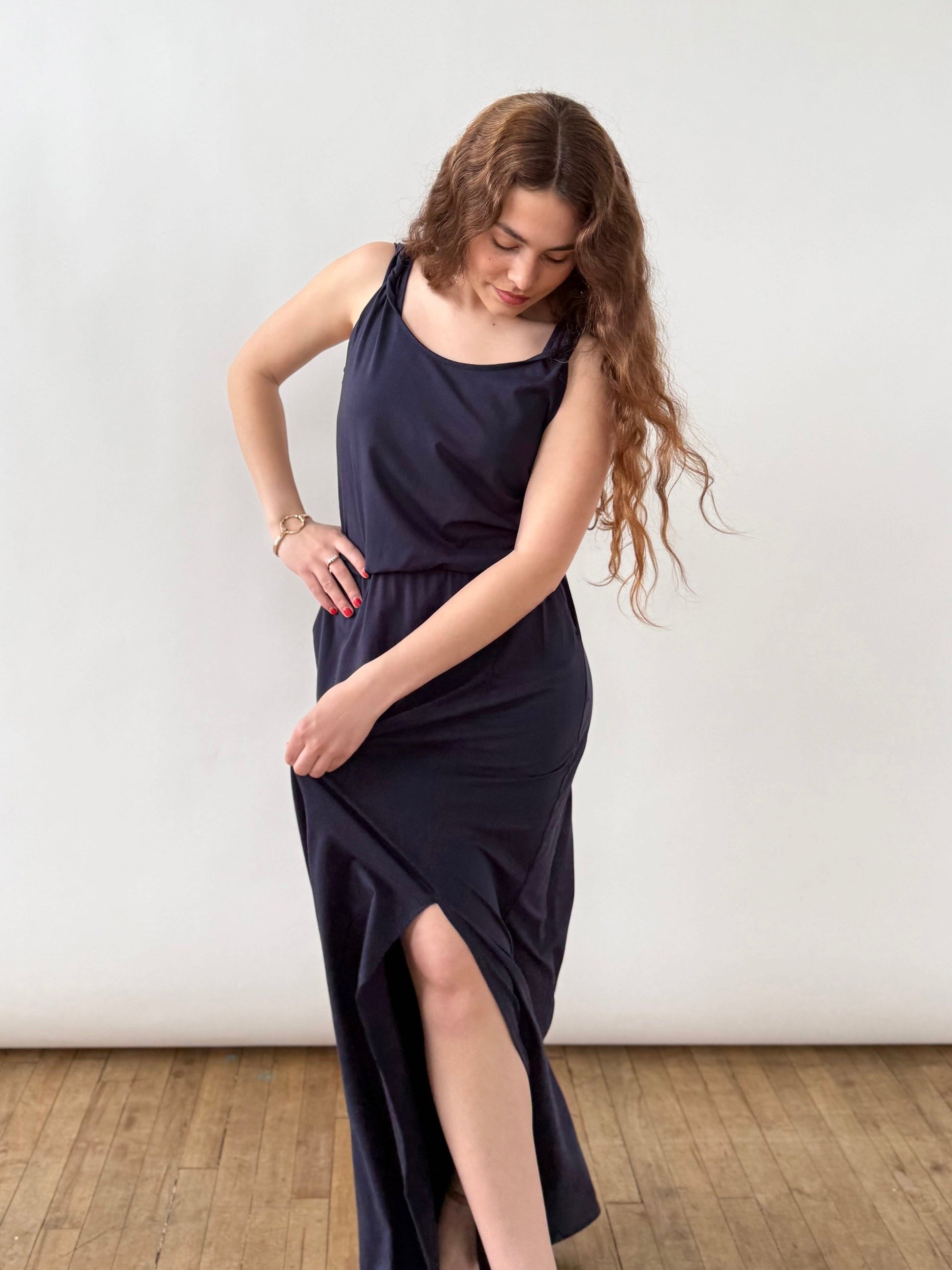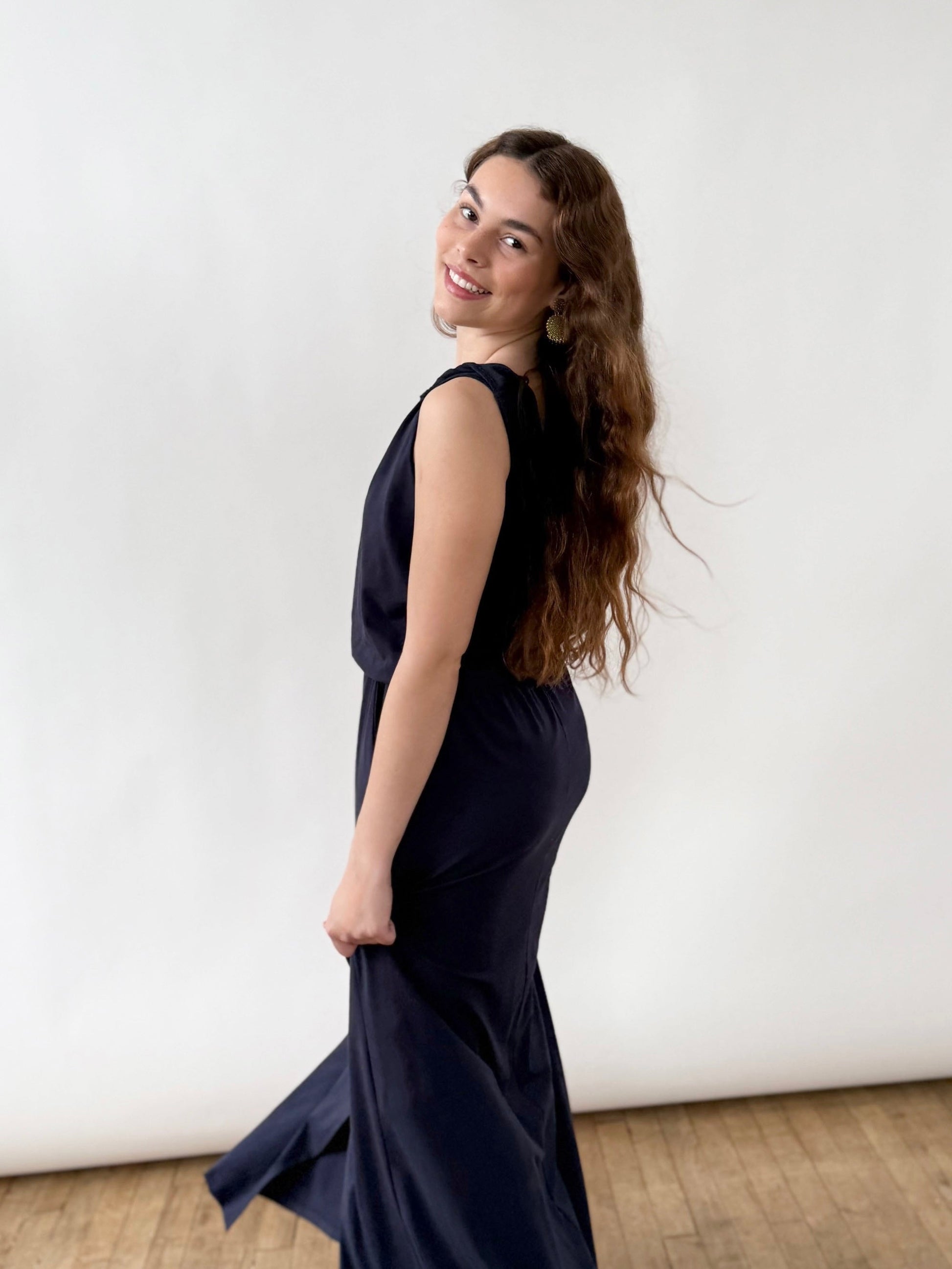Inspired by the Miranda dress, the Michal dress has a lined bodice to neatly hold the bloussant in place. The twist detail is sewn in and fuss-free, while discreetly placed pockets keep the hips smooth. A 23" slit brings an unexpected touch of elegance and ease of movement.