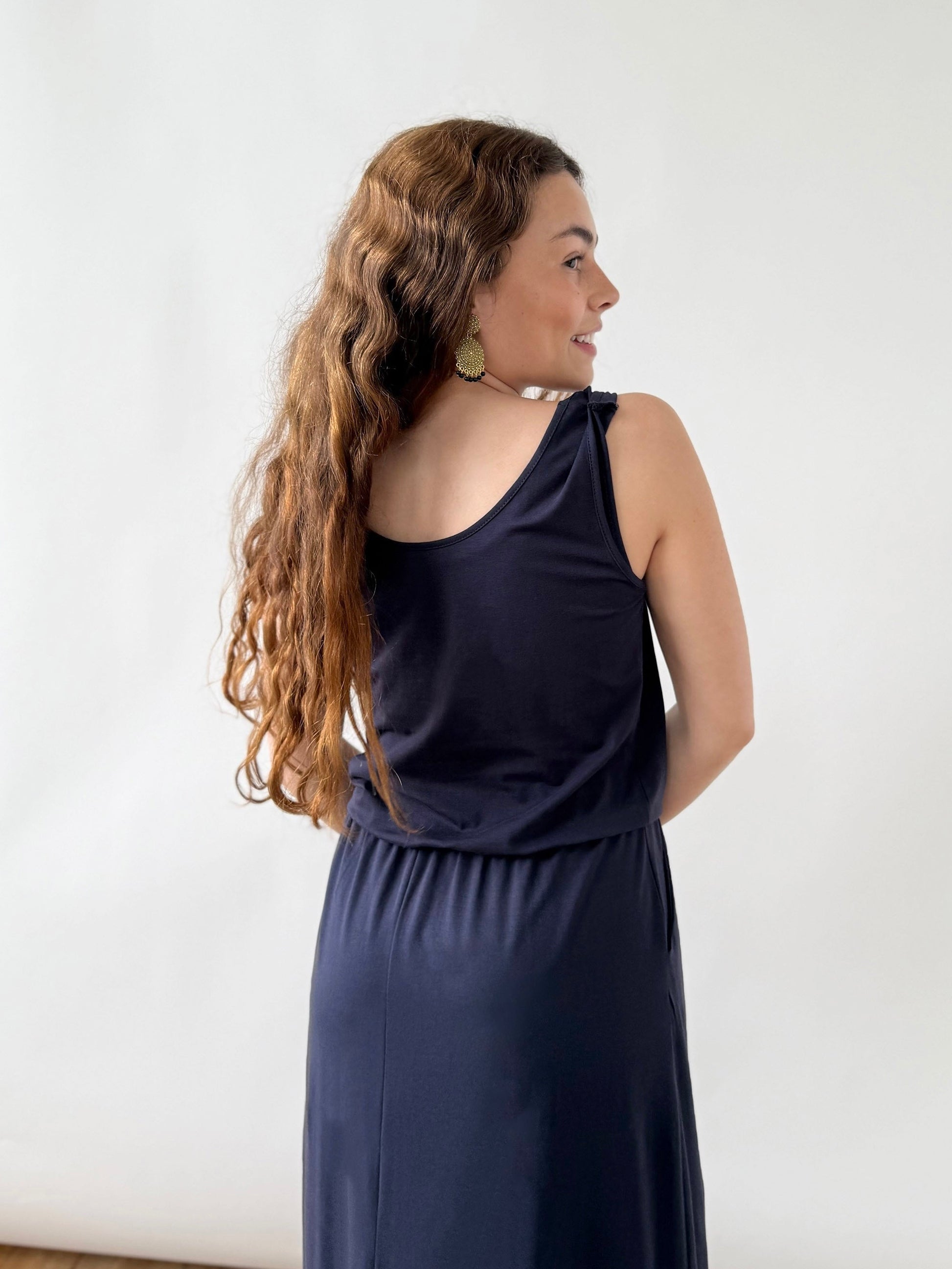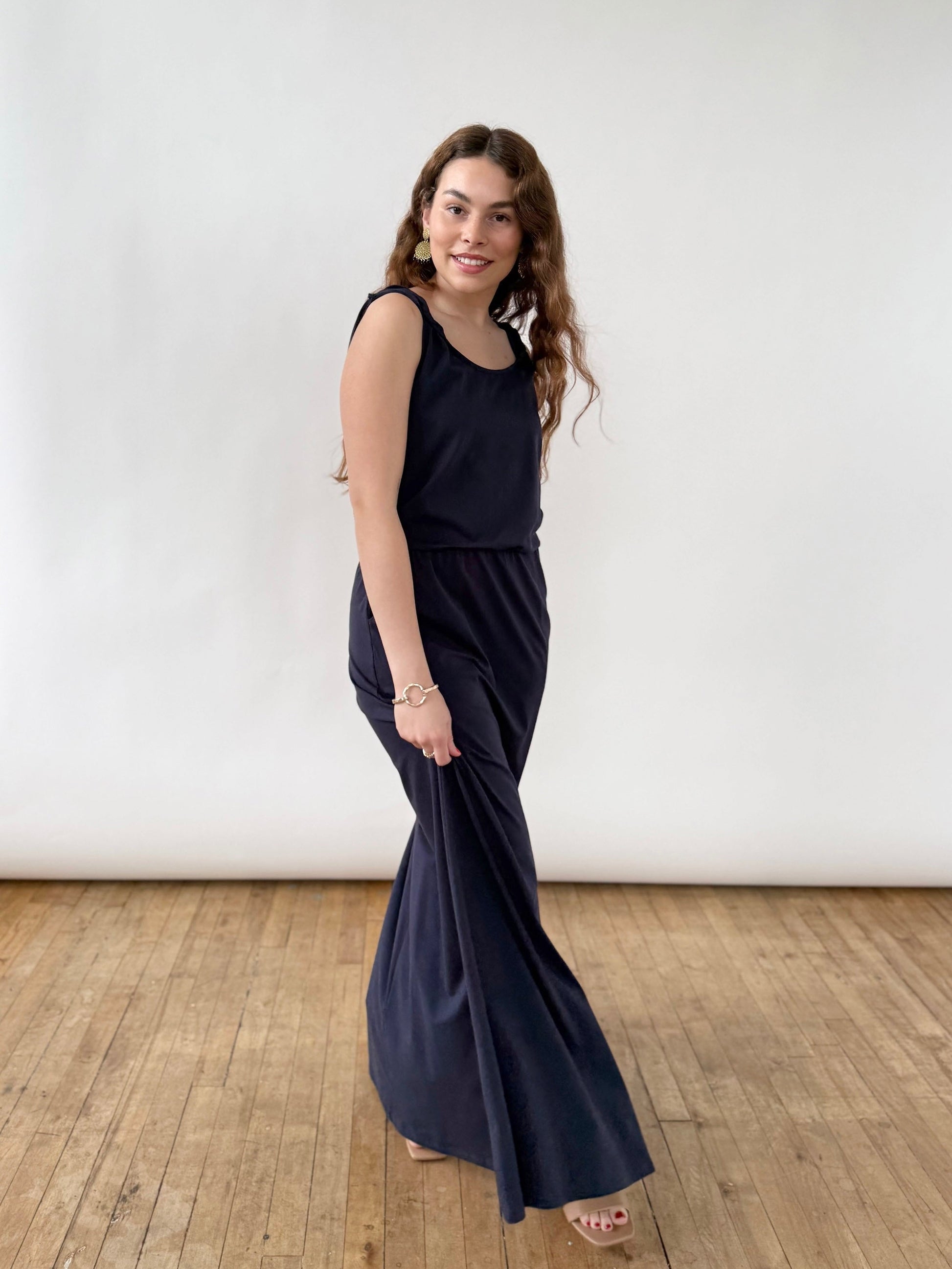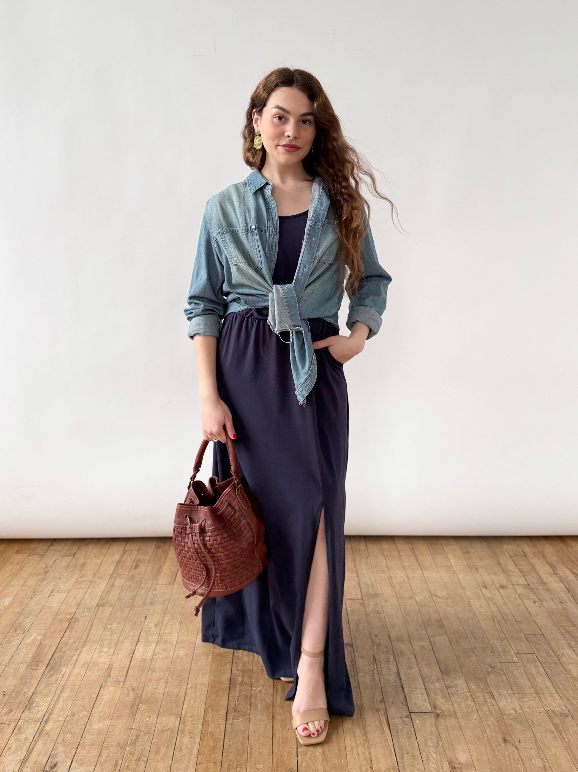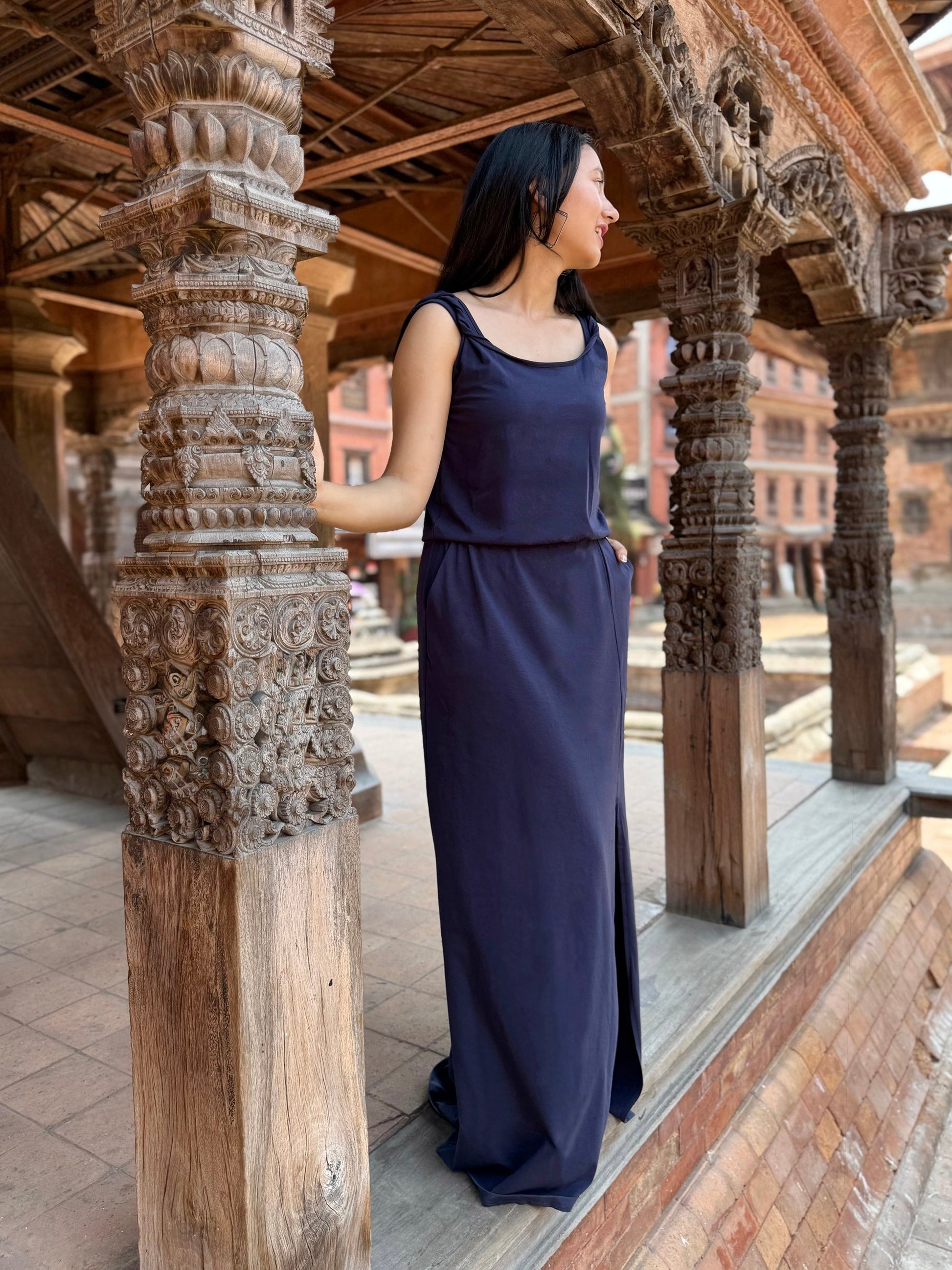 Inspired by the Miranda dress, the Michal dress has a lined bodice to neatly hold the bloussant in place. The twist detail is sewn in and fuss-free, while discreetly placed pockets keep the hips smooth. A 23" slit brings an unexpected touch of elegance and ease of movement.