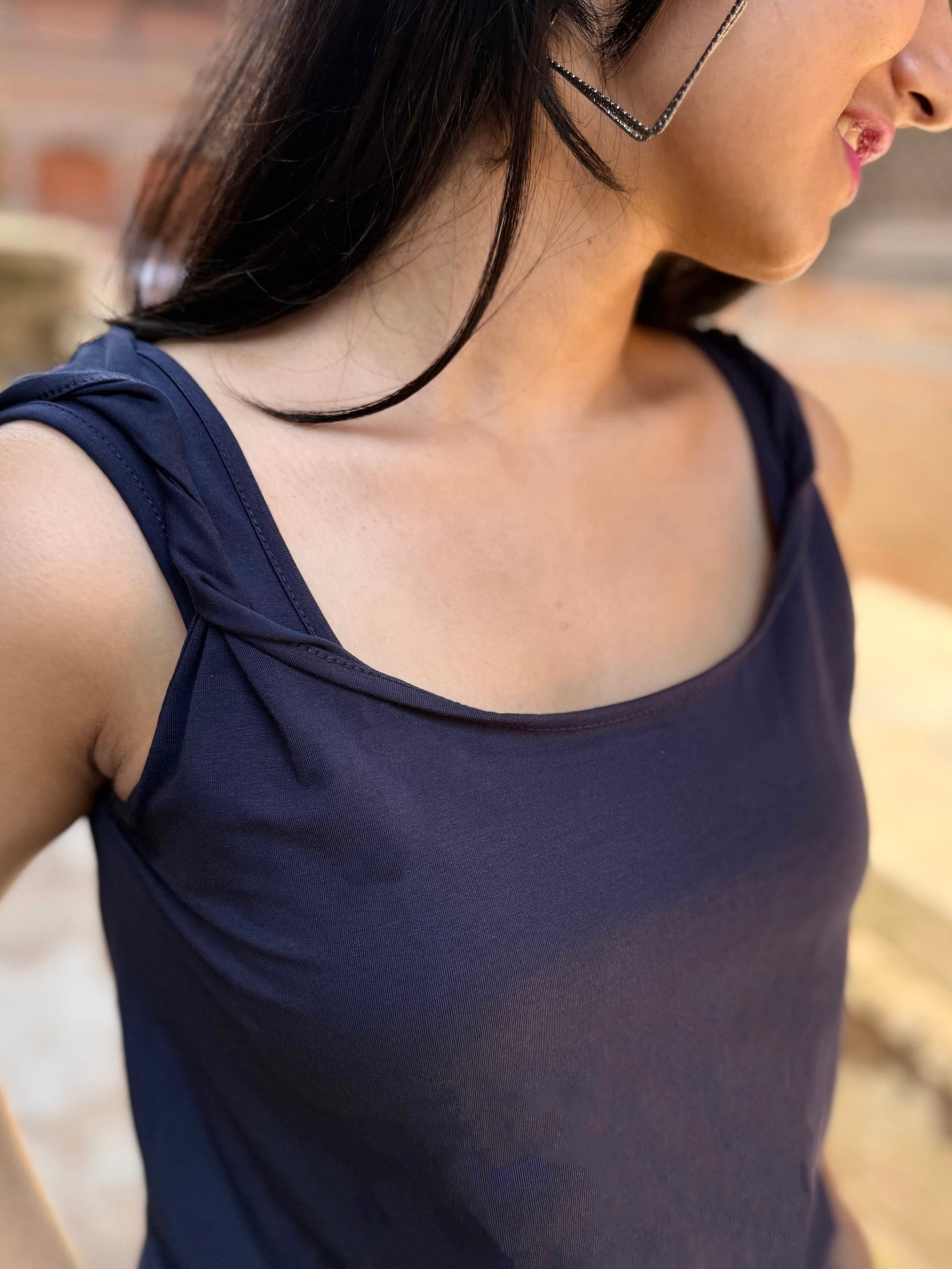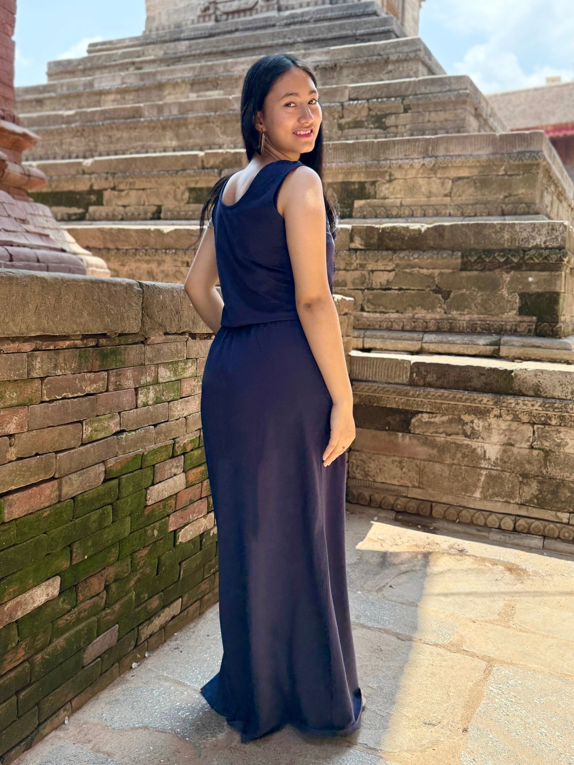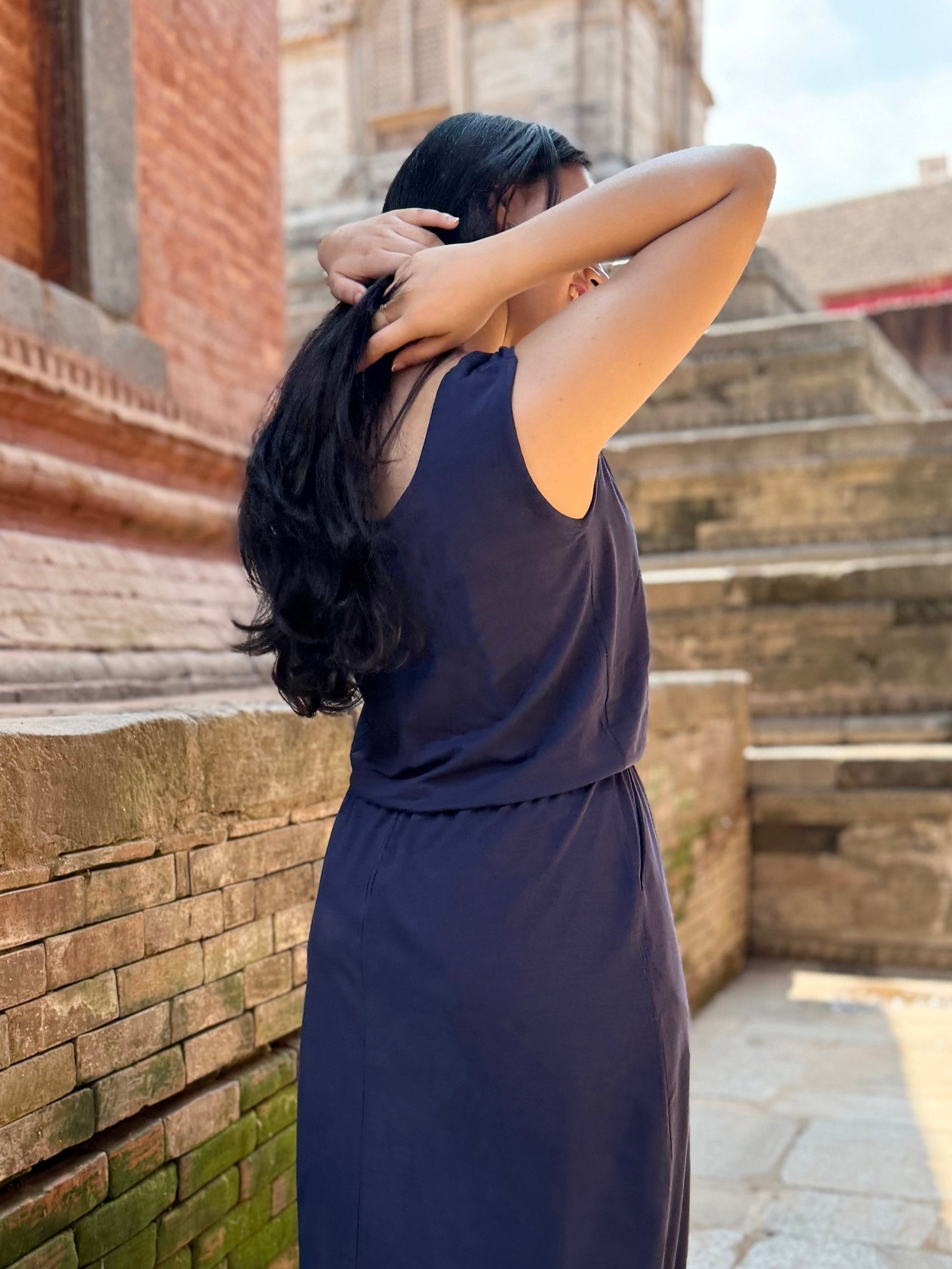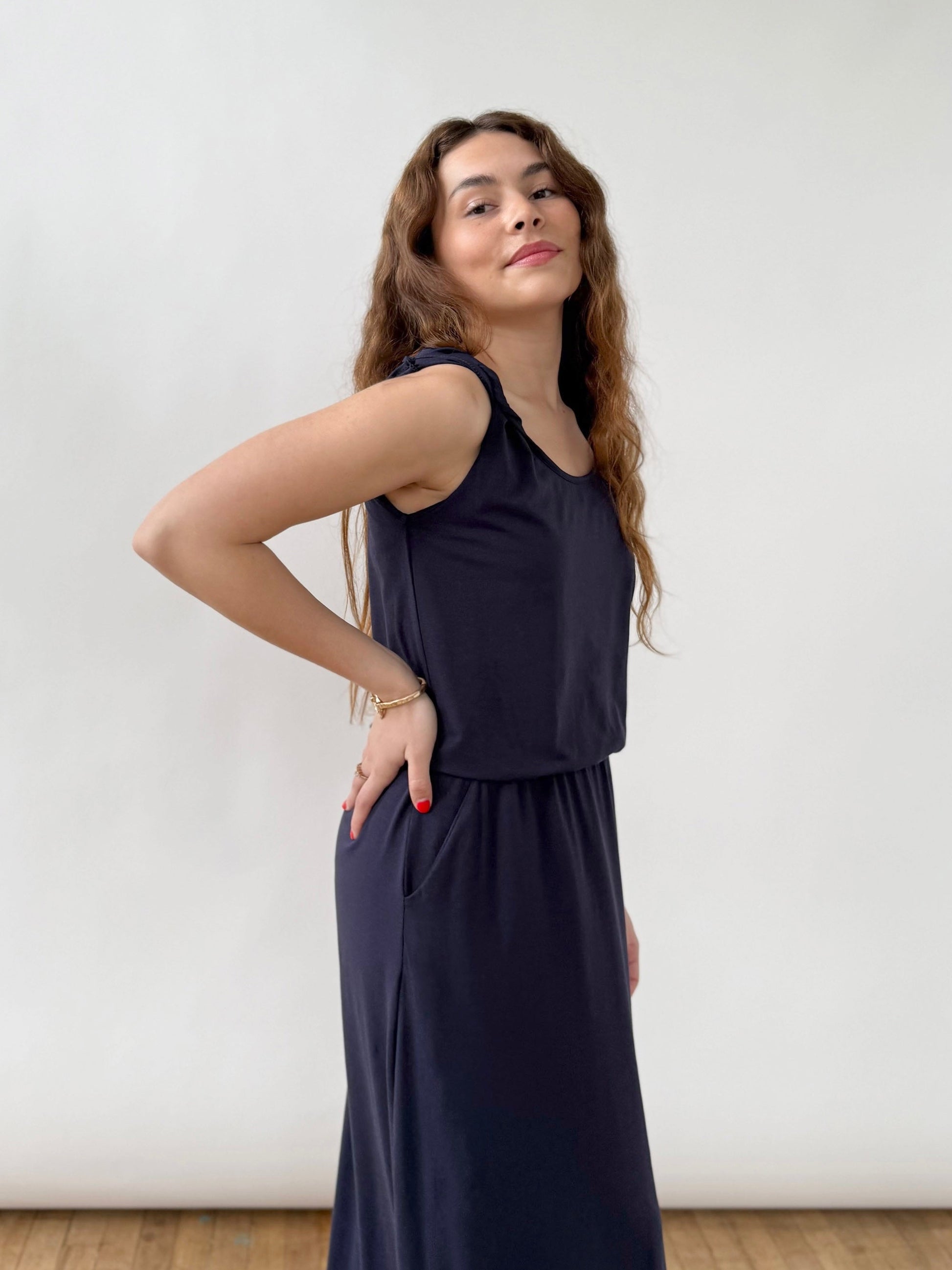 Inspired by the Miranda dress, the Michal dress has a lined bodice to neatly hold the bloussant in place. The twist detail is sewn in and fuss-free, while discreetly placed pockets keep the hips smooth. A 23" slit brings an unexpected touch of elegance and ease of movement.