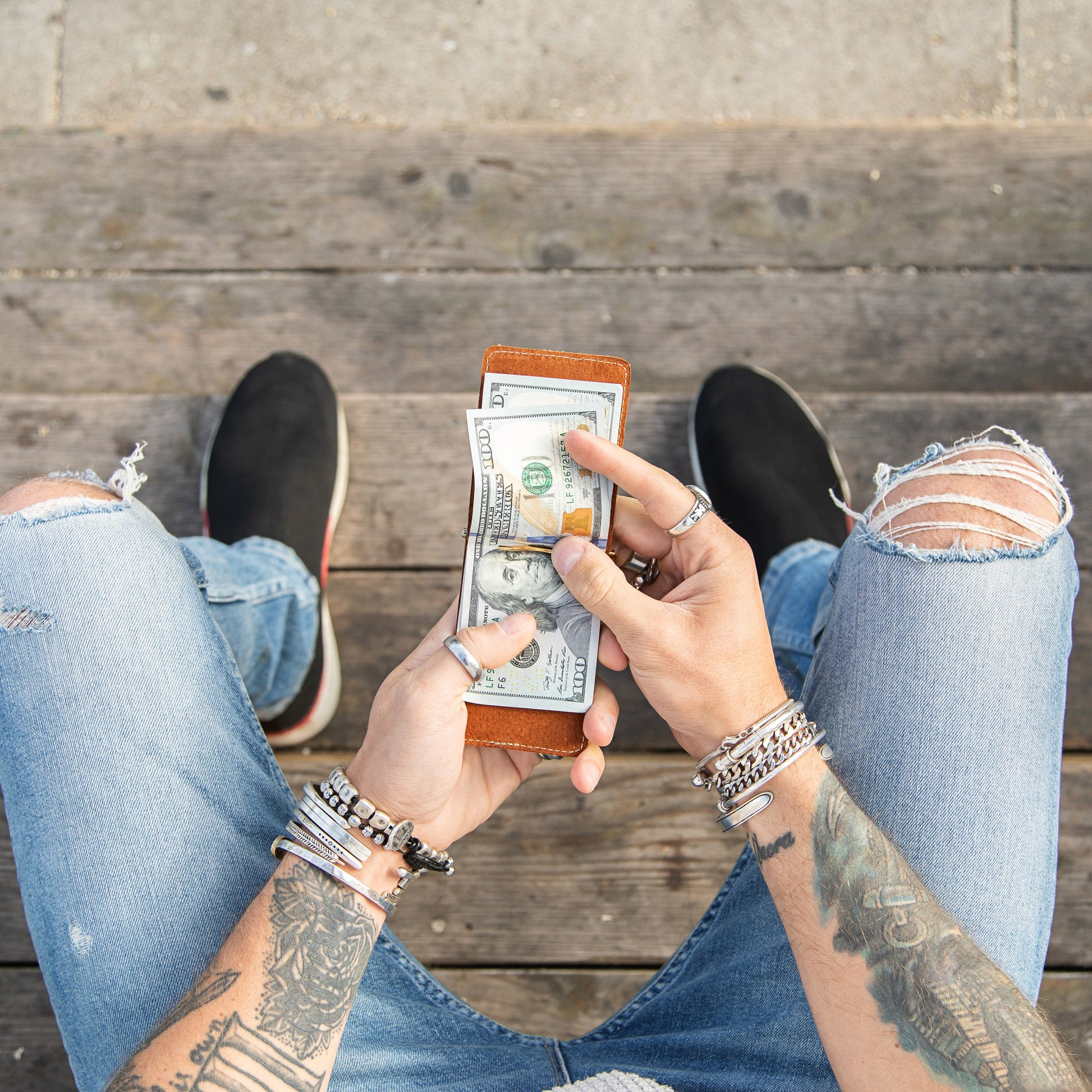 It comes equipped with two external pockets and a money clip for cash in the middle. It is simple, practical and stylish. It is handmade in Los Angeles with naturally dyed leather so it is non toxic and biodegradable.