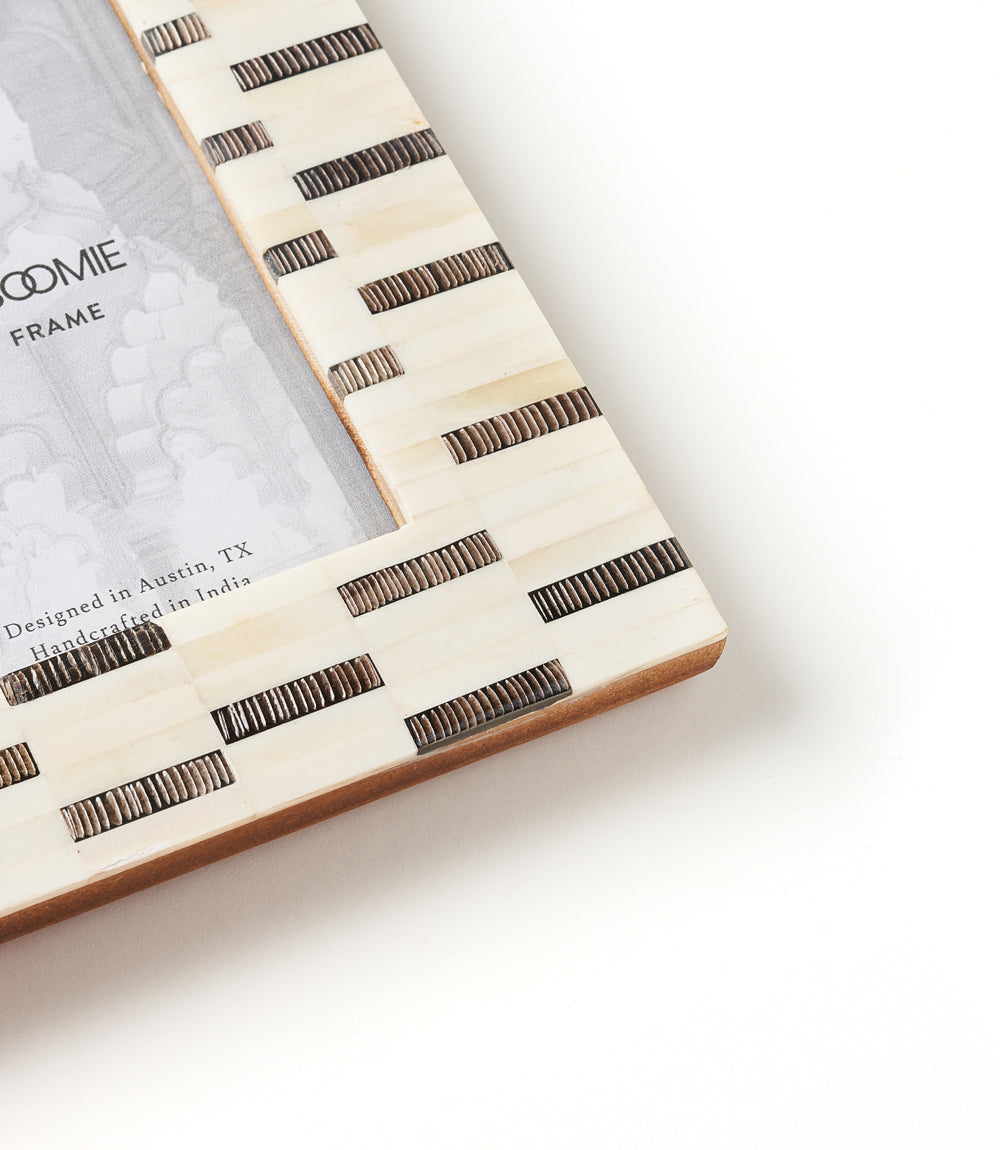Our Mukhendu Collection incorporates traditional Indian art forms of Old Delhi in modern, grounding designs featuring ethically sourced bone tile and gold finish brass accents. This handcrafted photo frame is thoughtfully designed for stylish display with inlaid, black and white bone tile. For convenient display this picture frame features a two-way table top easel and d-ring for hanging.
