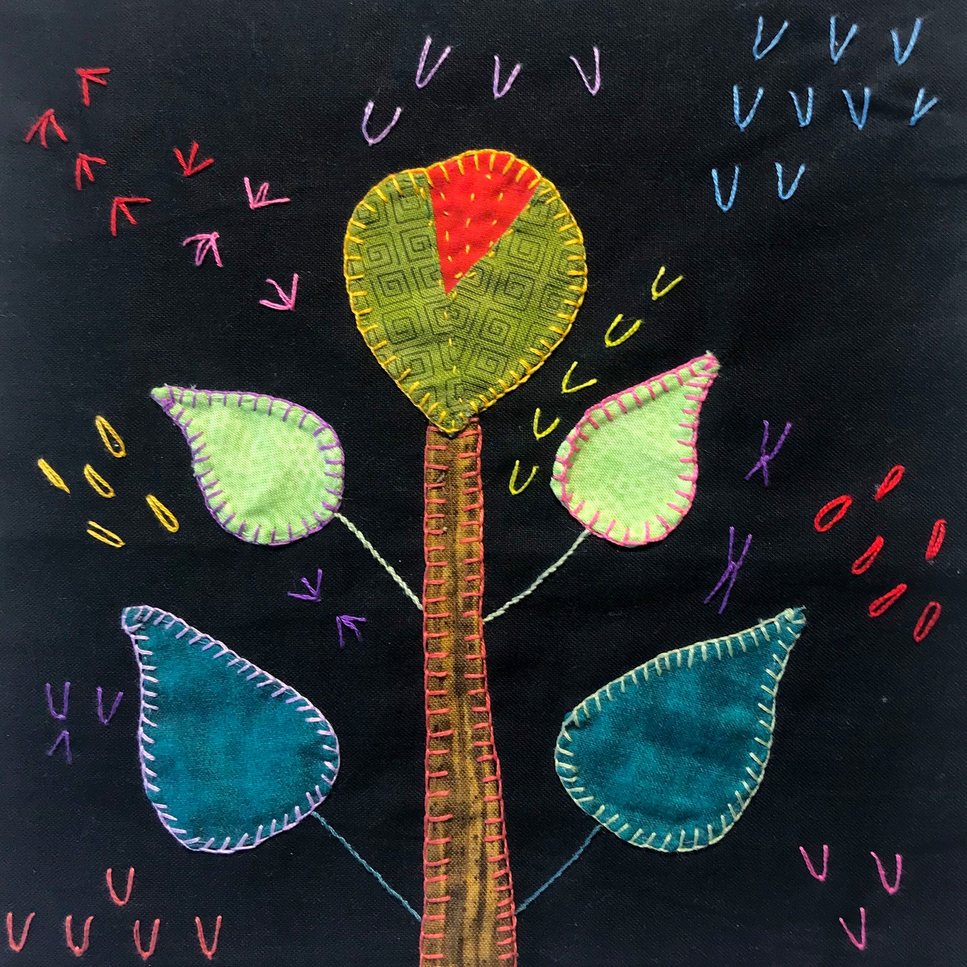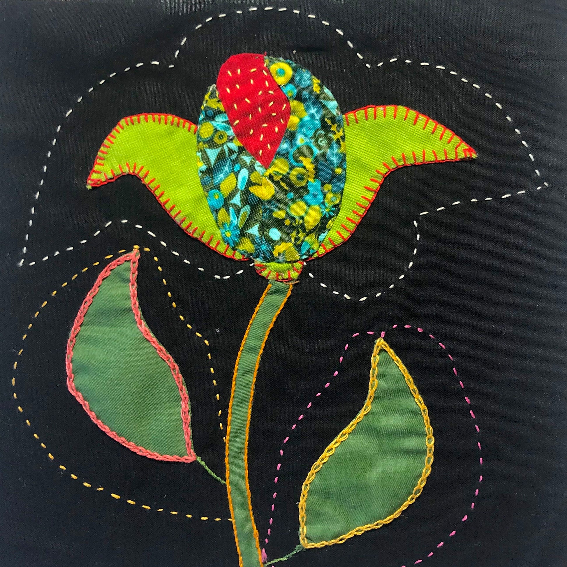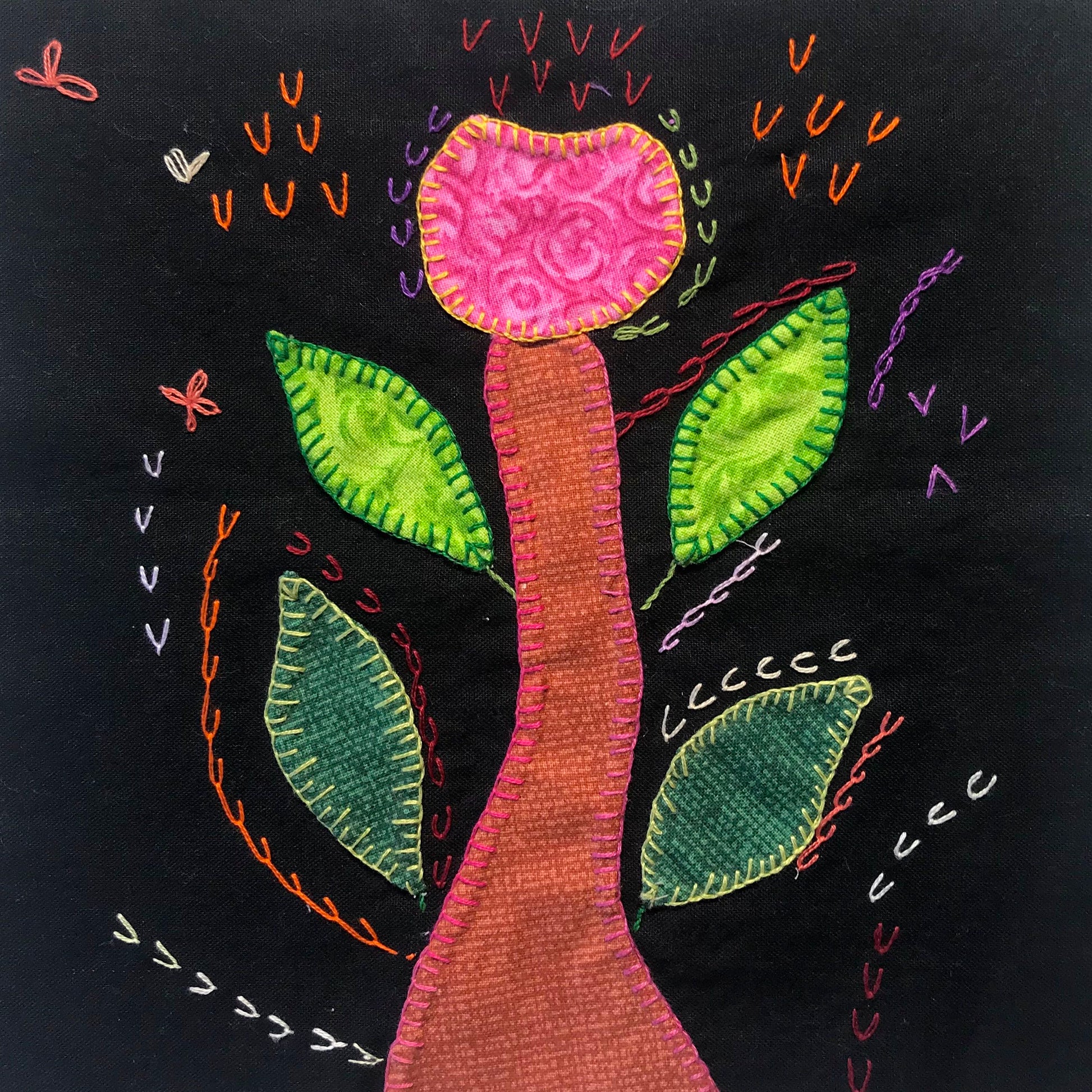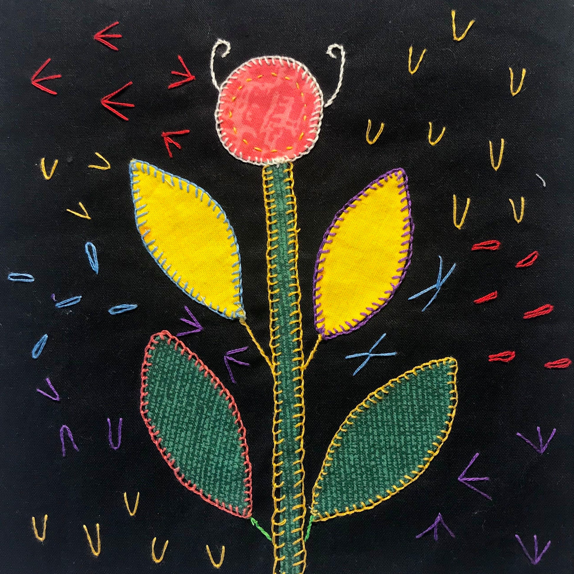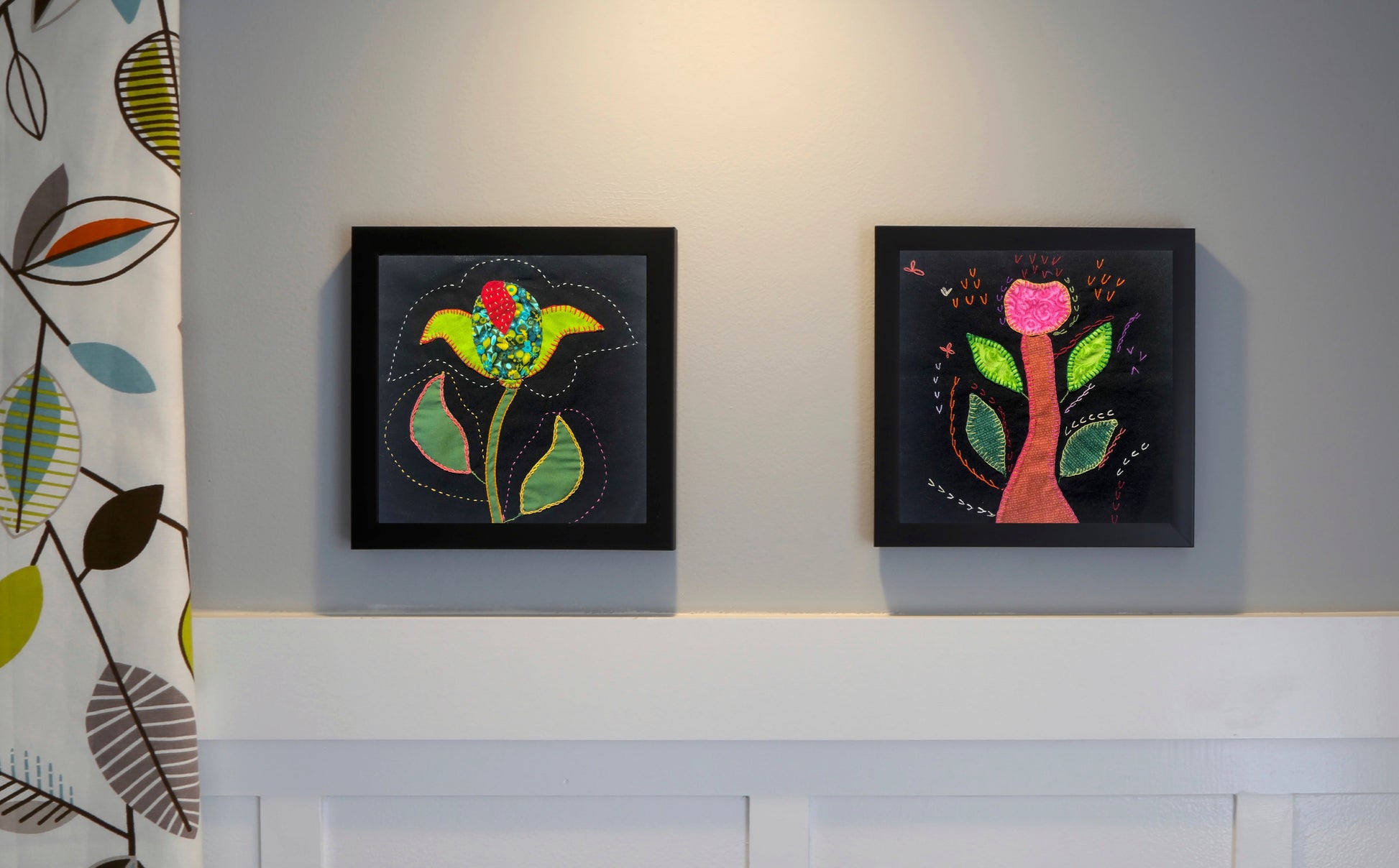 A colorful folk art flower lends charm to any wall, popping on a black background. Four variations available, each set off in a simple black wooden frame. Hand-appliquéd and embroidered on 100% cotton. 8"x8"