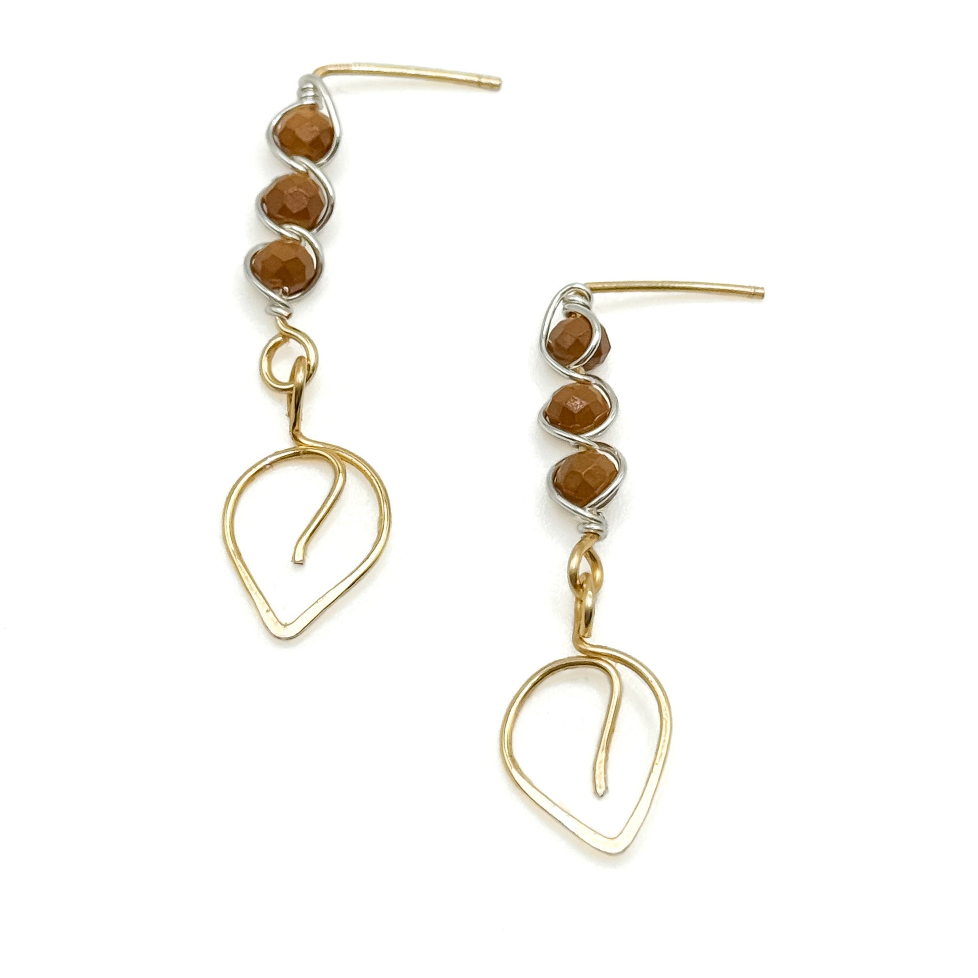 A gold wire post holds 3 faceted brown crystals wire wrapped with silver wire and finished with a hammered gold wire leaf. So playful as a transition piece for fall into winter.