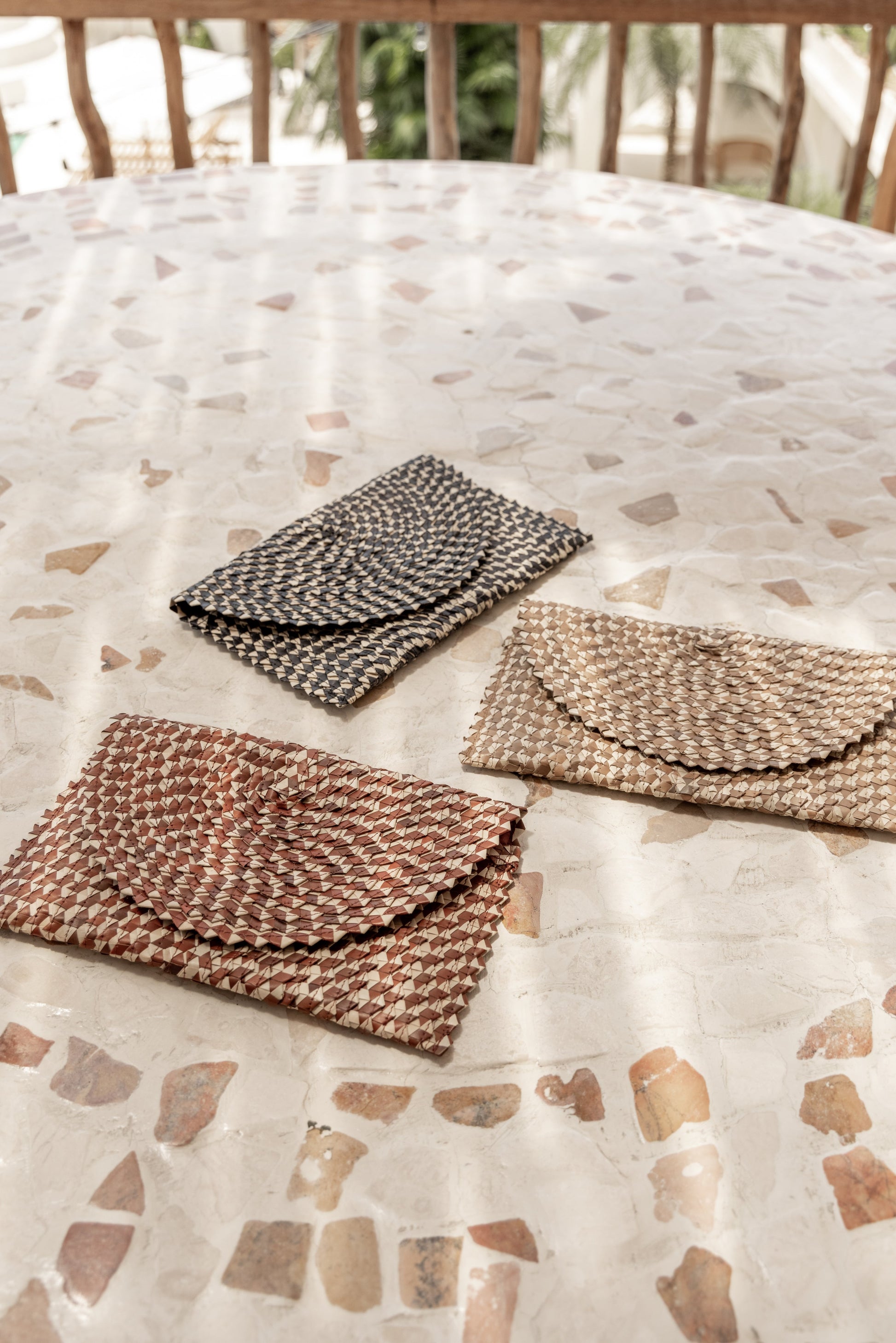 Stylish, sophisticated, and fun, this ombre rattan clutch is the perfect carrier for your daily necessities. The Interior features a soft fabric lining as well as a change pocket. A vintage inspired piece with a modern and playful twist.