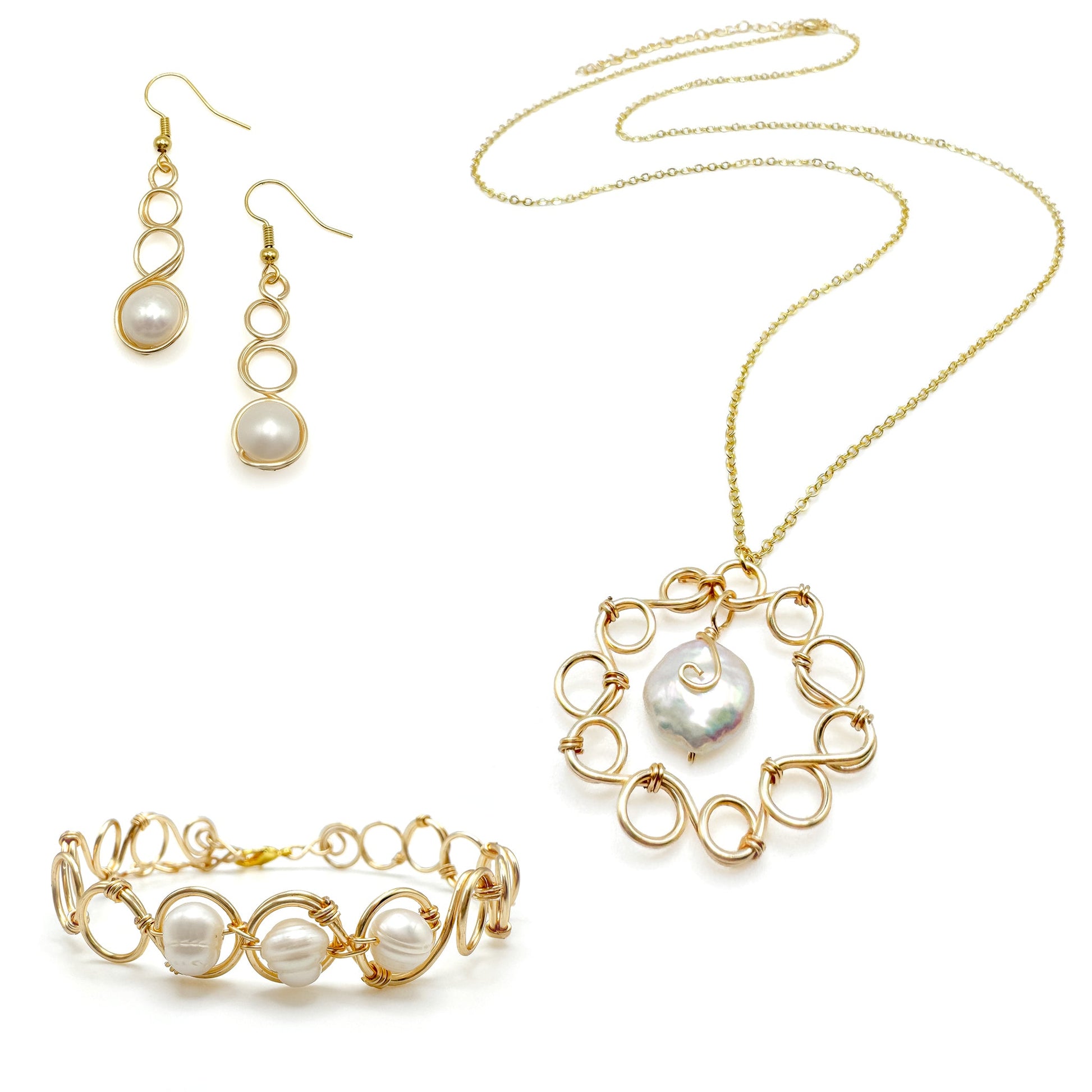 4 graduated circles of gold wire are suspended from a gold plated hypoallergenic fishhook. The final circle holds a 10mm freshwater pearl.