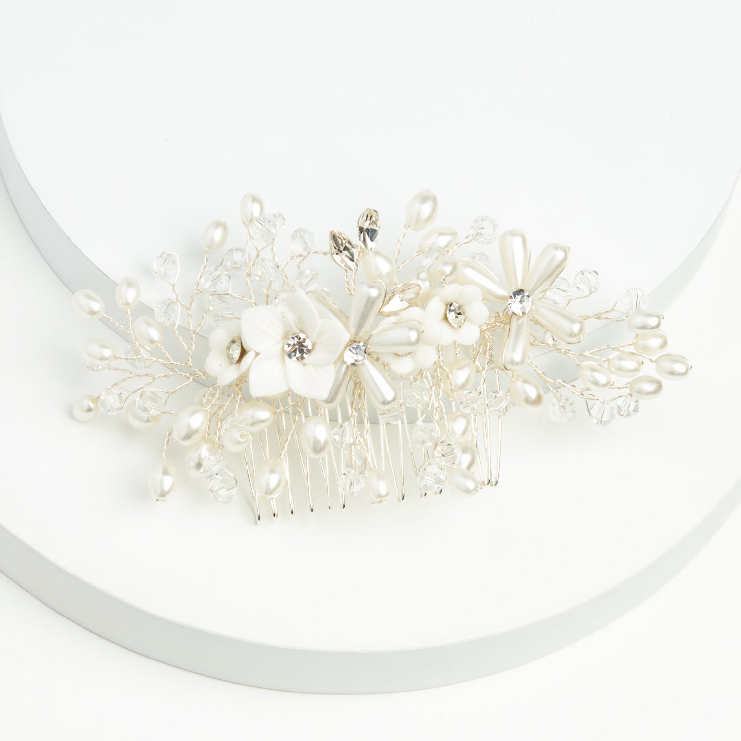 Our Pearl Blossom Dainty Flower and Crystal Comb is a breathtaking and delicate adornment that embodies the timeless beauty of nature. The Pearl Blossom Comb features dainty white flowers delicately stitched to a flexible metal comb providing a high-quality way of attaching to any hairstyle with ease and comfort. Each flower is adorned with shimmering crystals surrounded by luminous pearls, creating a harmonious symphony of radiance and elegance.
