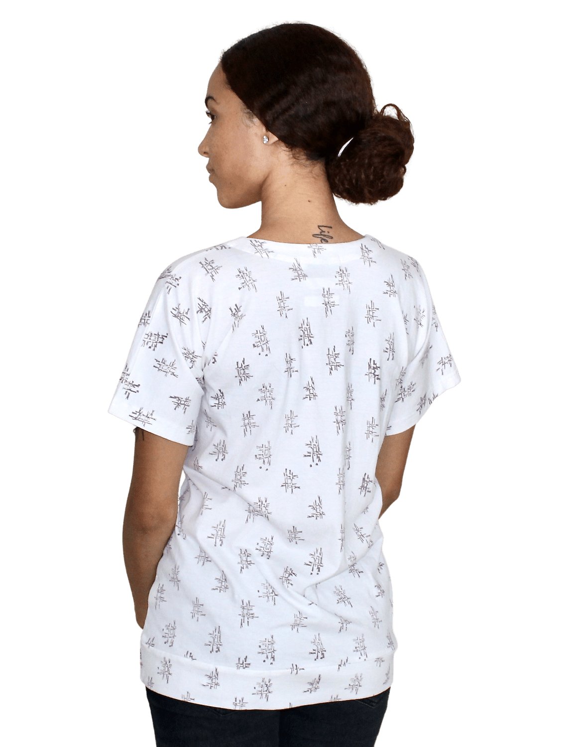 If you’re looking for an all-around great short-sleeved shirt, our Piper Shirt is it! White with a gorgeously detailed yet still minimal mauve print, it’s easy to show off your style with this sophisticated shirt. It features fashionable dolman sleeves, a relaxed fit, and a round neckline. Made of soft, stretchy, organic jersey cotton, this fair trade shirt is an ethical and eco-friendly way to look and feel good.