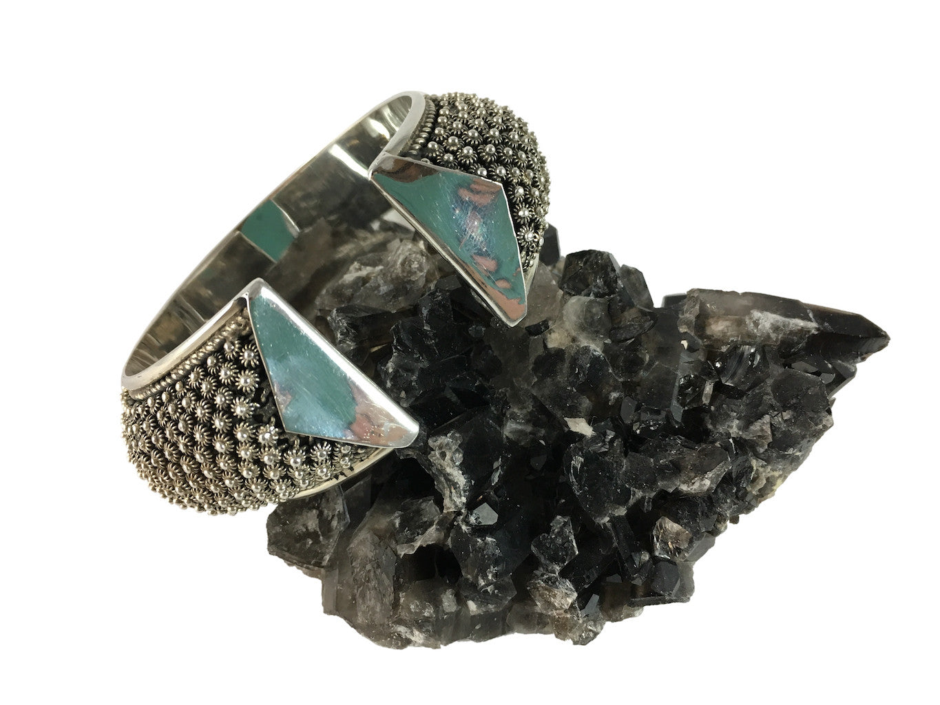 A nice touch with your other jewelry collection. The patterns and styles of this statement piece have been used for generations to adorn the Lao Royal Family and their Court. The dok phikoun flower is stylistically rendered and integrated into each pattern. This cuff is purposely antiqued to heighten the depth and style of the dok phikoun. Highlighting this magical flower, as it dramatically shows off the beautiful intricacy of the silversmith work.