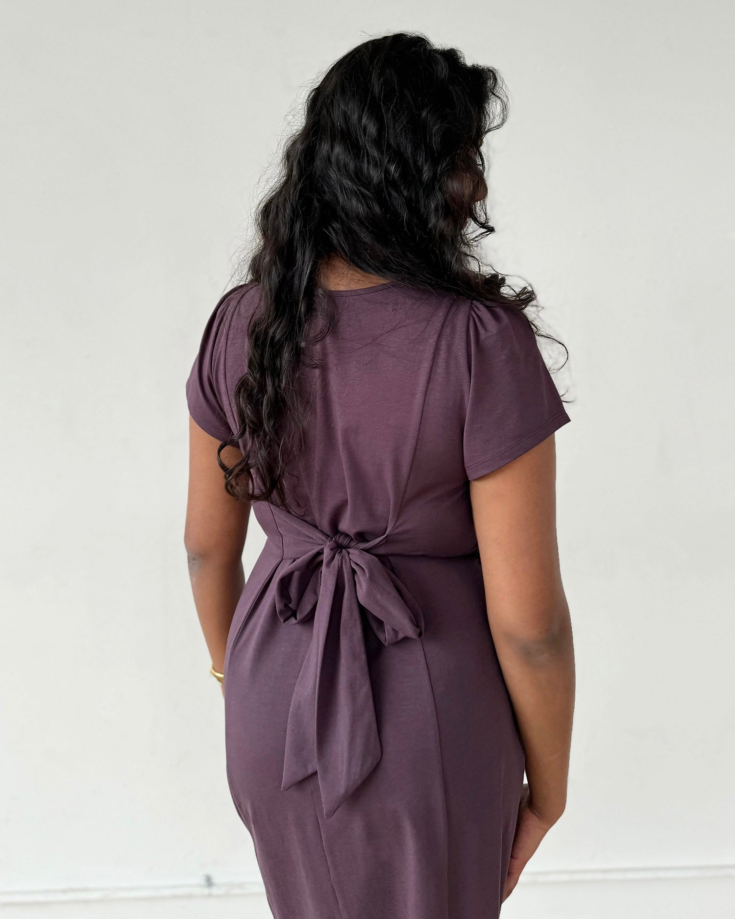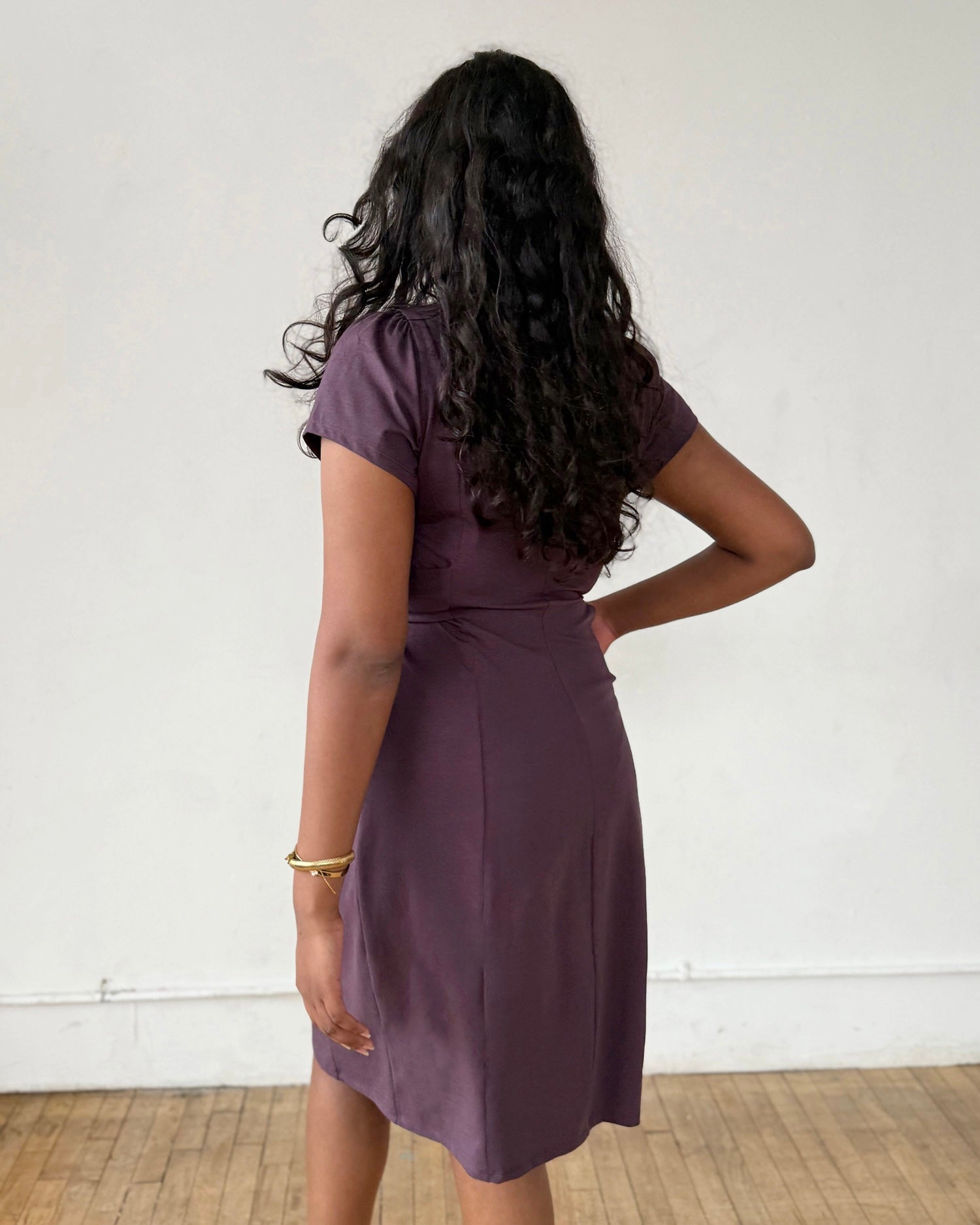 This purple color is a neutral-warm purple that is slightly faded and soft.