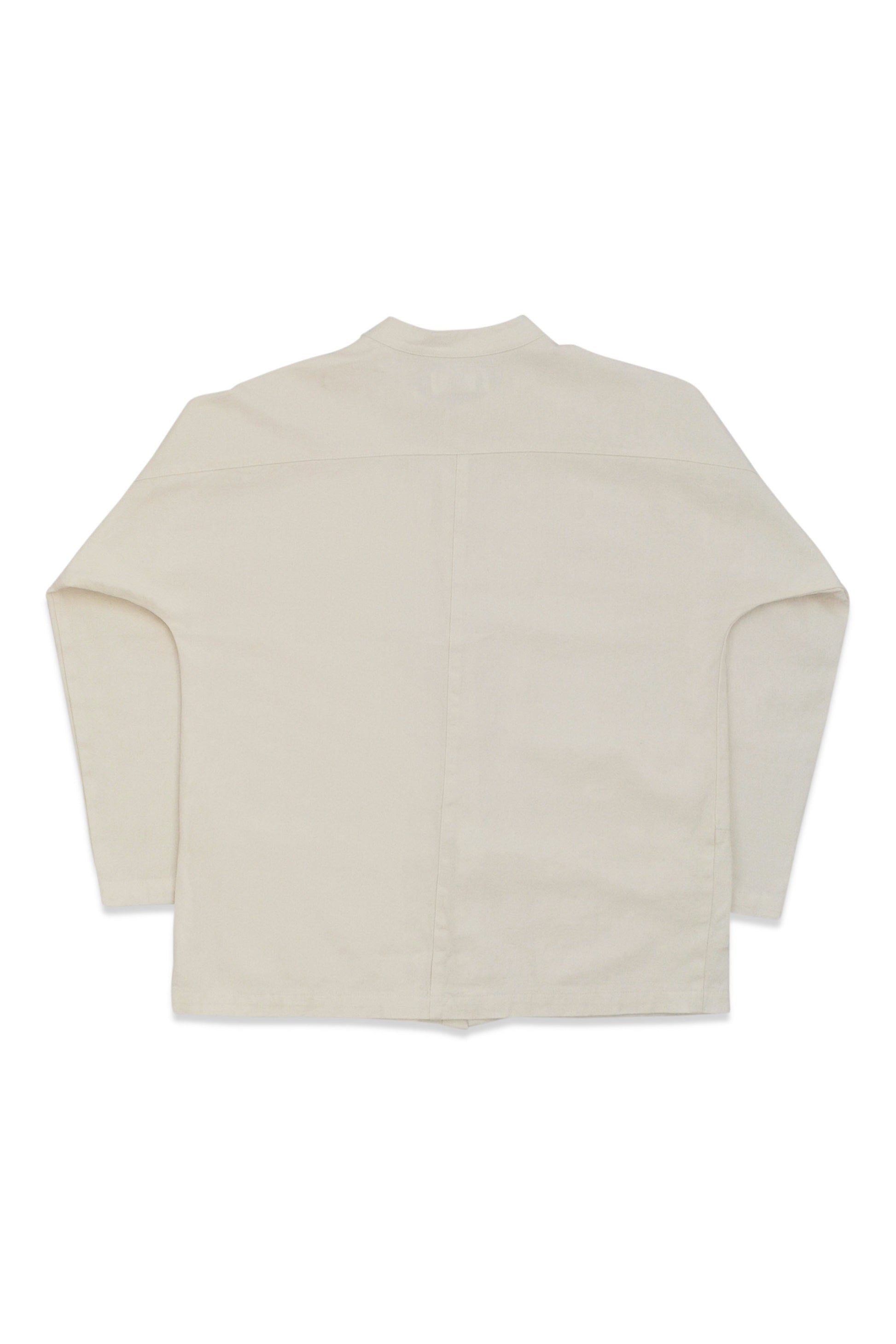 Unisex hemp cotton canvas, dolman-shoulder chore coat with a mandarin collar and waist pockets.
