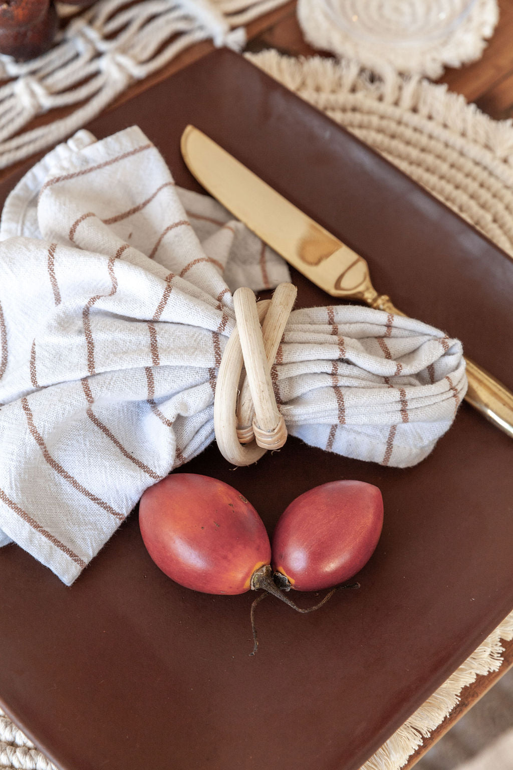 Handcrafted from locally sourced and sustainable rattan, this napkin ring brings an earthy and natural element to your tablescape. Our interlocking rattan ring design brings a complexity to your table setting while remaining minimal in form. Sold in a set of four.