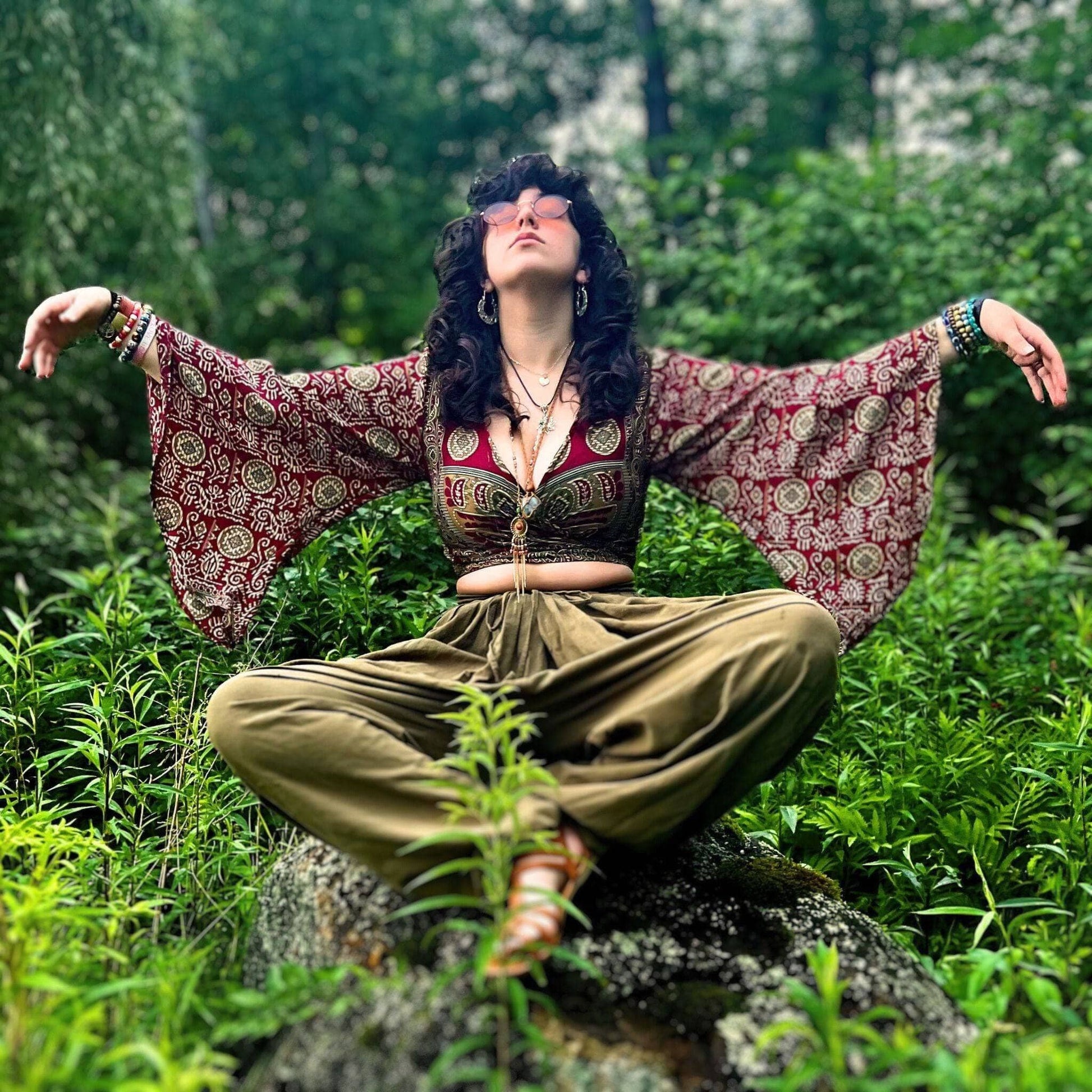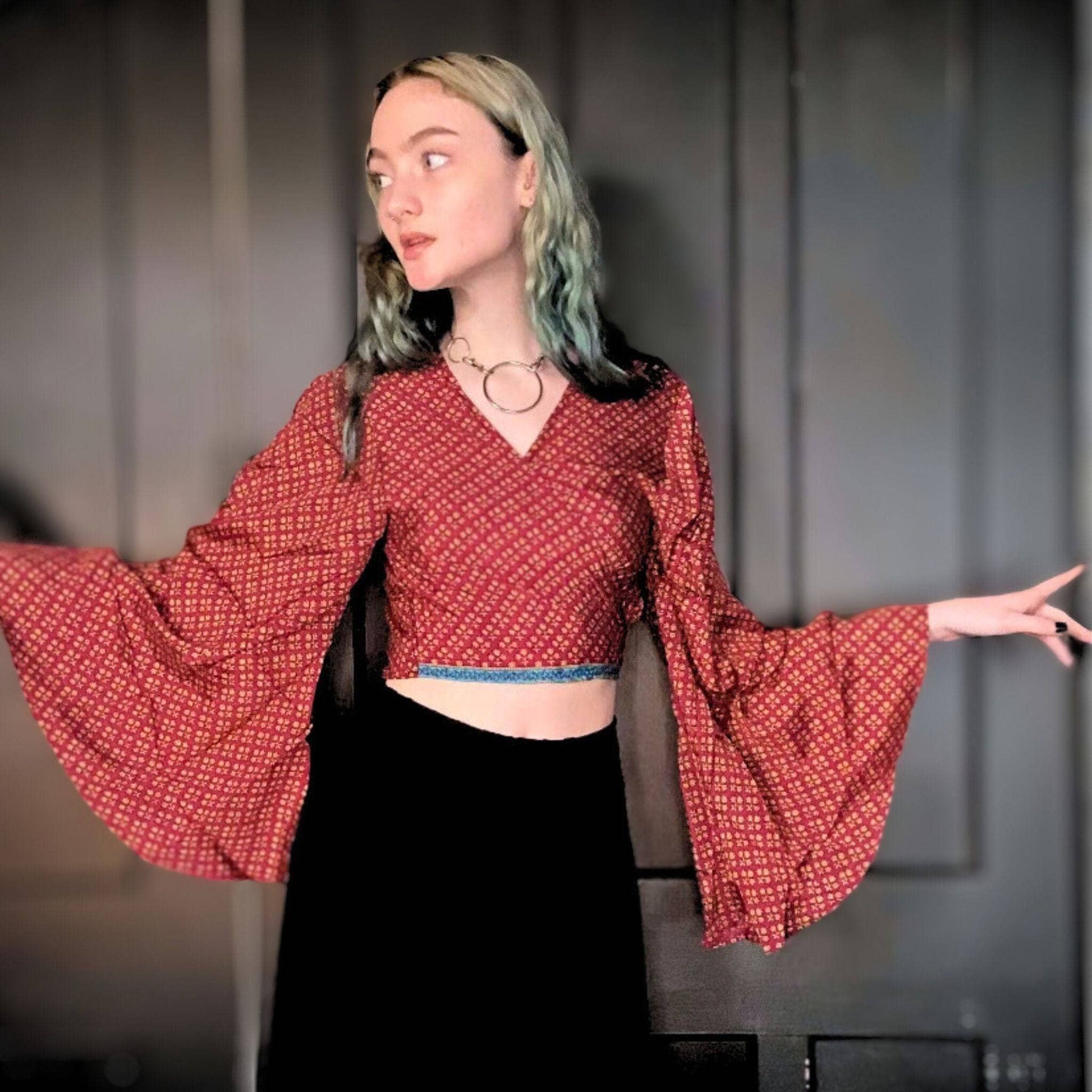 Introducing our Bell Sleeve Top, expertly crafted from recycled sari material for a stylish and sustainable wardrobe addition. Each top is a one-of-a-kind masterpiece, ensuring that your fashion statement is as unique as you are.