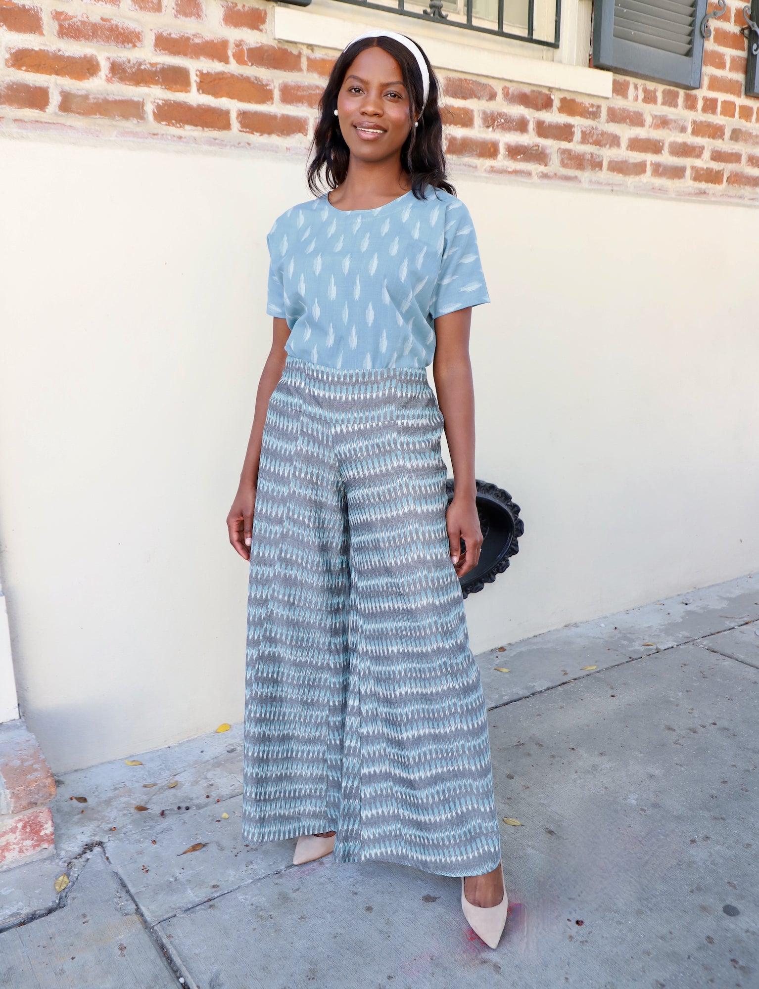 Wide leg pants are IN! Take the plunge with our Shaila Pants in a blue, white and gray handwoven ikat fabric. The flat front waistband and elastic back waistband ensure comfort and the most flattering shape. These wide leg pants are curve friendly and flattering for those with fuller thighs, hips or bottoms.