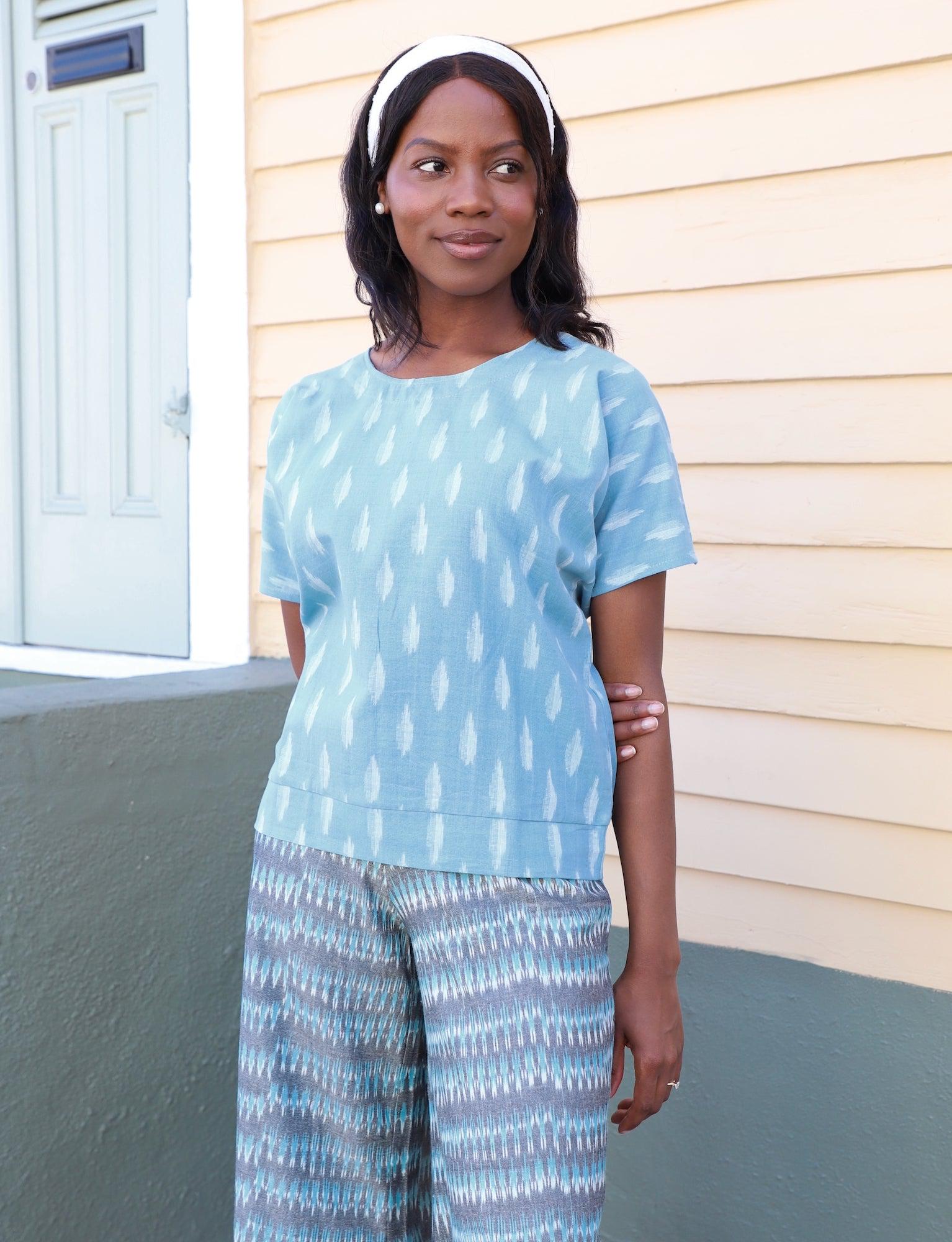 This dreamy blue top has us ready for summer days! Ikat weaving and cool colors make the Skyline Top one of our favorites for work or play.